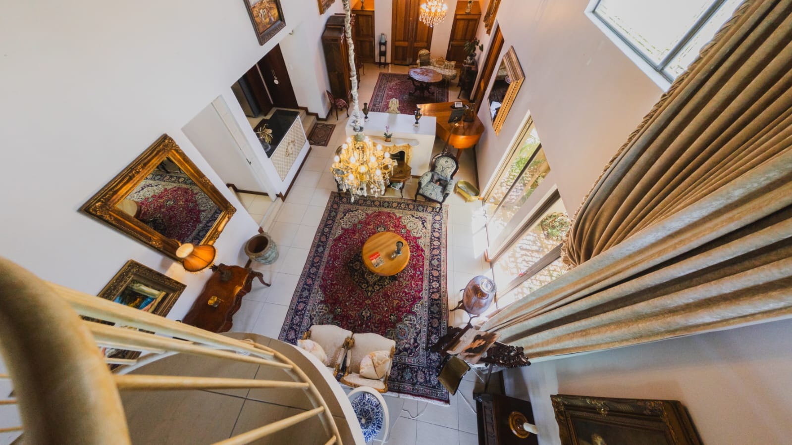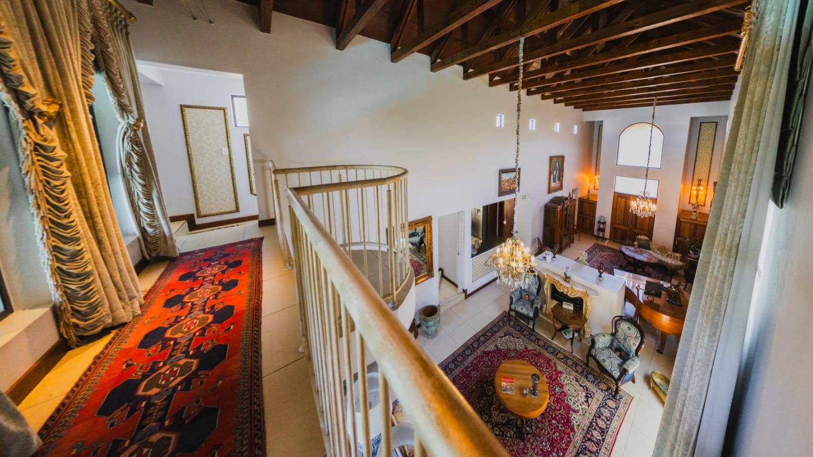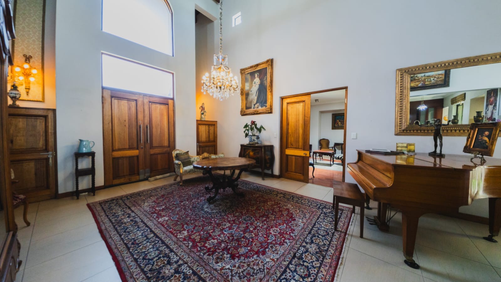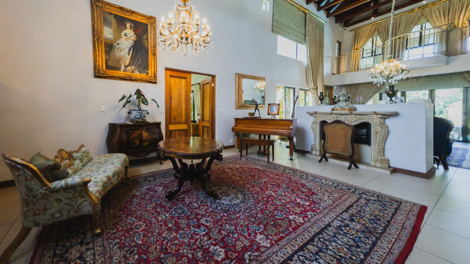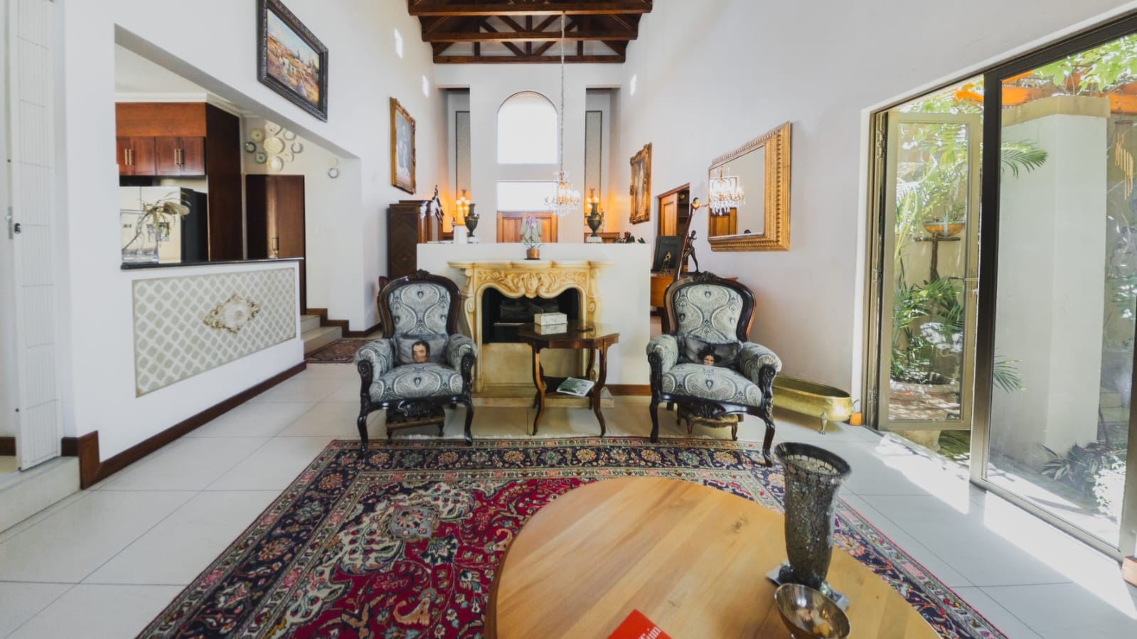Grand double doors welcome you into a breathtaking double-volume entrance, where exposed beams and a striking central fireplace create a dramatic yet inviting focal point. Light pours into the vast open spaces, immediately setting the tone for elegant yet comfortable living.