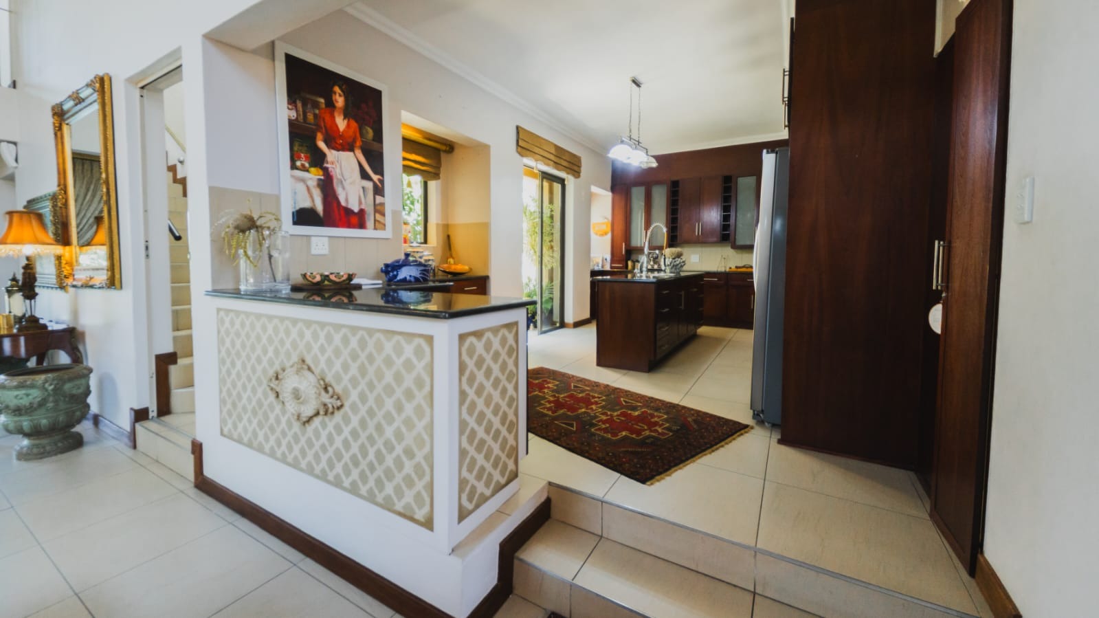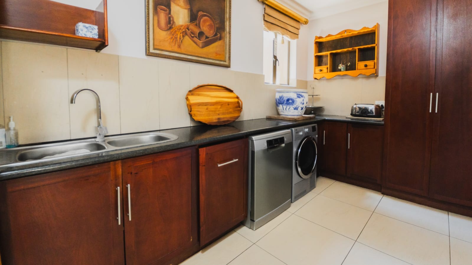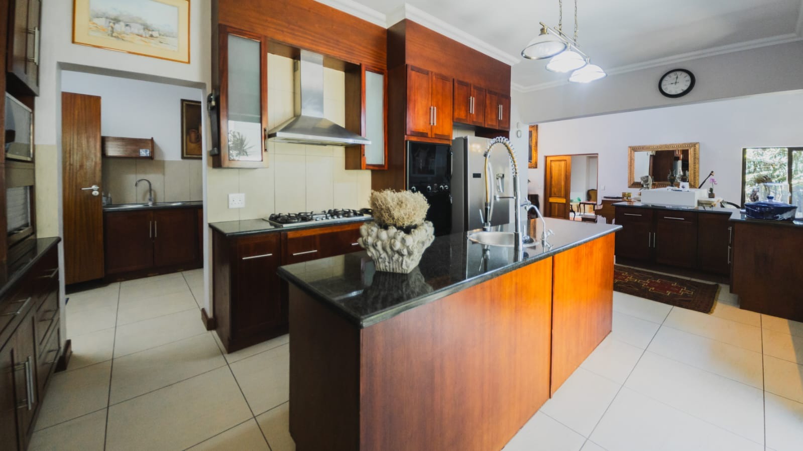 The solid wood kitchen forms the true heart of the home. Appointed with granite countertops, a gas stove, walk-in pantry, and separate scullery, it offers both beauty and practicality. Doors open to a charming courtyard, while the open-plan design ensures you remain connected to family and guests.
