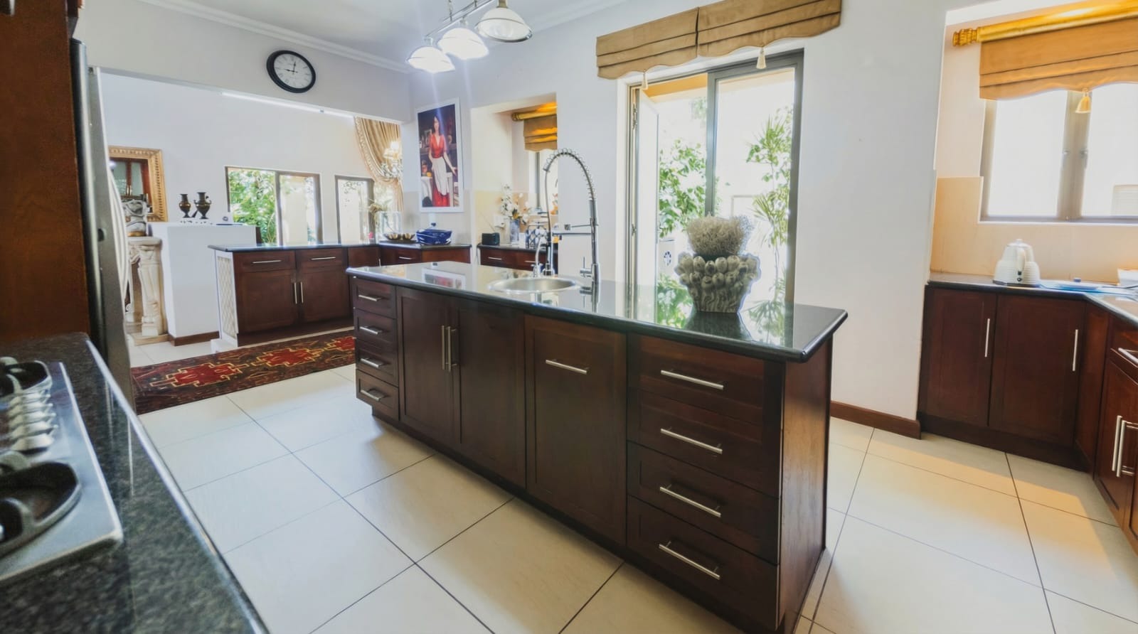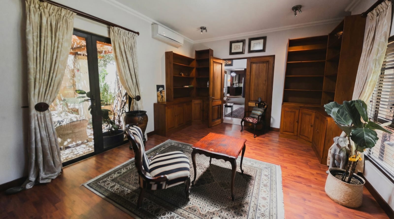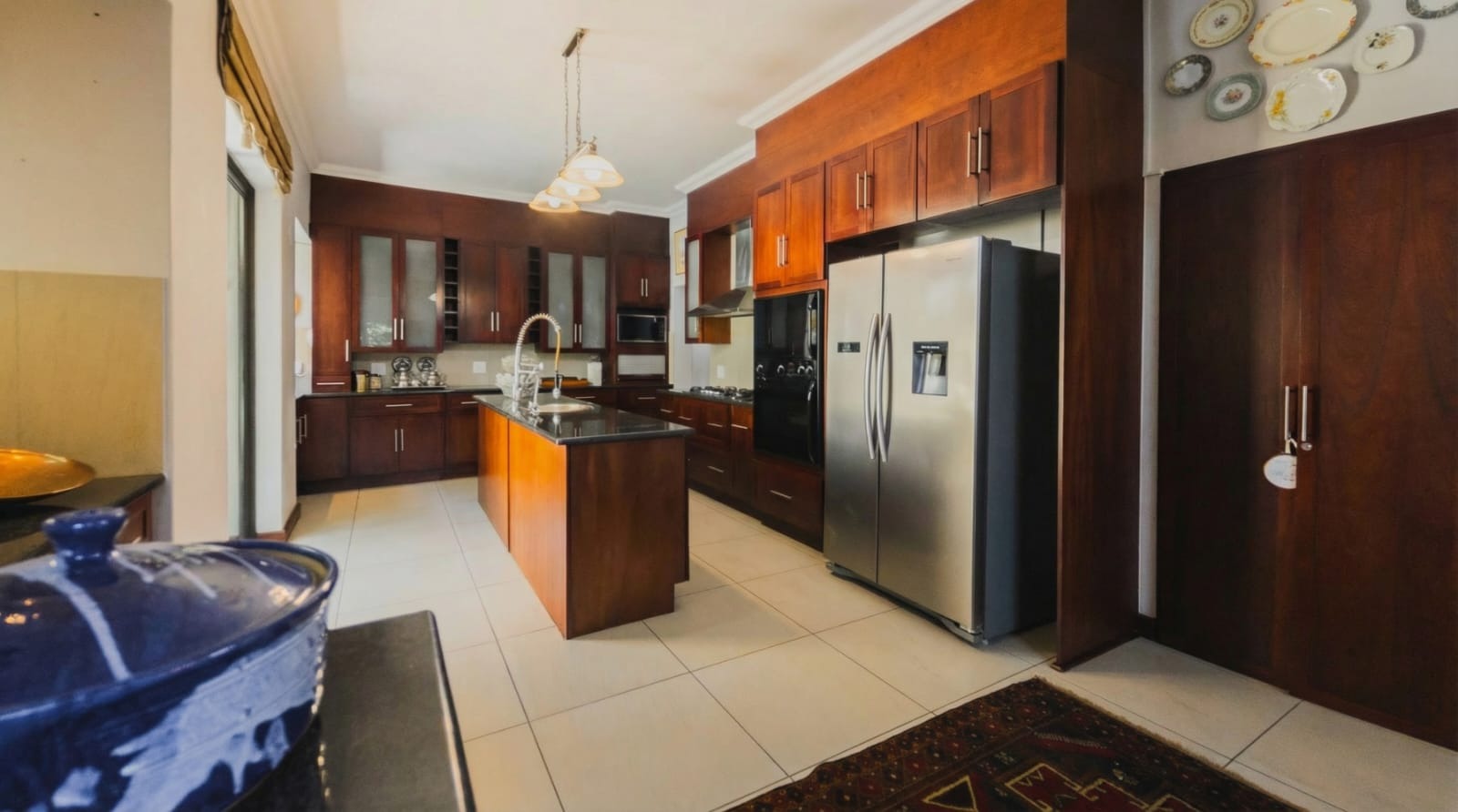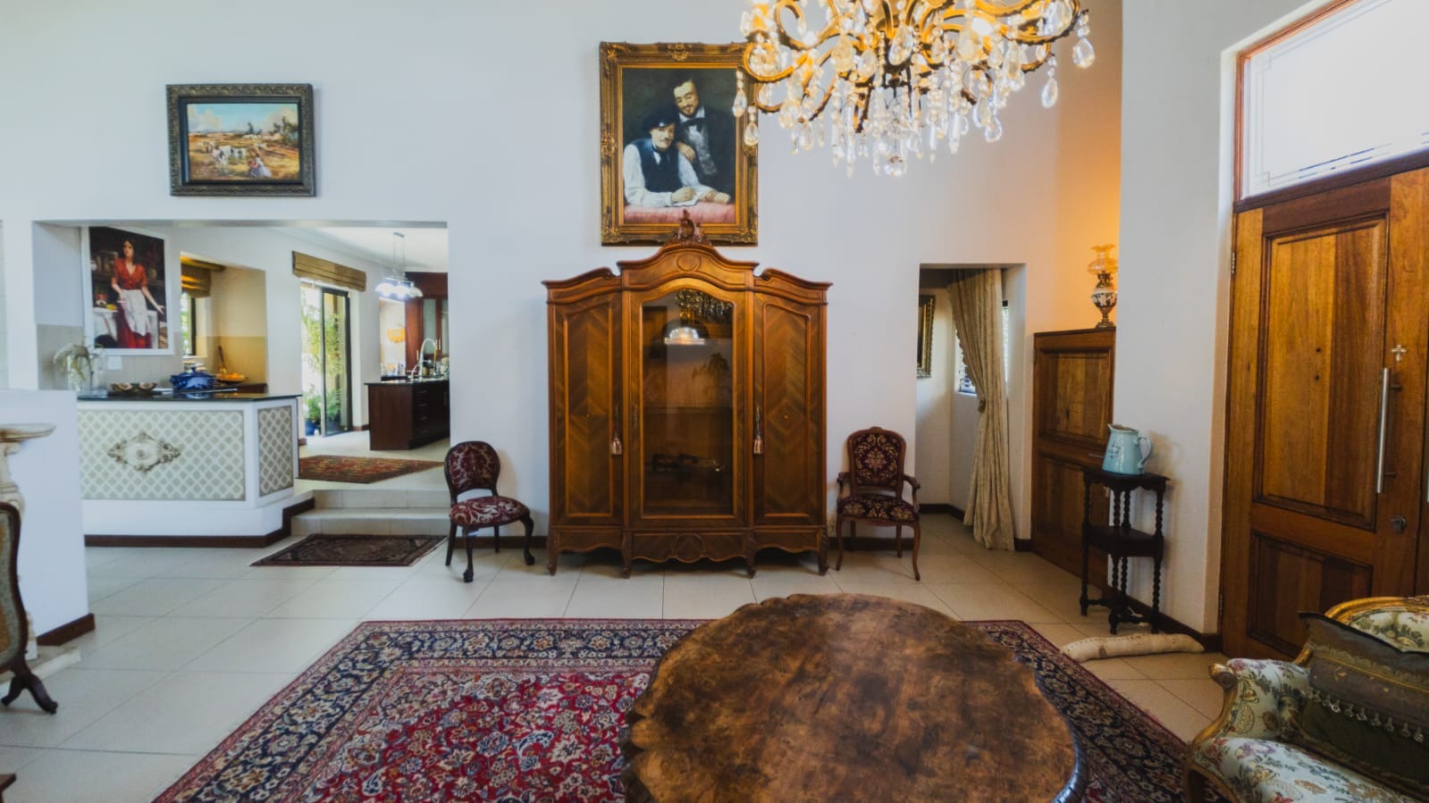 The solid wood kitchen forms the true heart of the home. Appointed with granite countertops, a gas stove, walk-in pantry, and separate scullery, it offers both beauty and practicality. Doors open to a charming courtyard, while the open-plan design ensures you remain connected to family and guests.