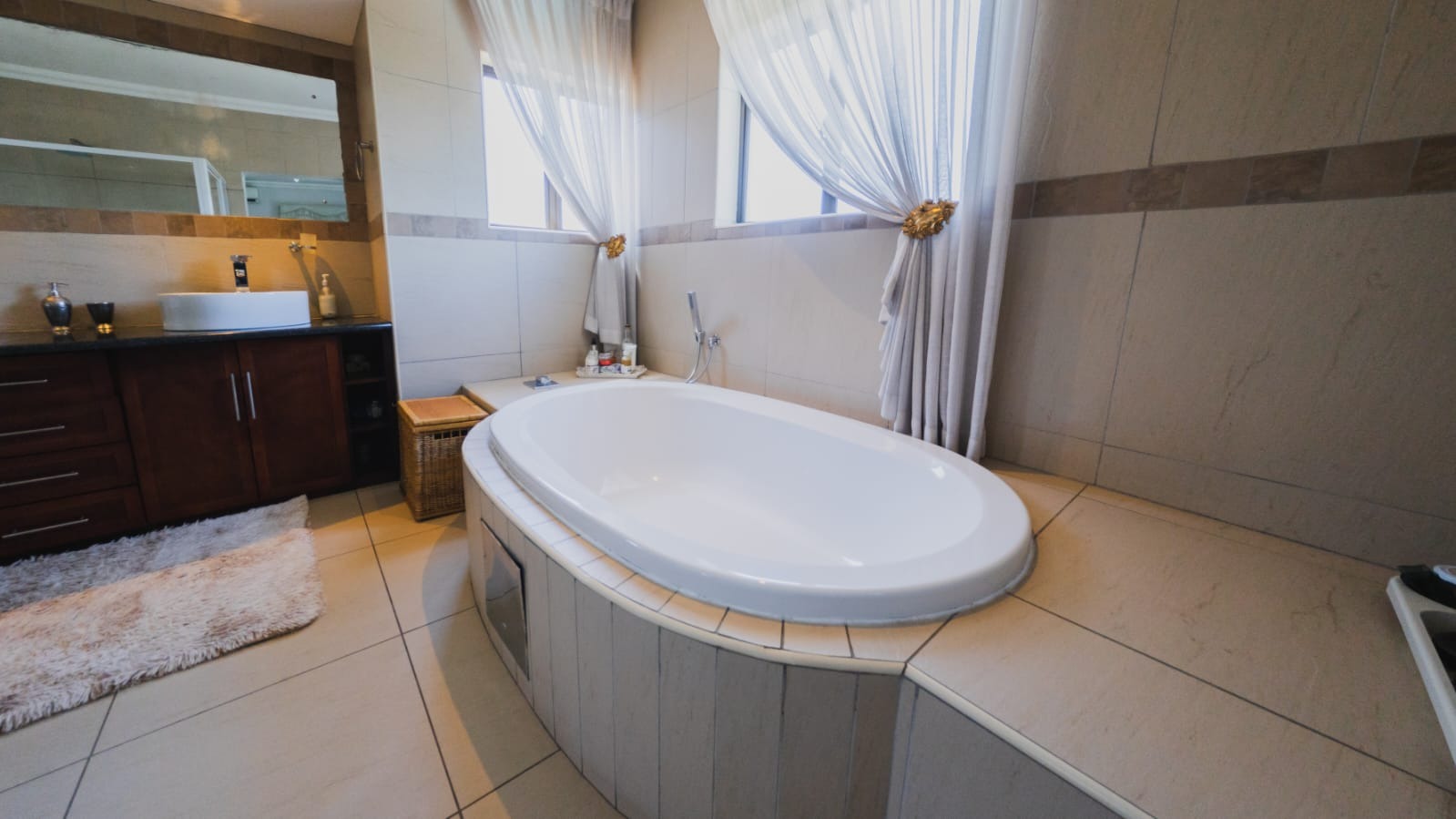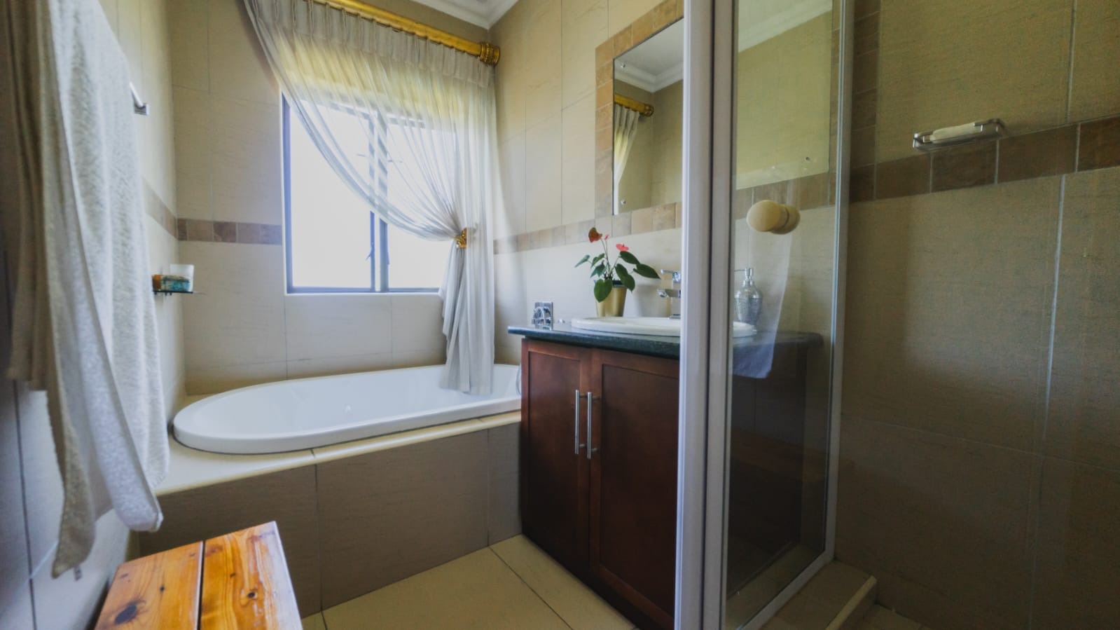 The luxurious master suite enjoys sweeping greenbelt views, spacious open-plan walk-in cupboards, and a large full bathroom designed for indulgence. The opposite wing offers two well-sized bedrooms with built-in cupboards, sharing a stylish modern bathroom. In total, the home offers 3.5 beautifully appointed bathrooms.