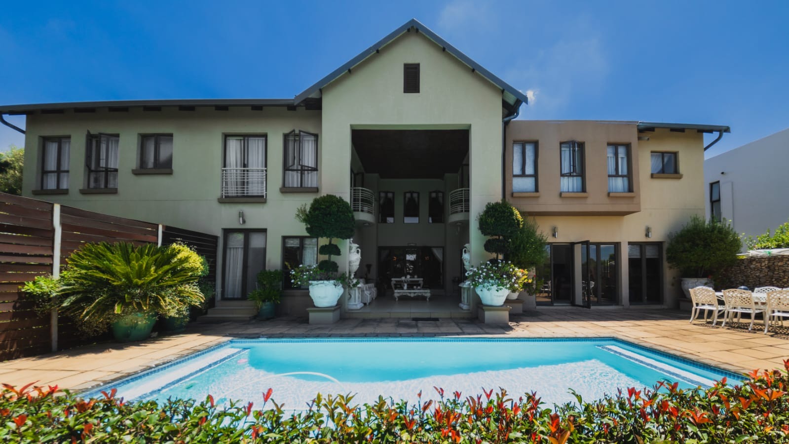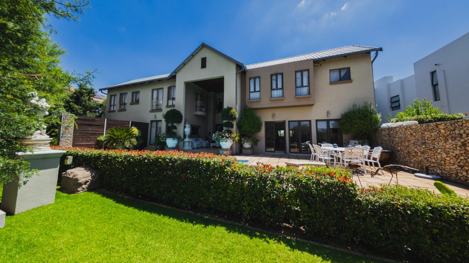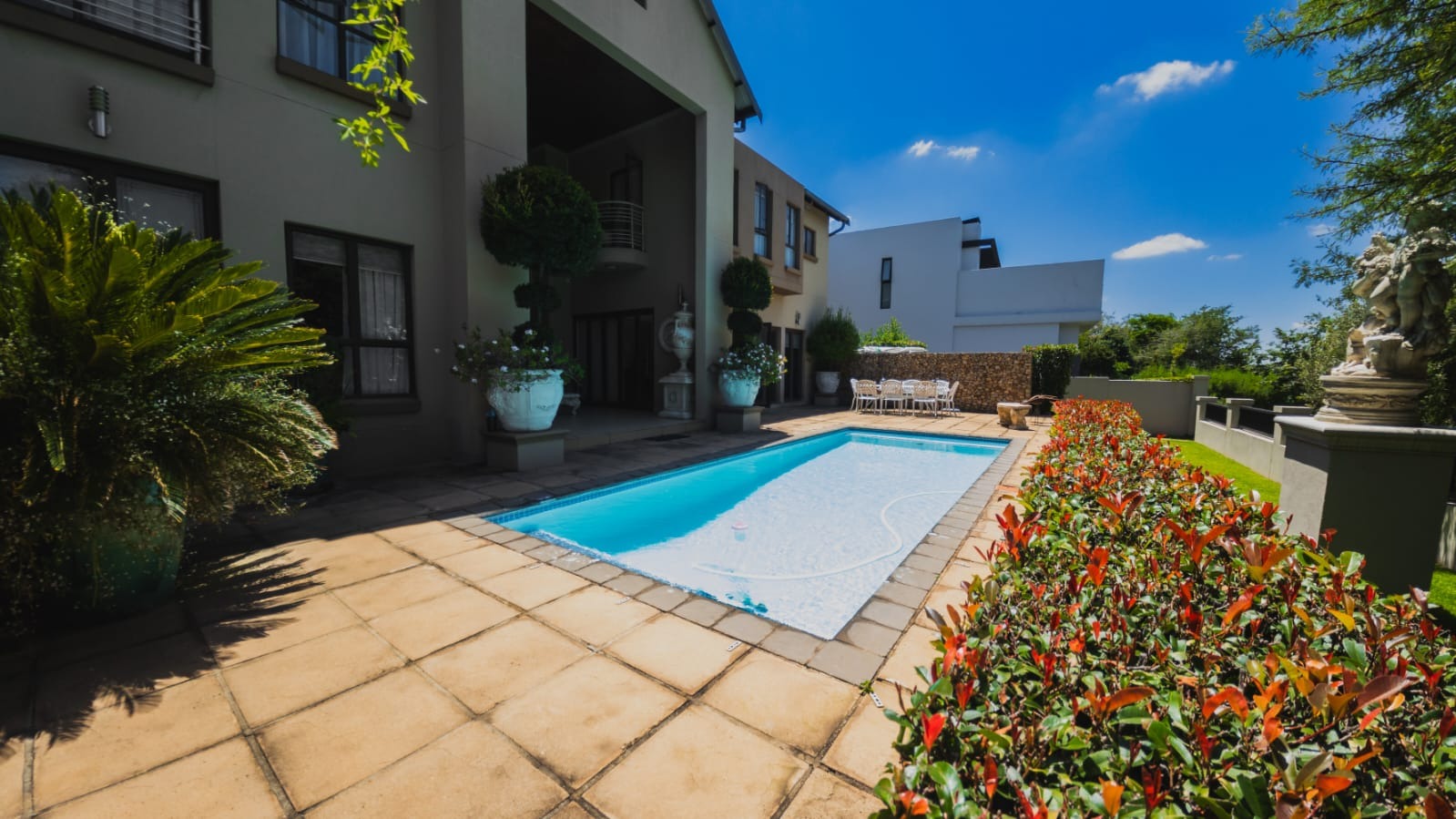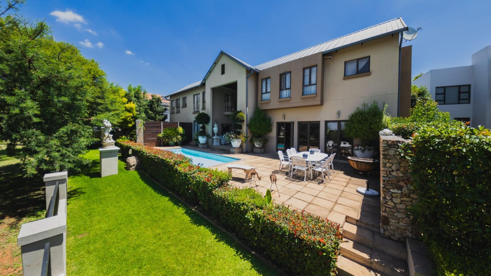 Designed for both relaxed family living and effortless entertaining, the home features three expansive open-plan living areas. A generous family and entertainment room flows into an impressive indoor braai room spacious enough to accommodate both lounge and dining suites. Stacking doors open effortlessly onto a beautifully landscaped, irrigated garden and private lap pool, creating the perfect setting for lively gatherings or peaceful evenings under the stars.
