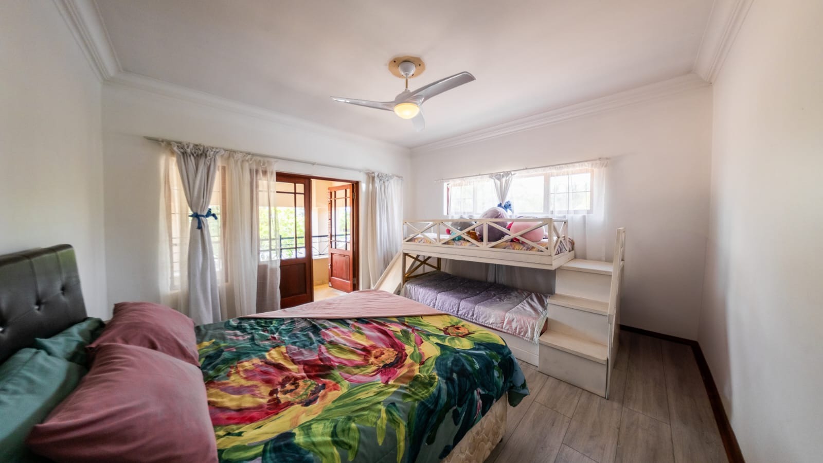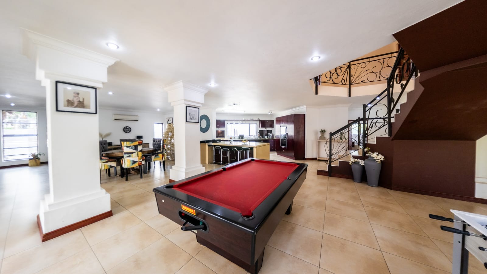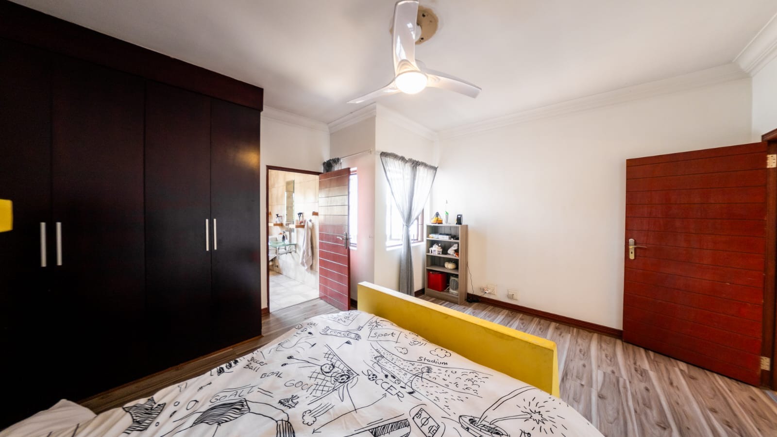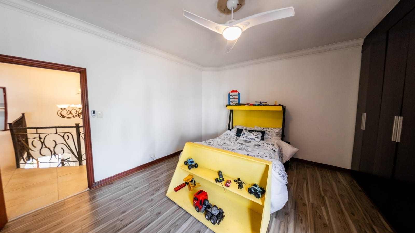 A majestic central staircase anchors the home and leads to five spacious bedrooms upstairs. The main suite is an elegant retreat, large enough for a full lounge set, a sanctuary for parents to unwind in privacy. The remaining four bedrooms are equally generous, with two sharing a modern full bathroom, making it ideal for children or guests.