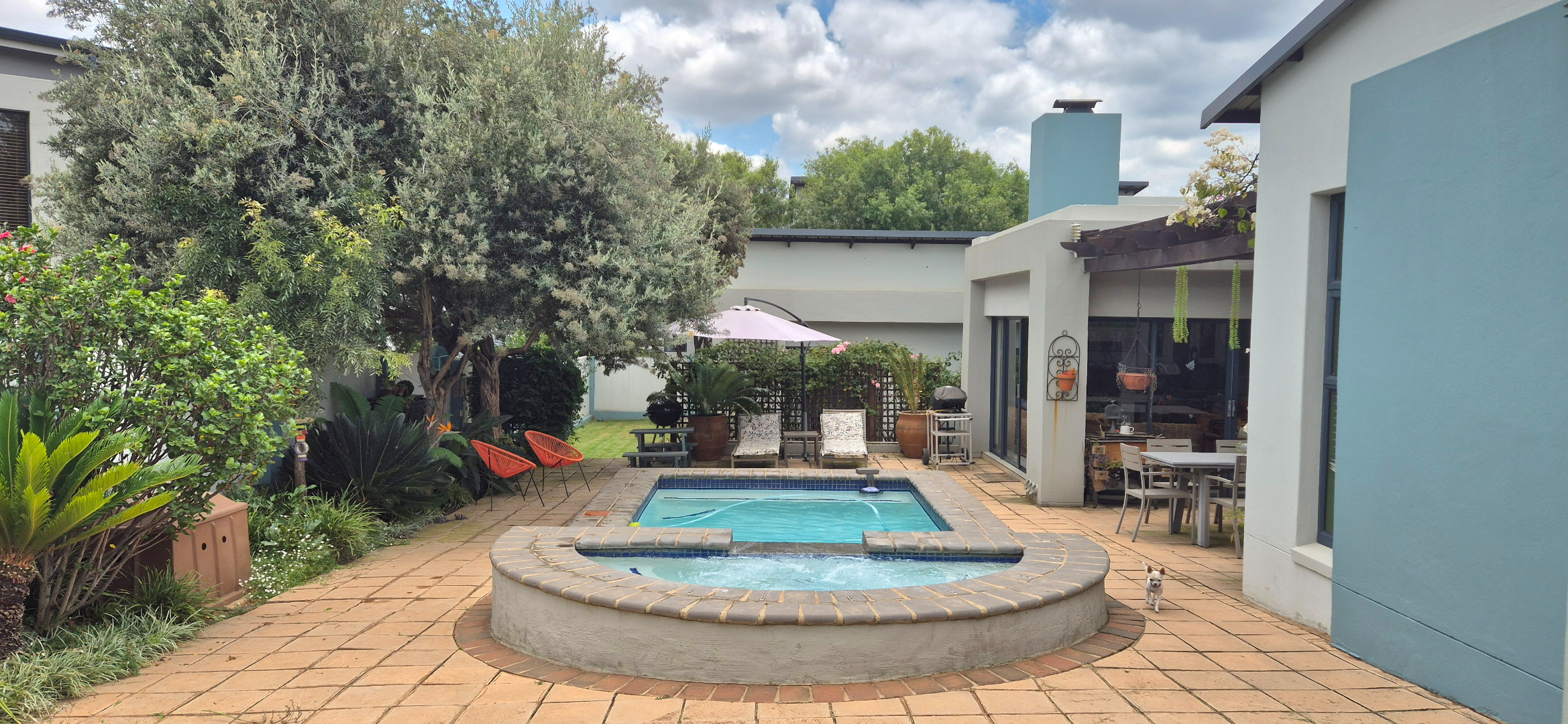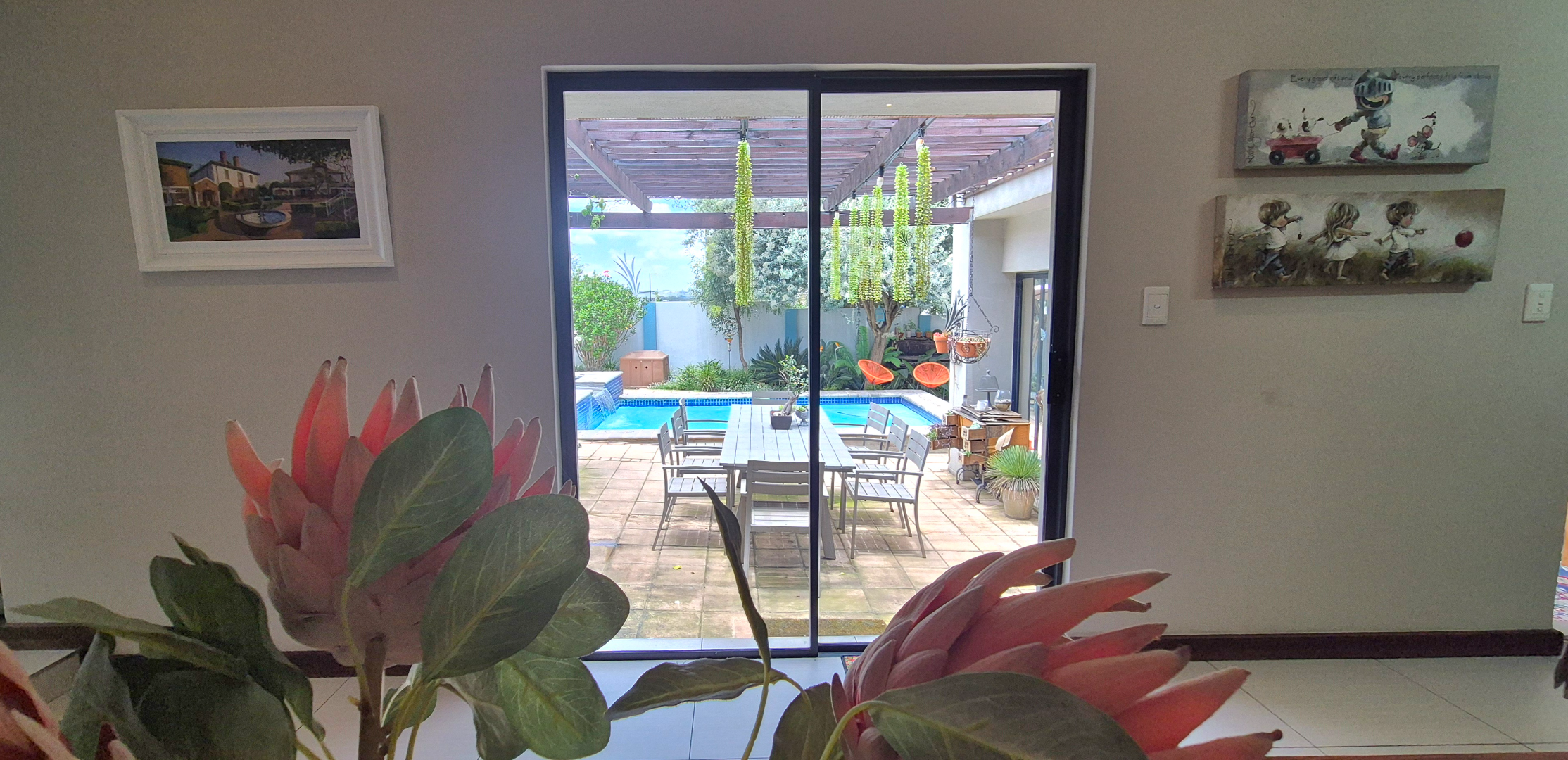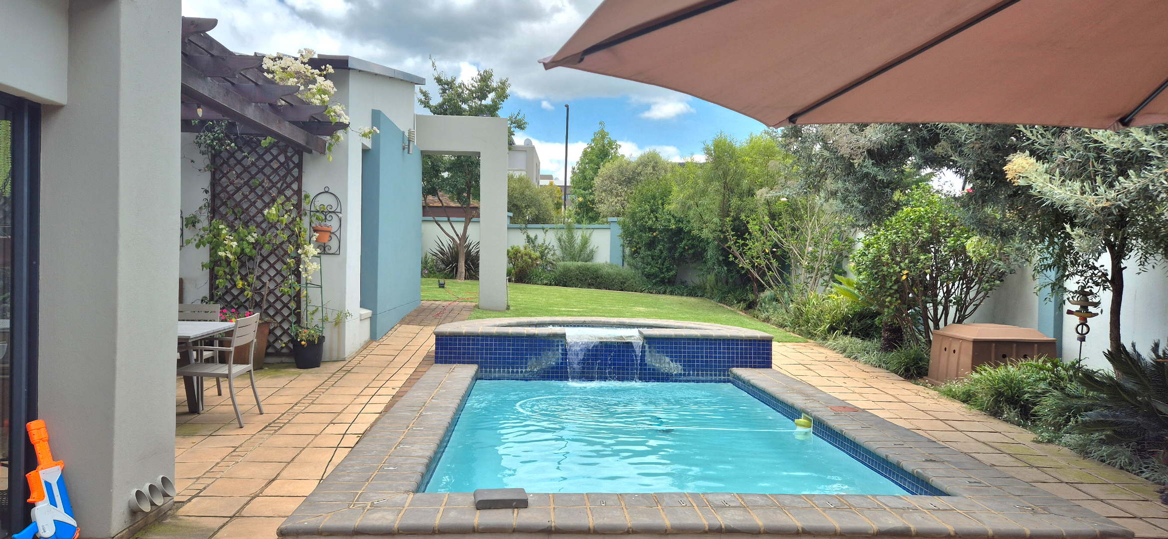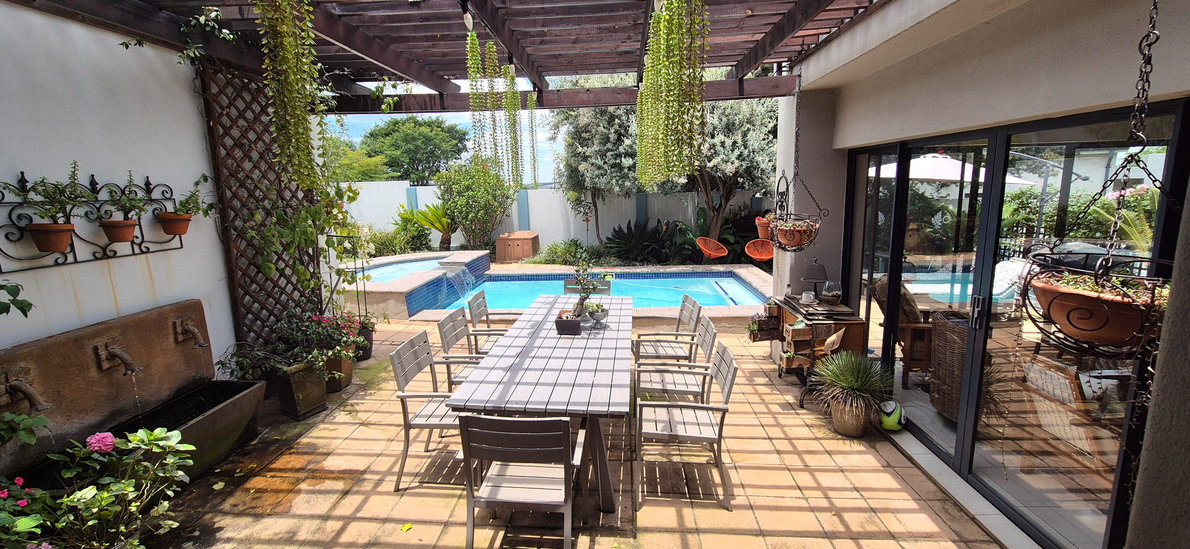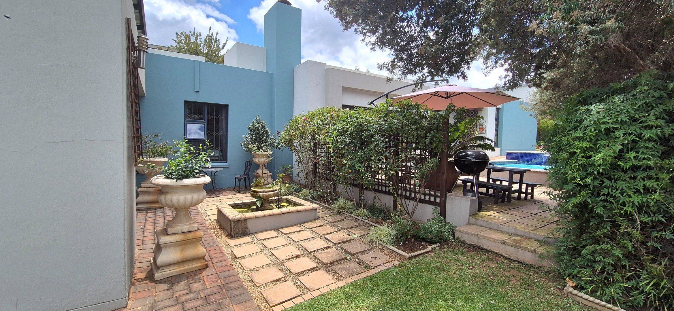 The kitchen leads into a sizable enclosed braai room with sliding doors, which opens seamlessly onto the garden and swimming pool. The gentle sound of a water feature enhances the peaceful atmosphere and adds to the home’s serene character.