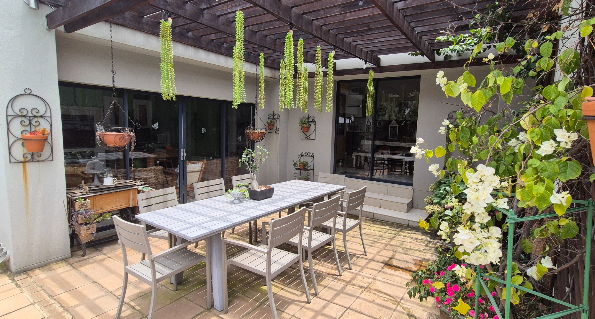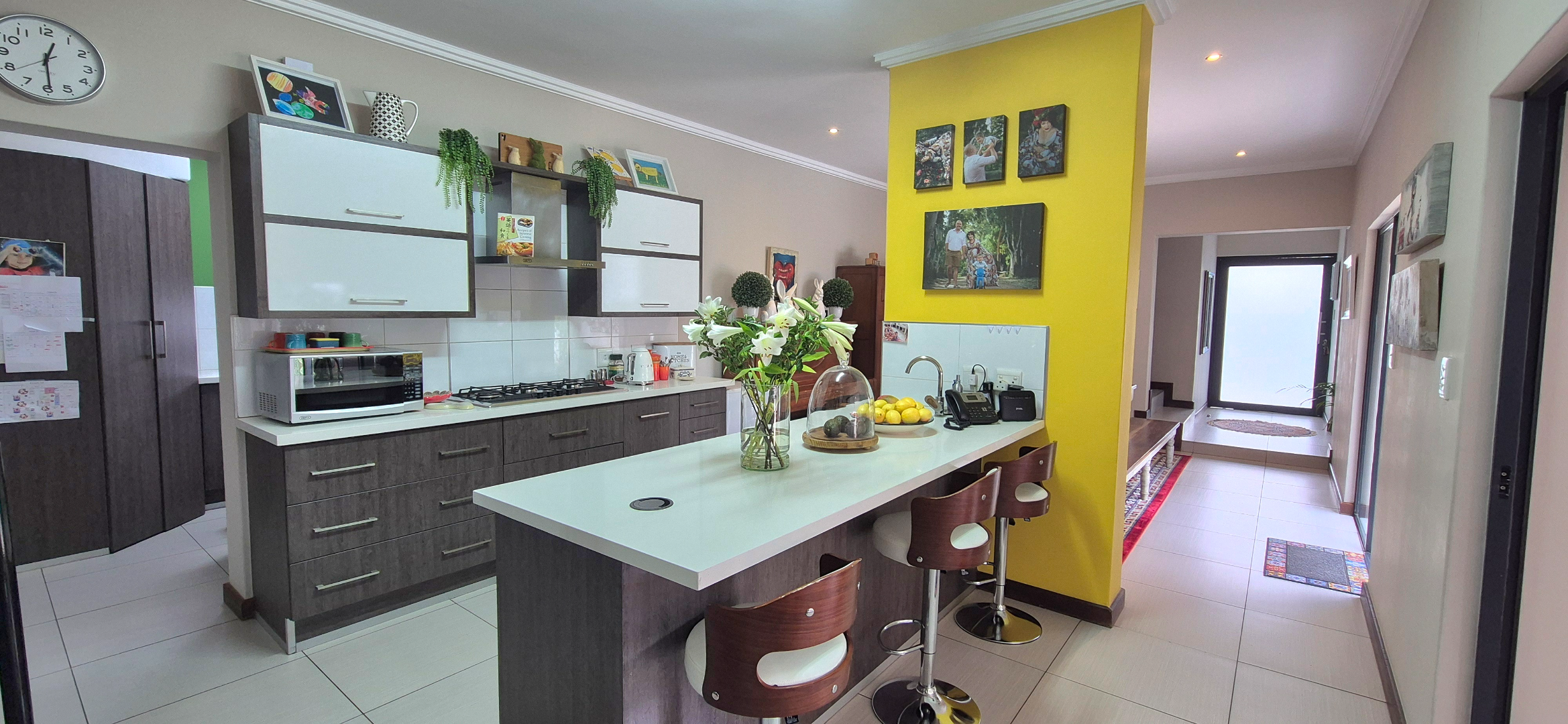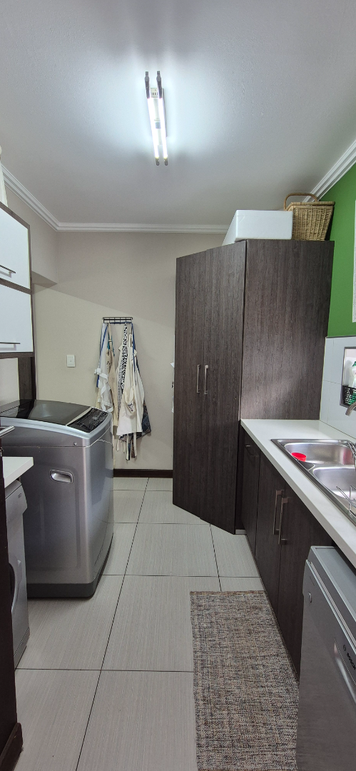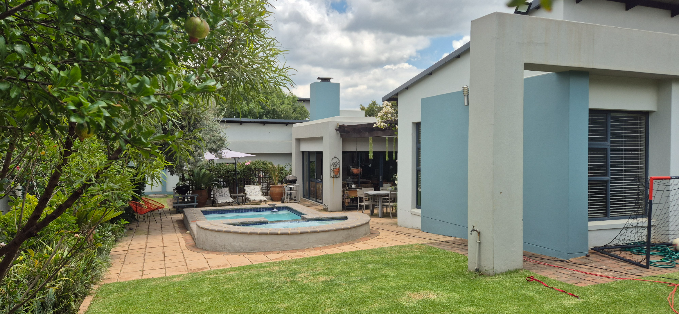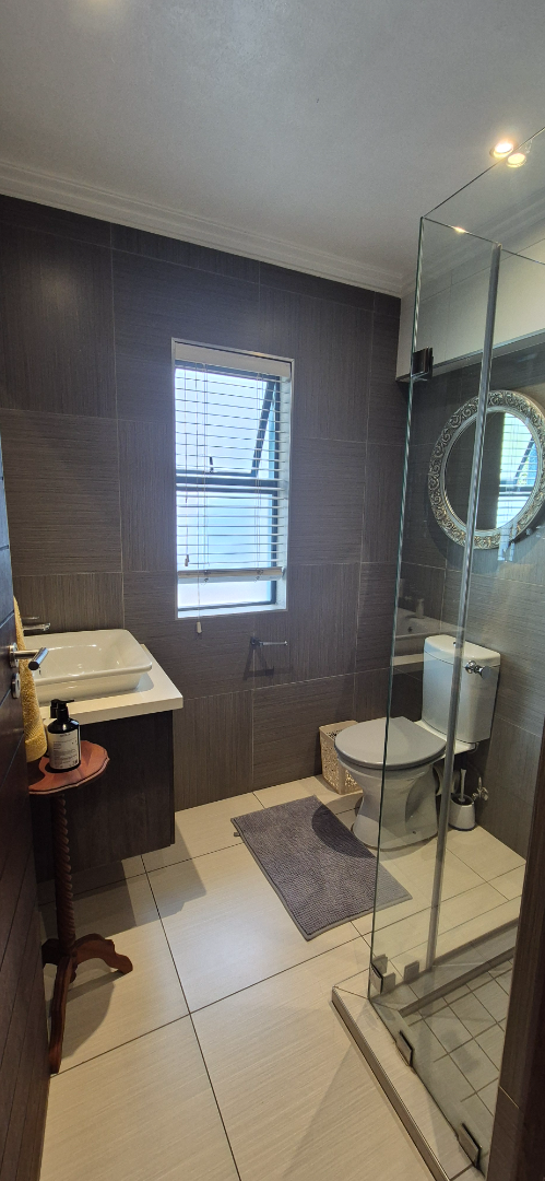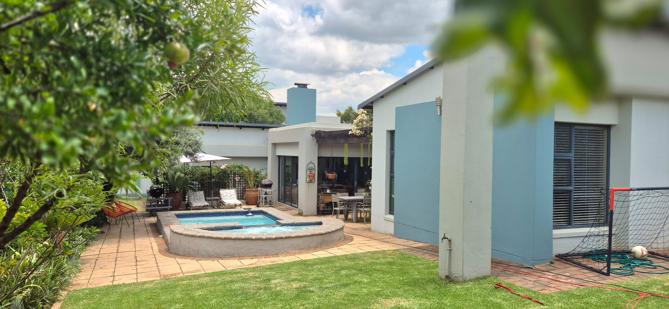 The kitchen leads into a sizable enclosed braai room with sliding doors, which opens seamlessly onto the garden and swimming pool. The gentle sound of a water feature enhances the peaceful atmosphere and adds to the home’s serene character.
