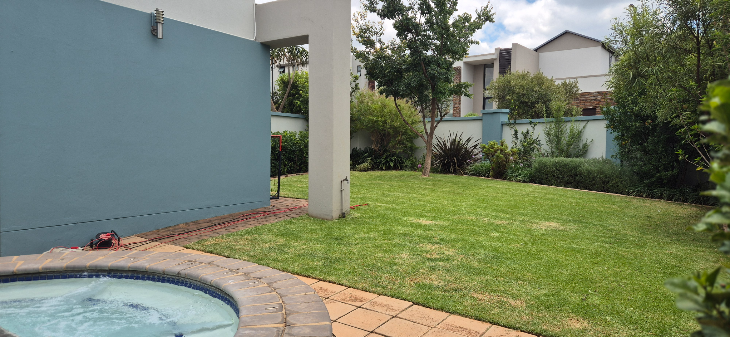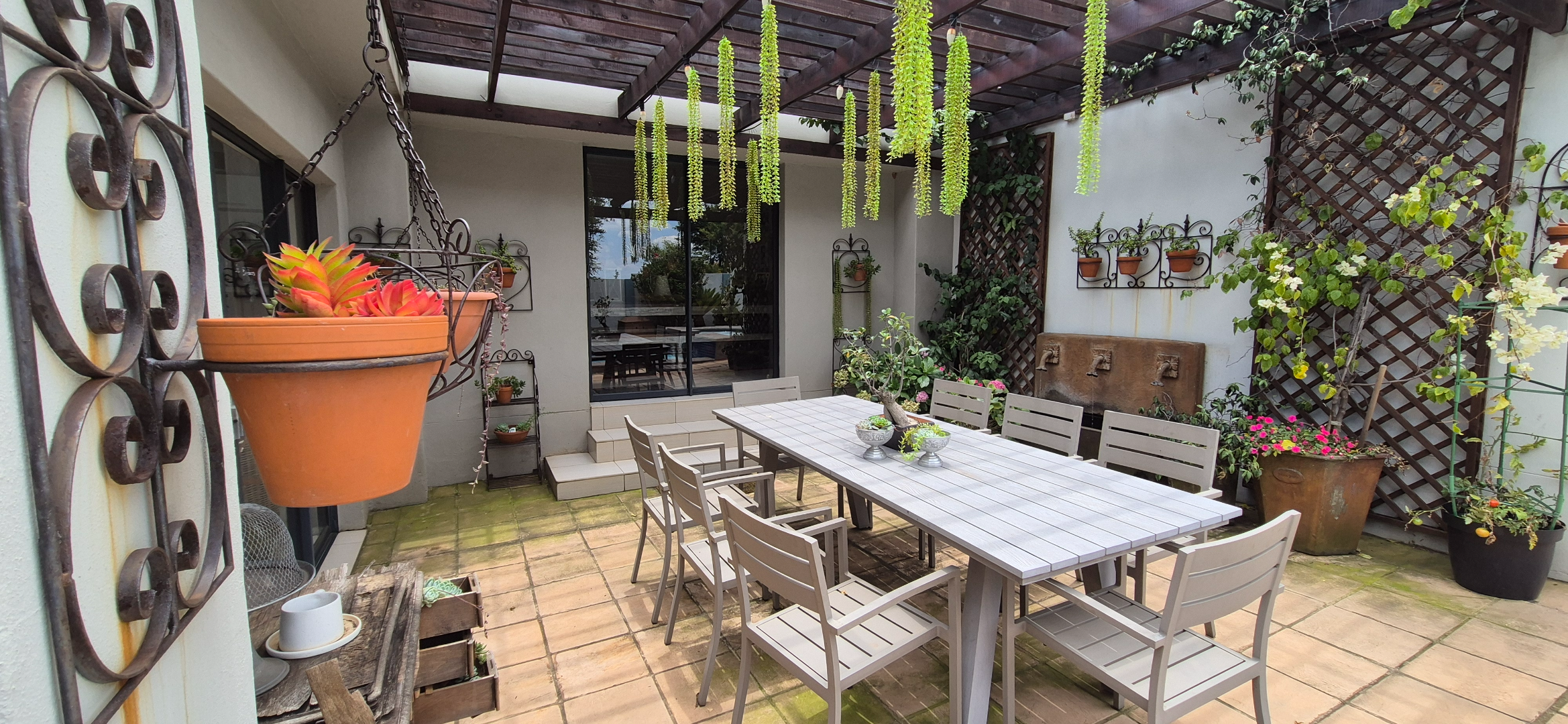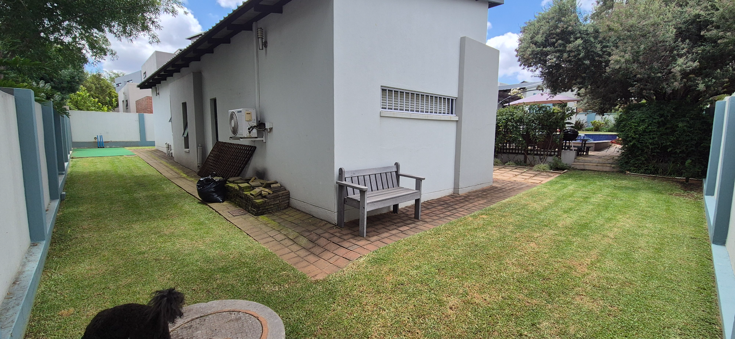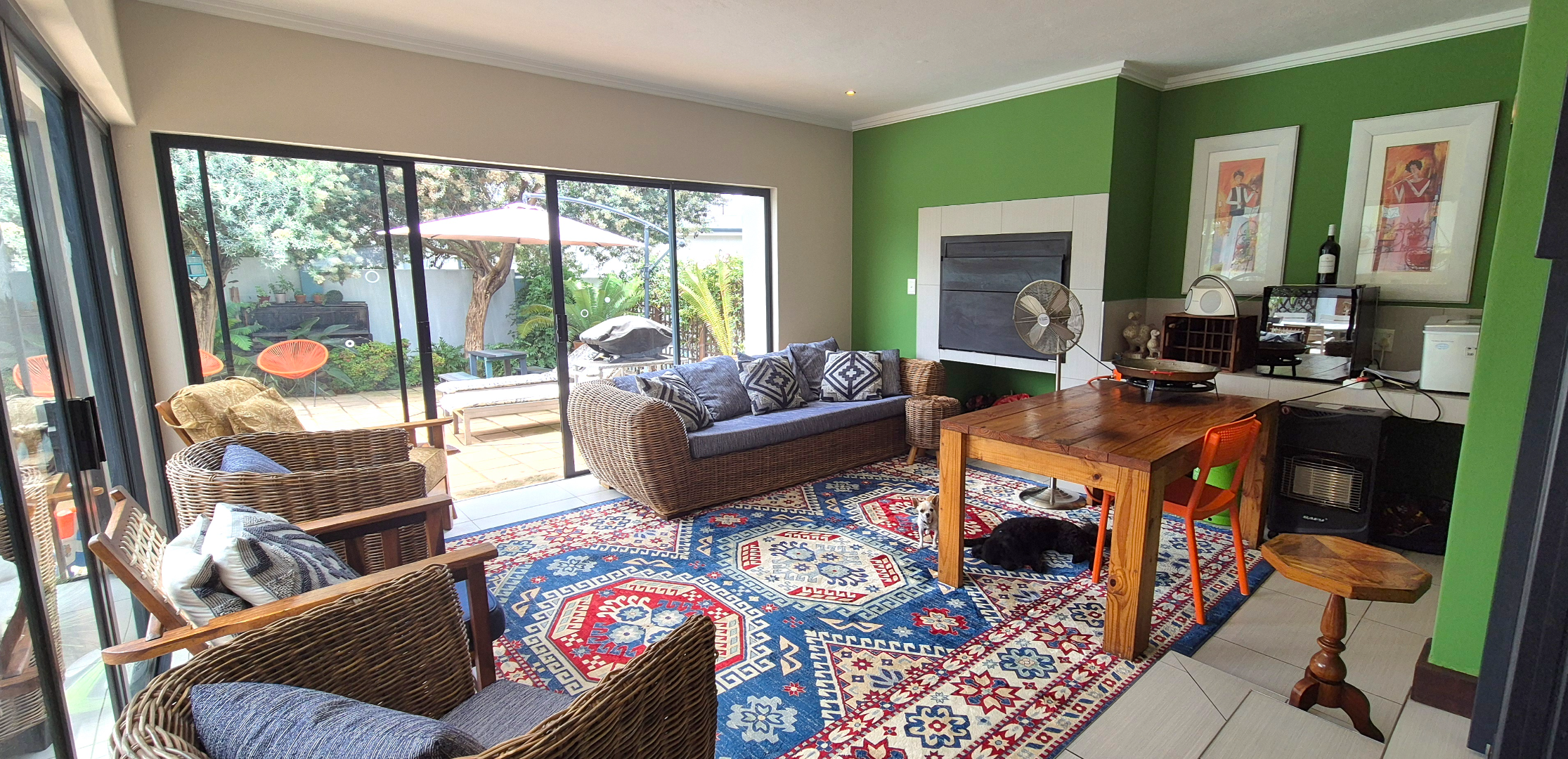 The kitchen leads into a sizable enclosed braai room with sliding doors, which opens seamlessly onto the garden and swimming pool. The gentle sound of a water feature enhances the peaceful atmosphere and adds to the home’s serene character.