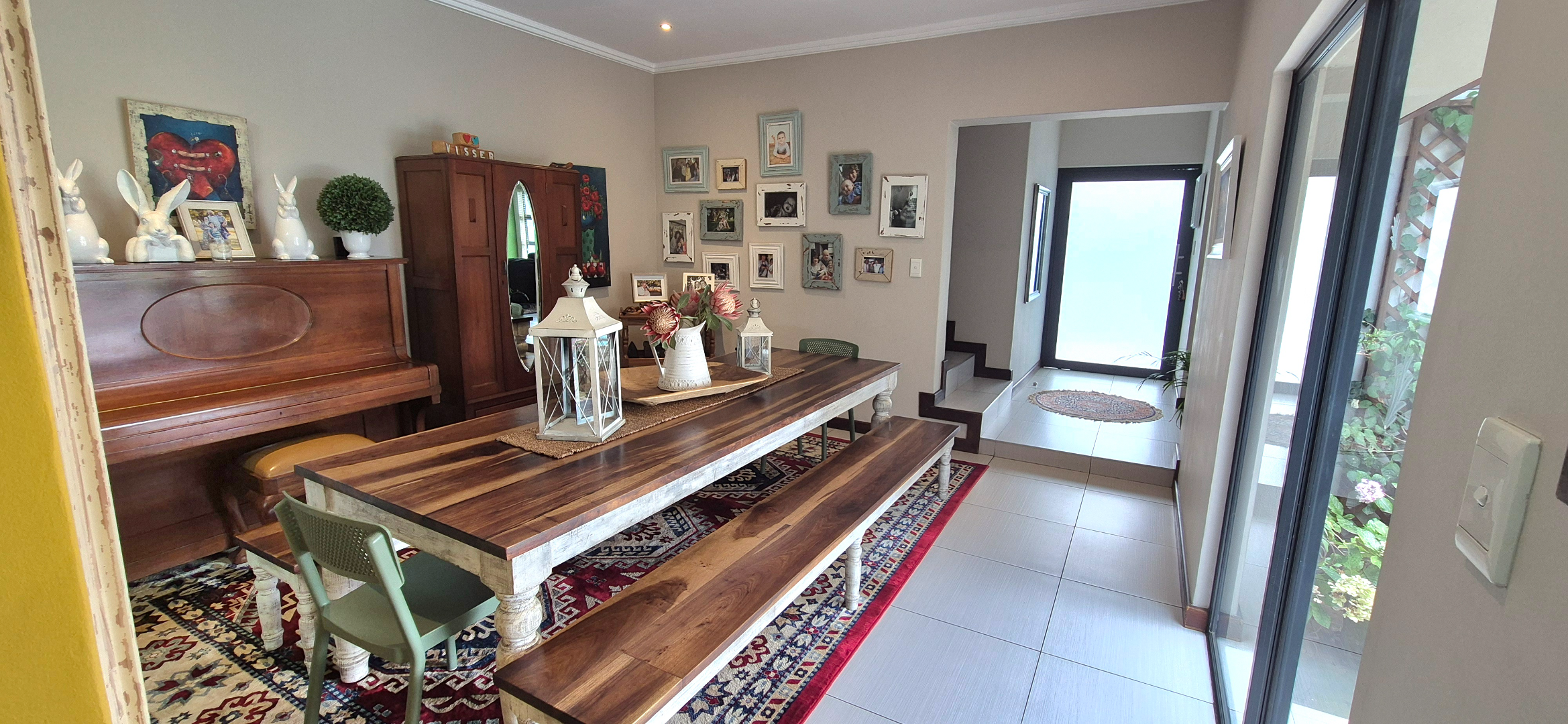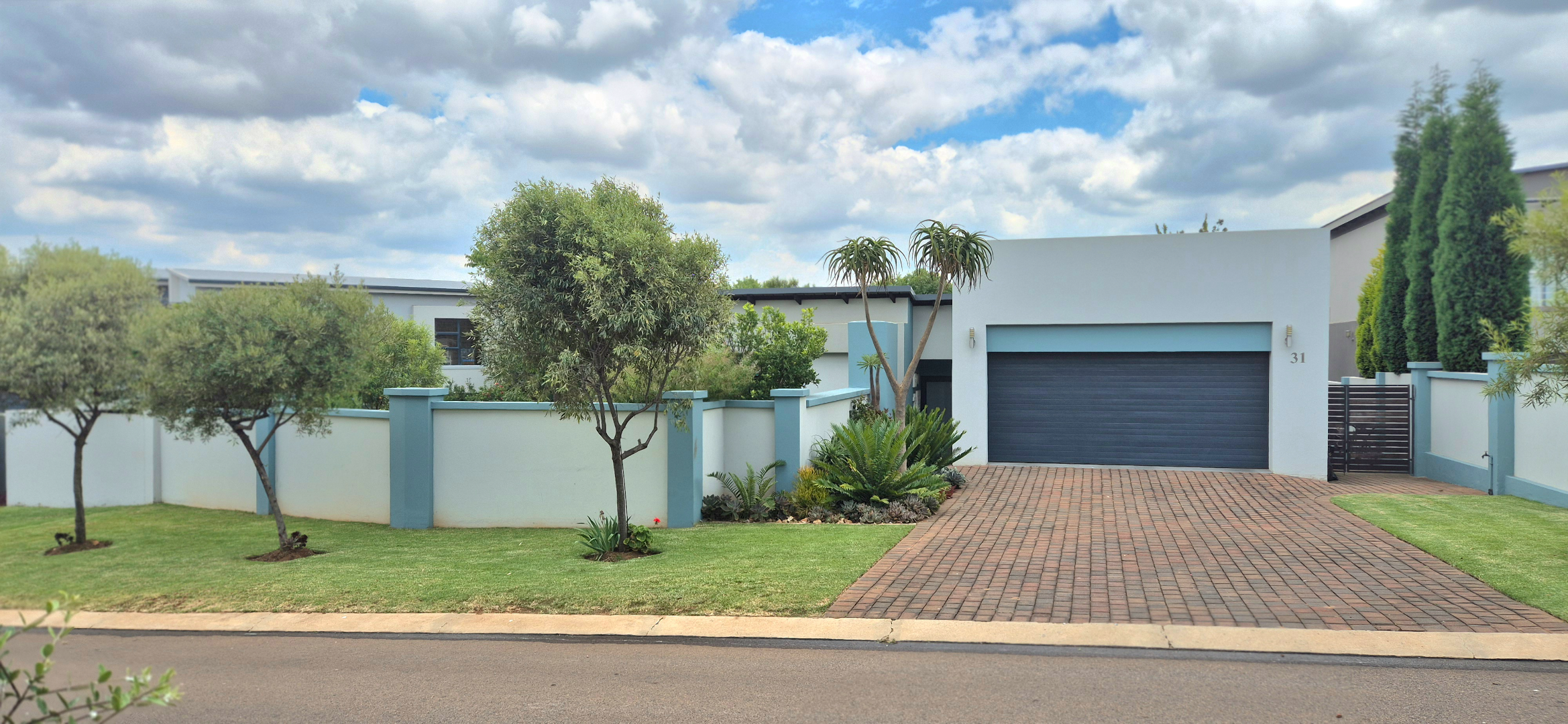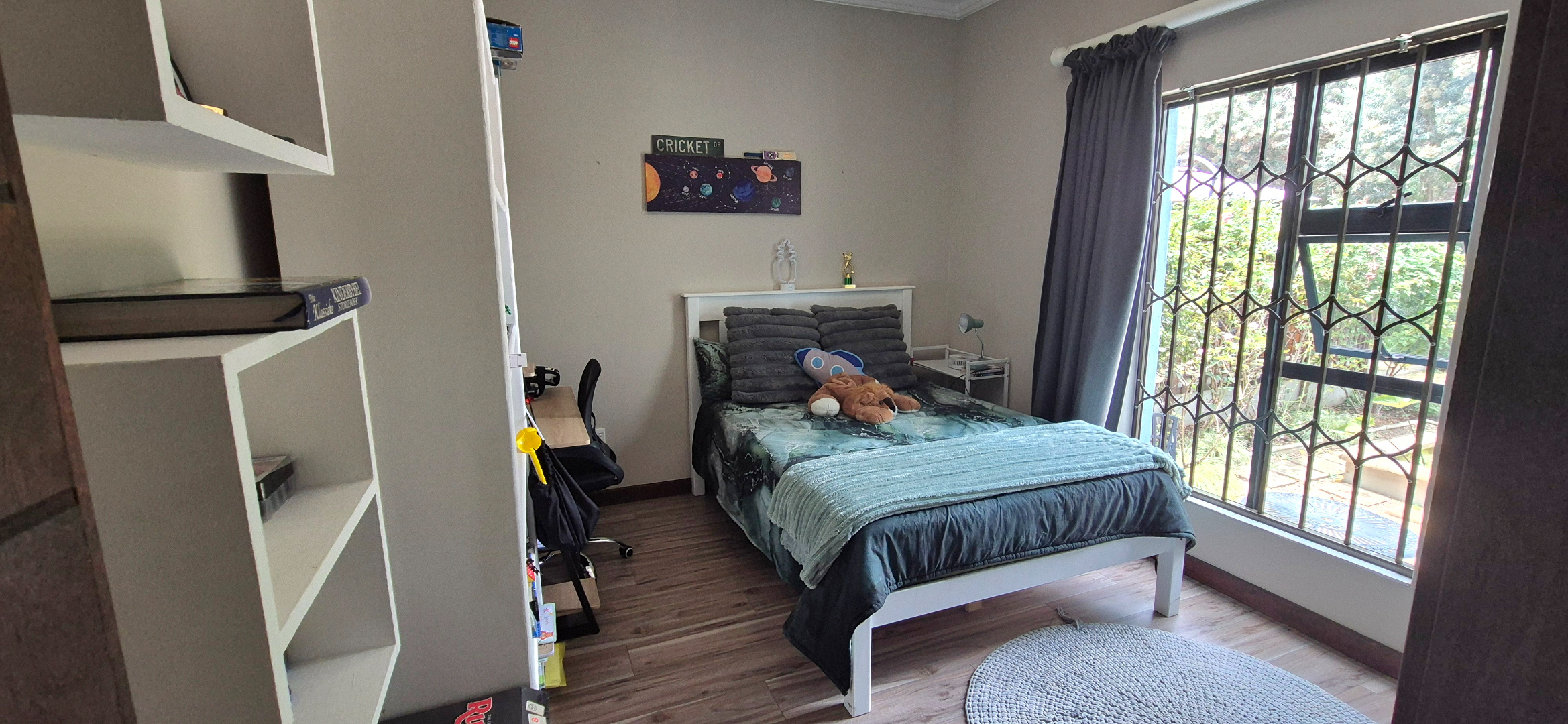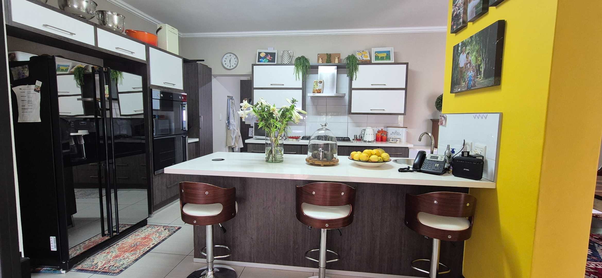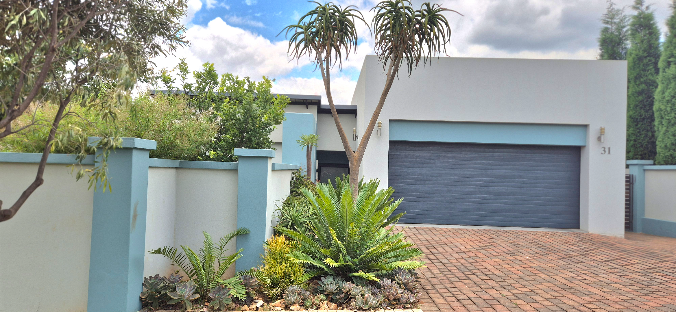 The kitchen leads into a sizable enclosed braai room with sliding doors, which opens seamlessly onto the garden and swimming pool. The gentle sound of a water feature enhances the peaceful atmosphere and adds to the home’s serene character.