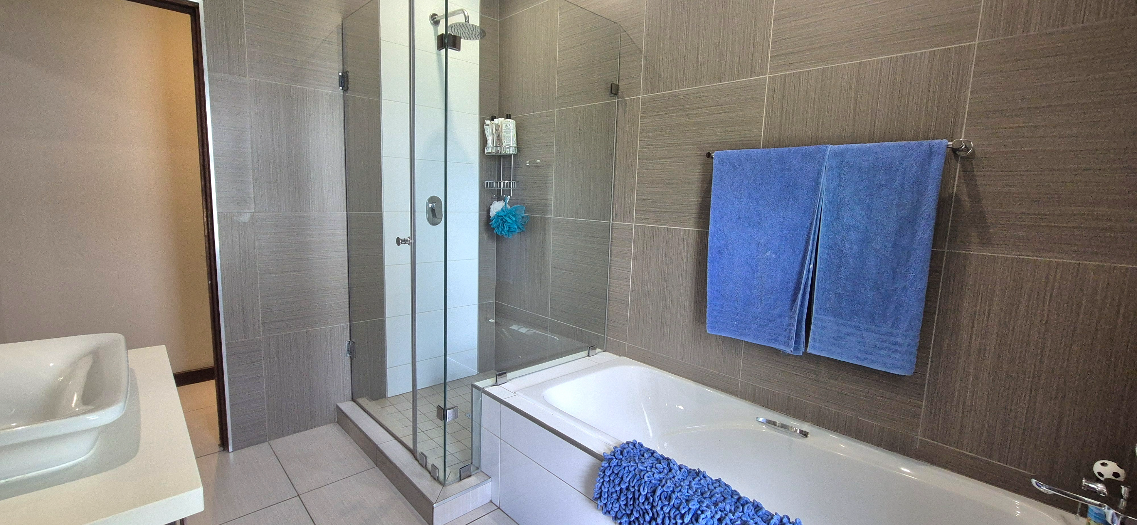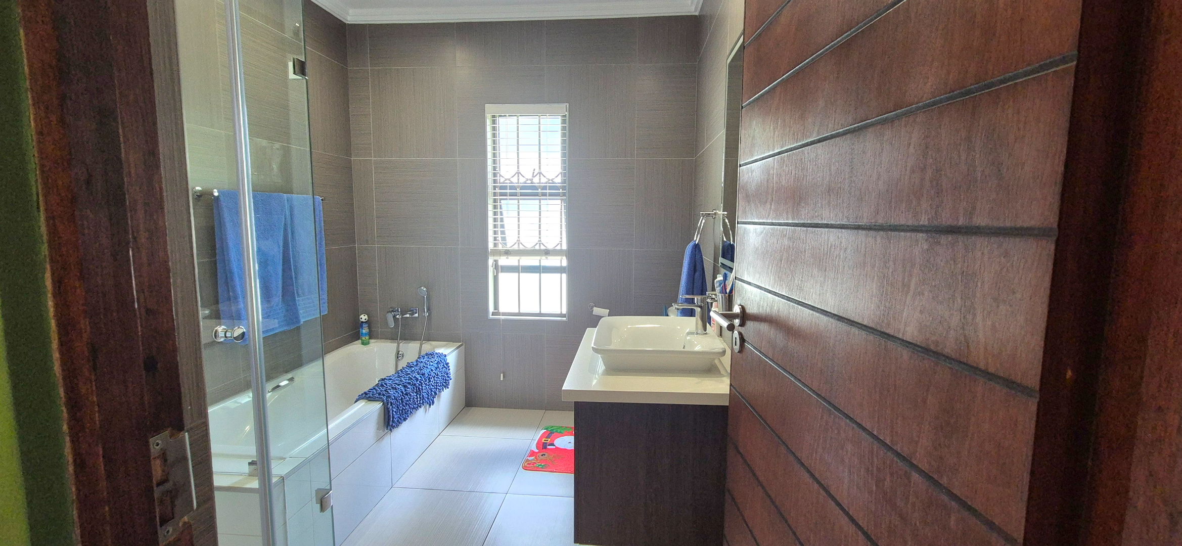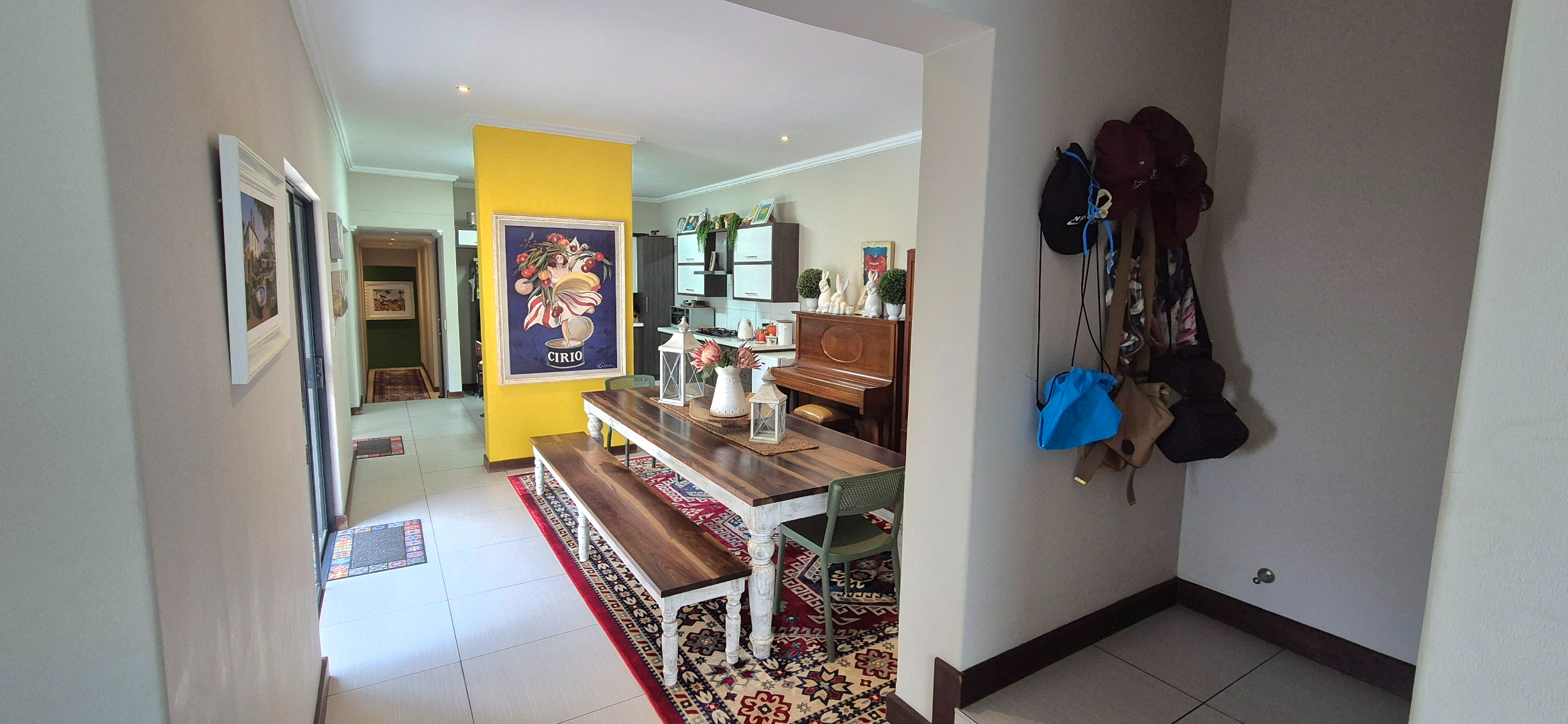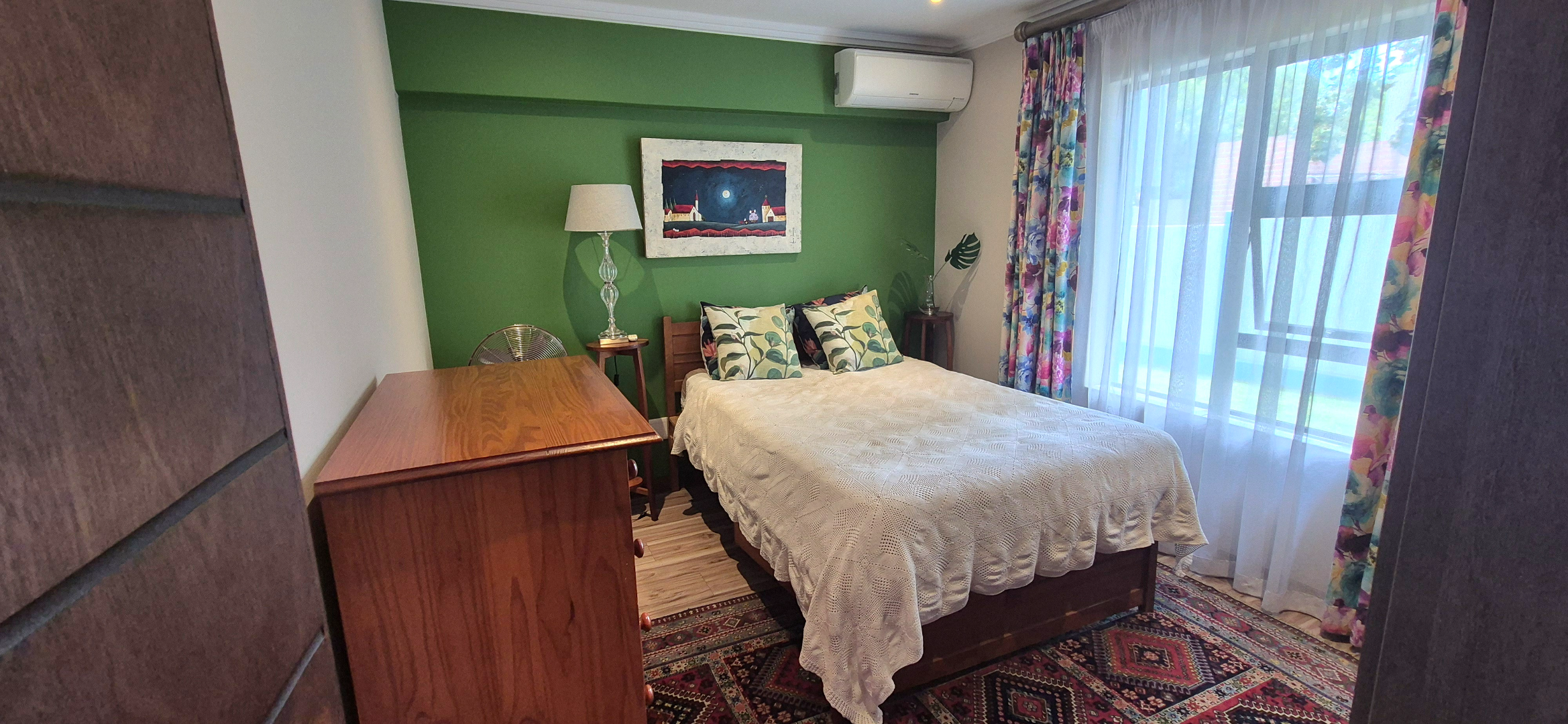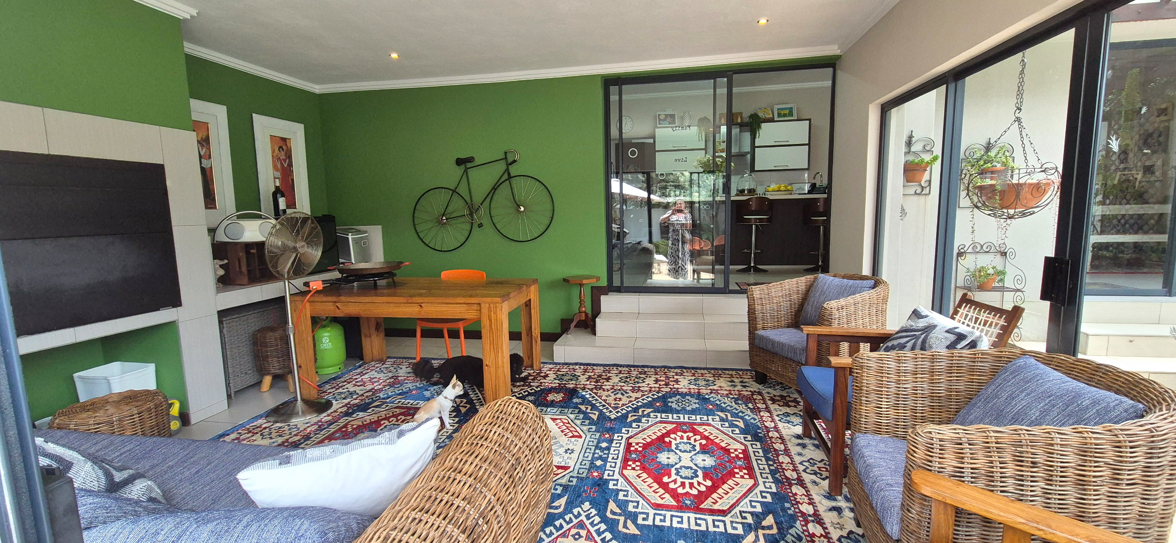 The kitchen leads into a sizable enclosed braai room with sliding doors, which opens seamlessly onto the garden and swimming pool. The gentle sound of a water feature enhances the peaceful atmosphere and adds to the home’s serene character.