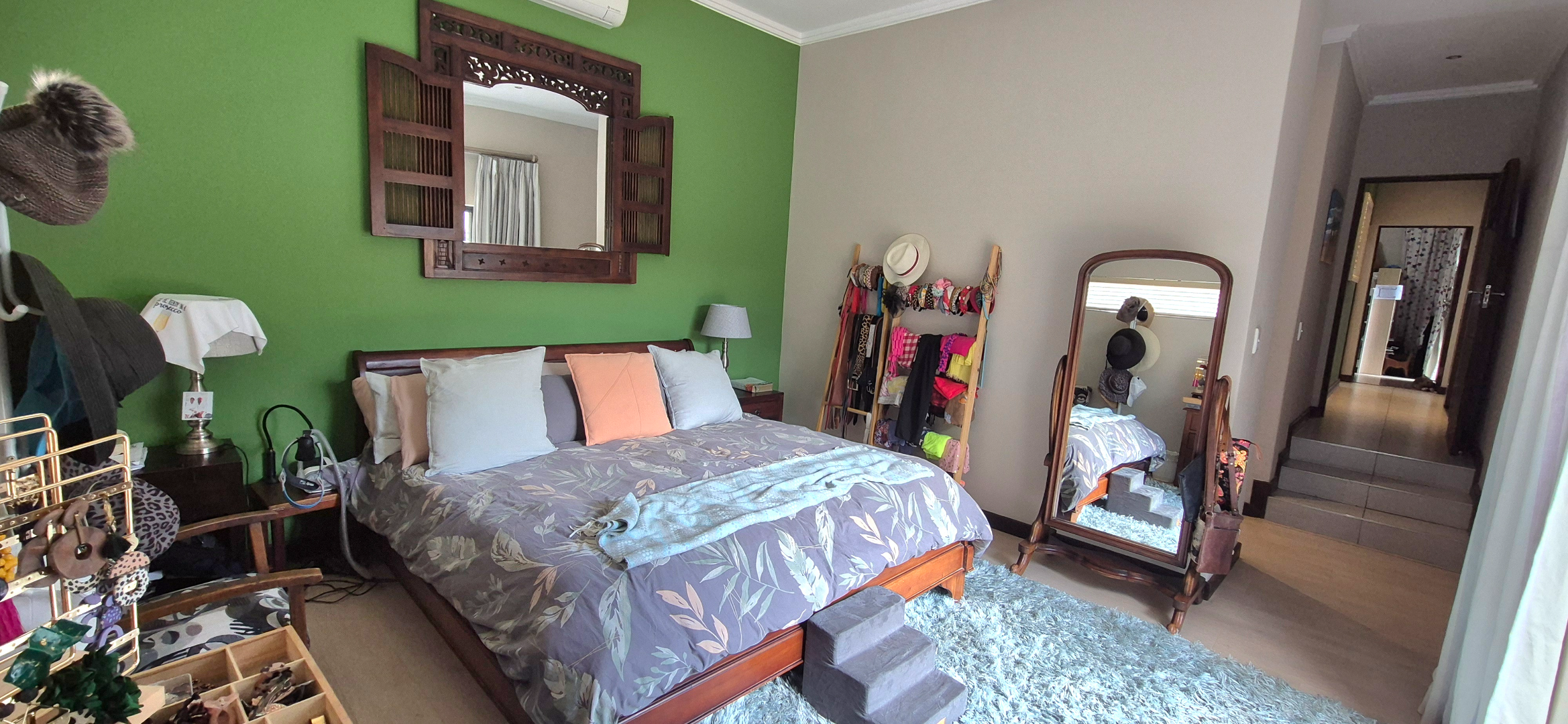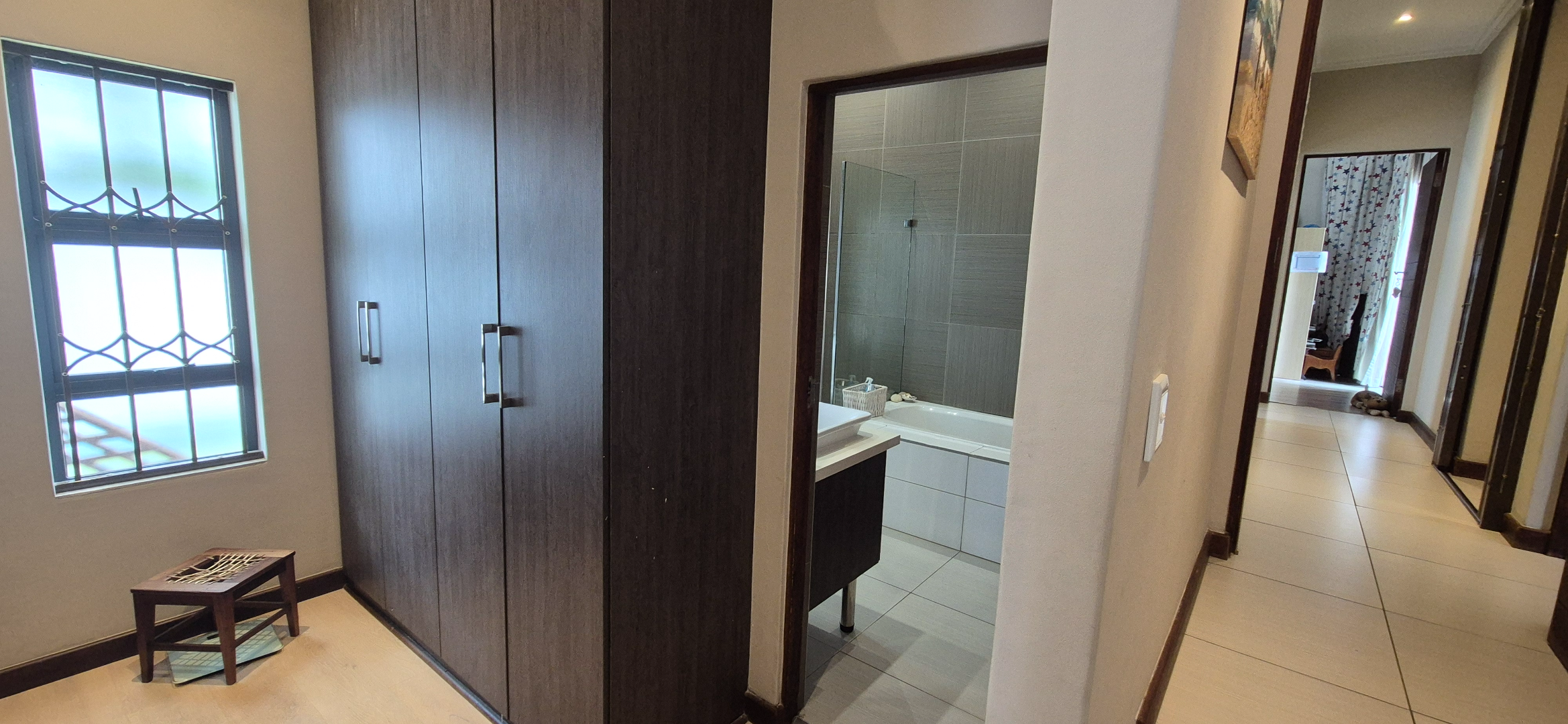 Down the hallway, you will find the guest bathroom, which also serves the guest bedroom. The spacious main bedroom is privately positioned and connects to the en-suite bathroom via a dressing room. Two additional bedrooms share a third full bathroom.