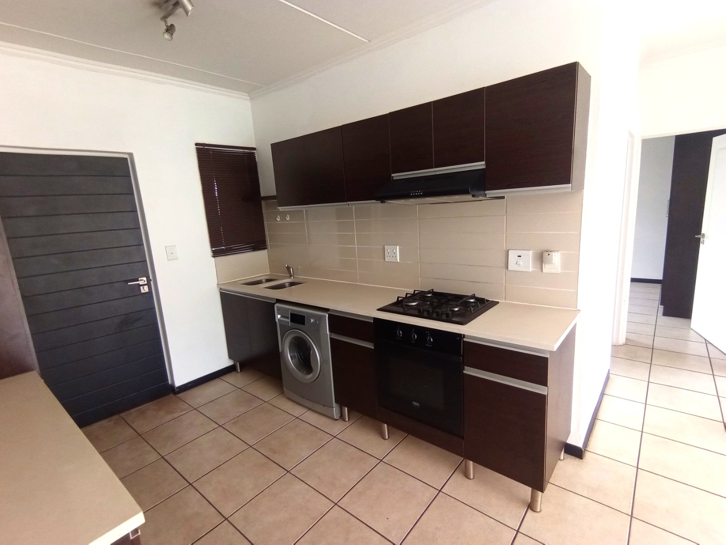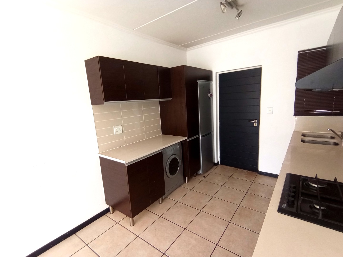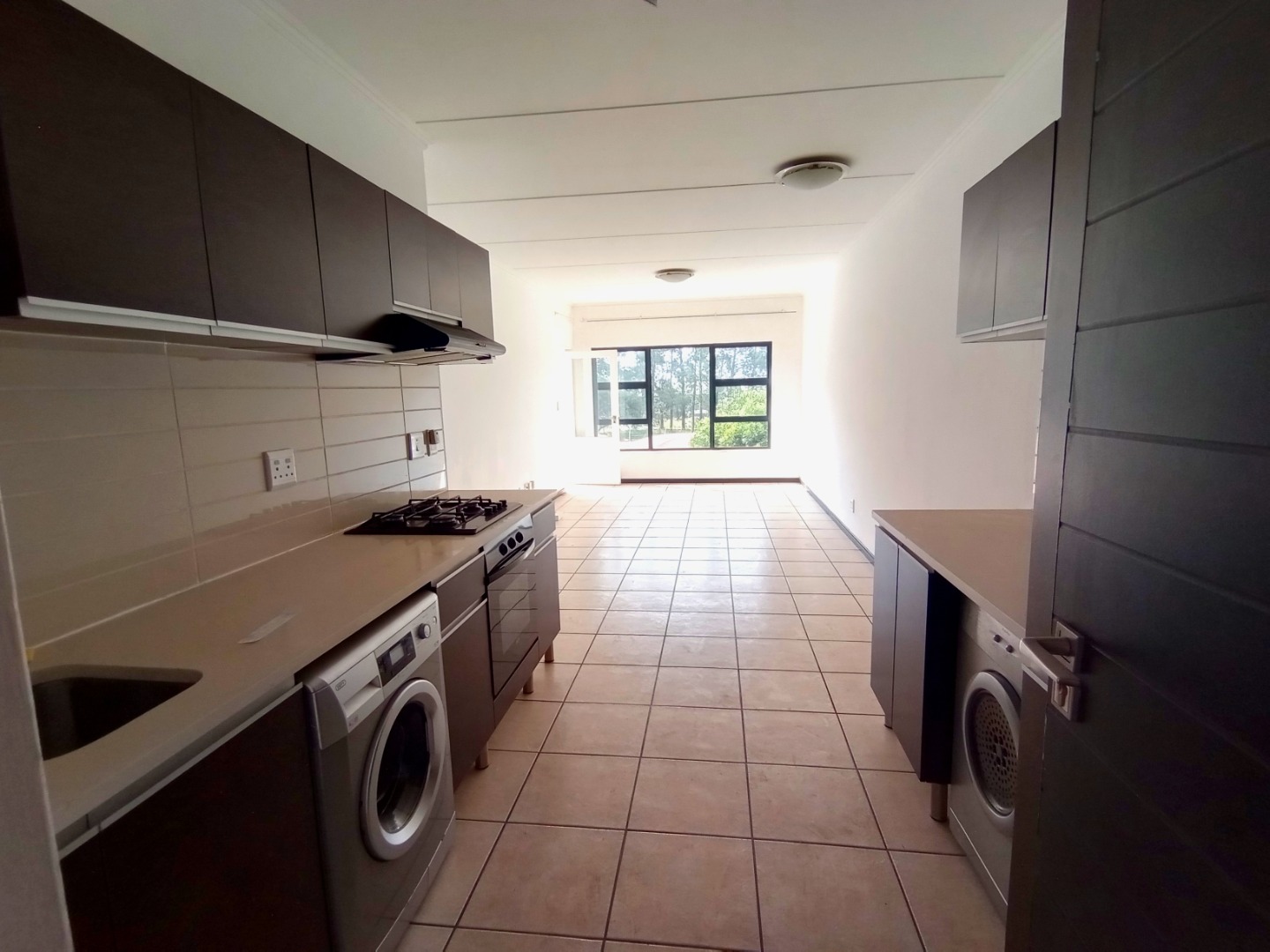 - Kitchen with sleek, Caesarstone tops and major appliances.