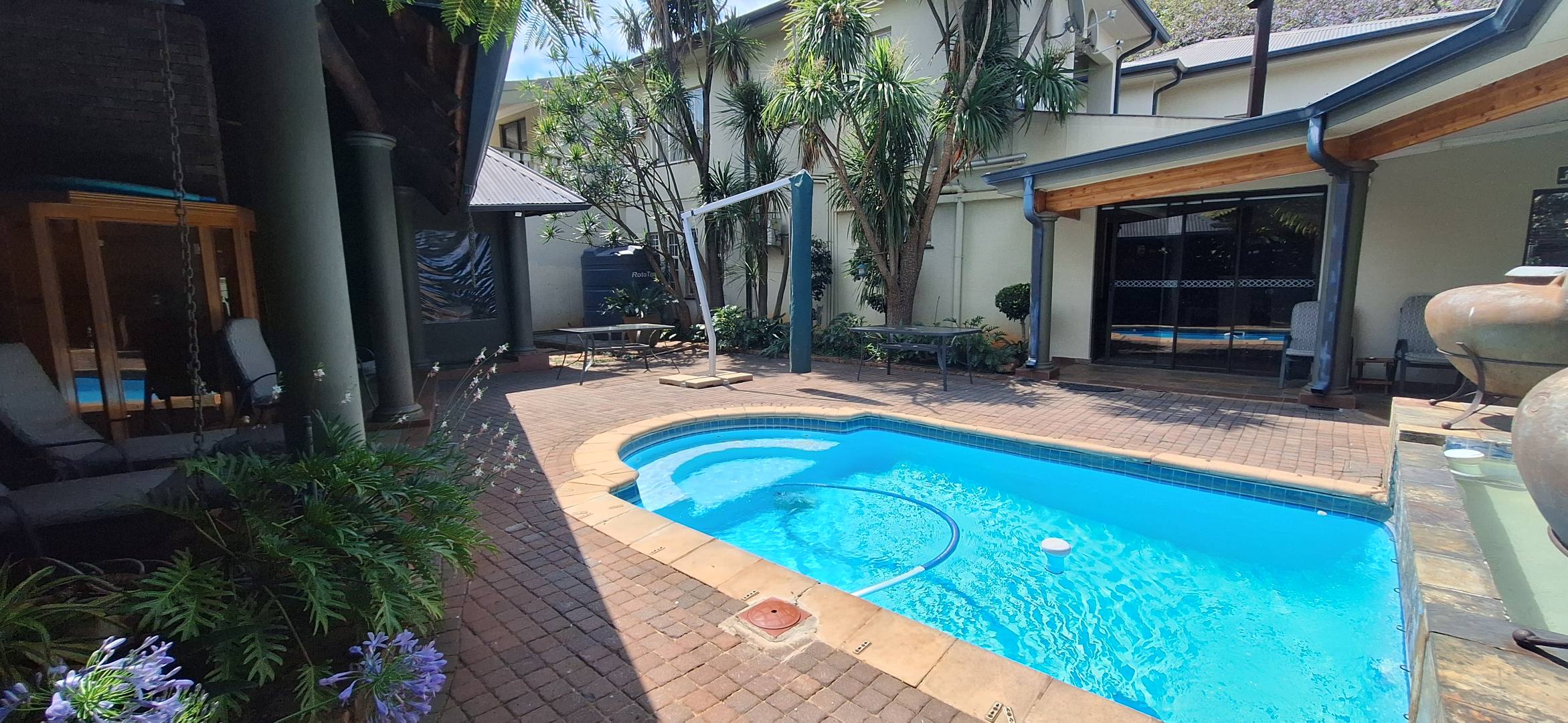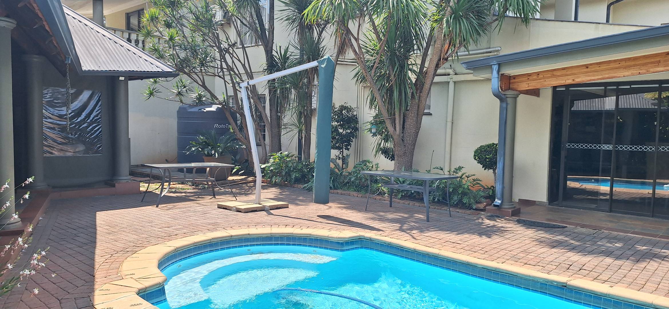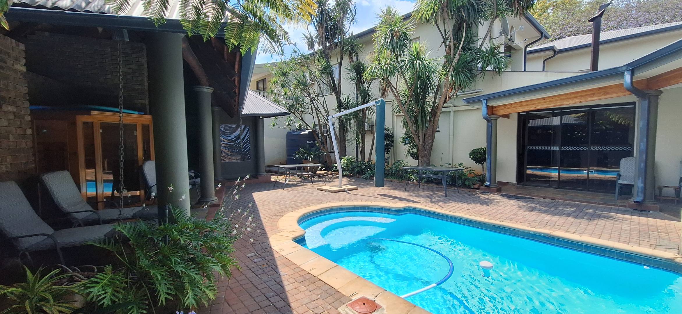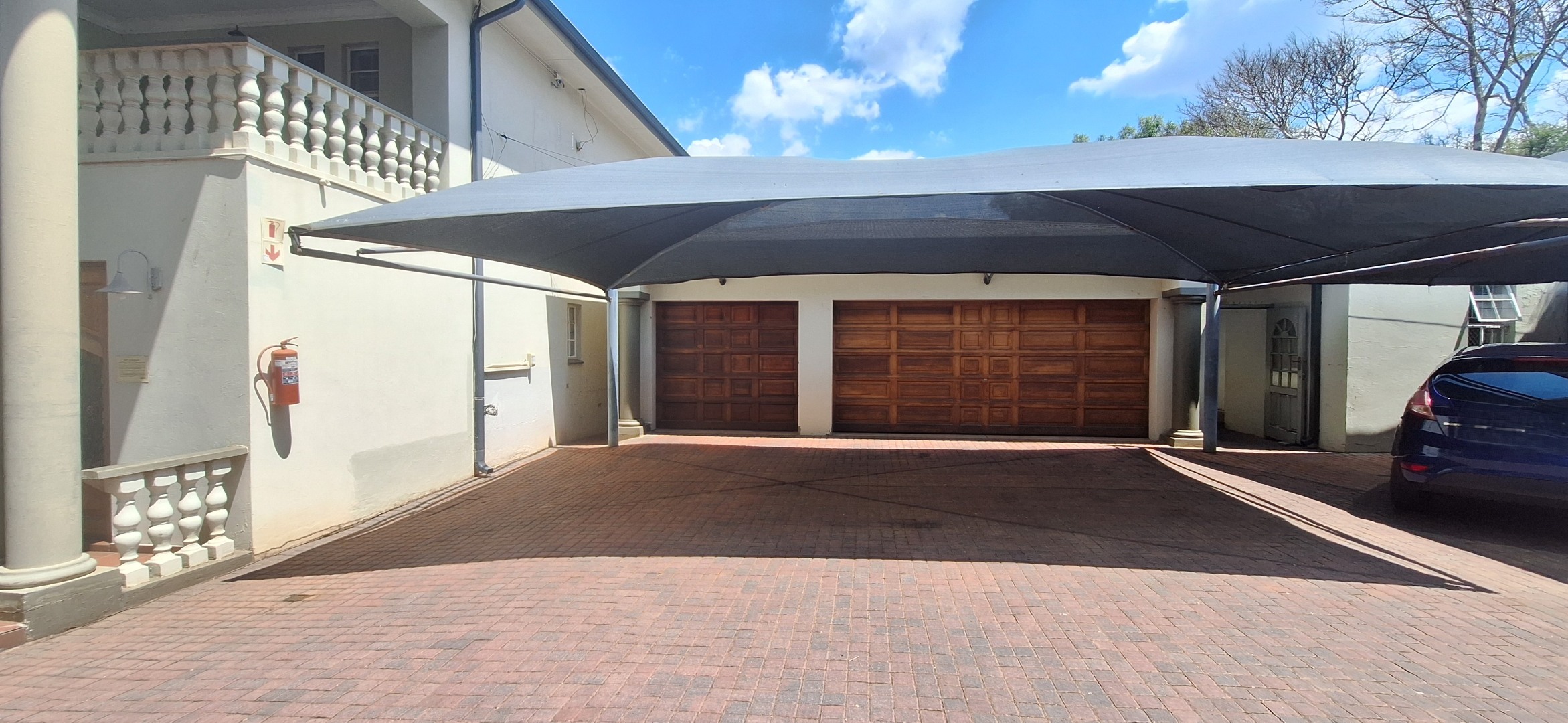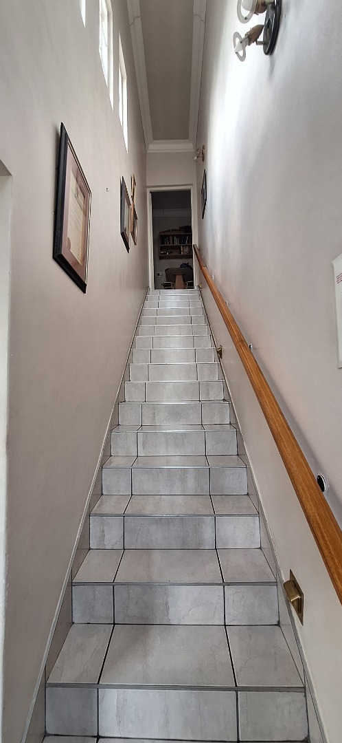 The generous 1317 sqm erf unfolds into a private oasis, featuring a sparkling swimming pool, a charming lapa, and a built-in braai for alfresco gatherings. Lush gardens, sustained by an irrigation system, create a serene backdrop, while a spacious patio and multiple balconies invite tranquil contemplation. Practical amenities include three garages, nine parking bays, staff quarters, outside toilets, and a dedicated laundry. Enhanced security is provided by electric fencing, an access gate, and an intercom system, while modern conveniences include fibre connectivity, a solar geyser, and water tank, ensuring sustainable and efficient living.