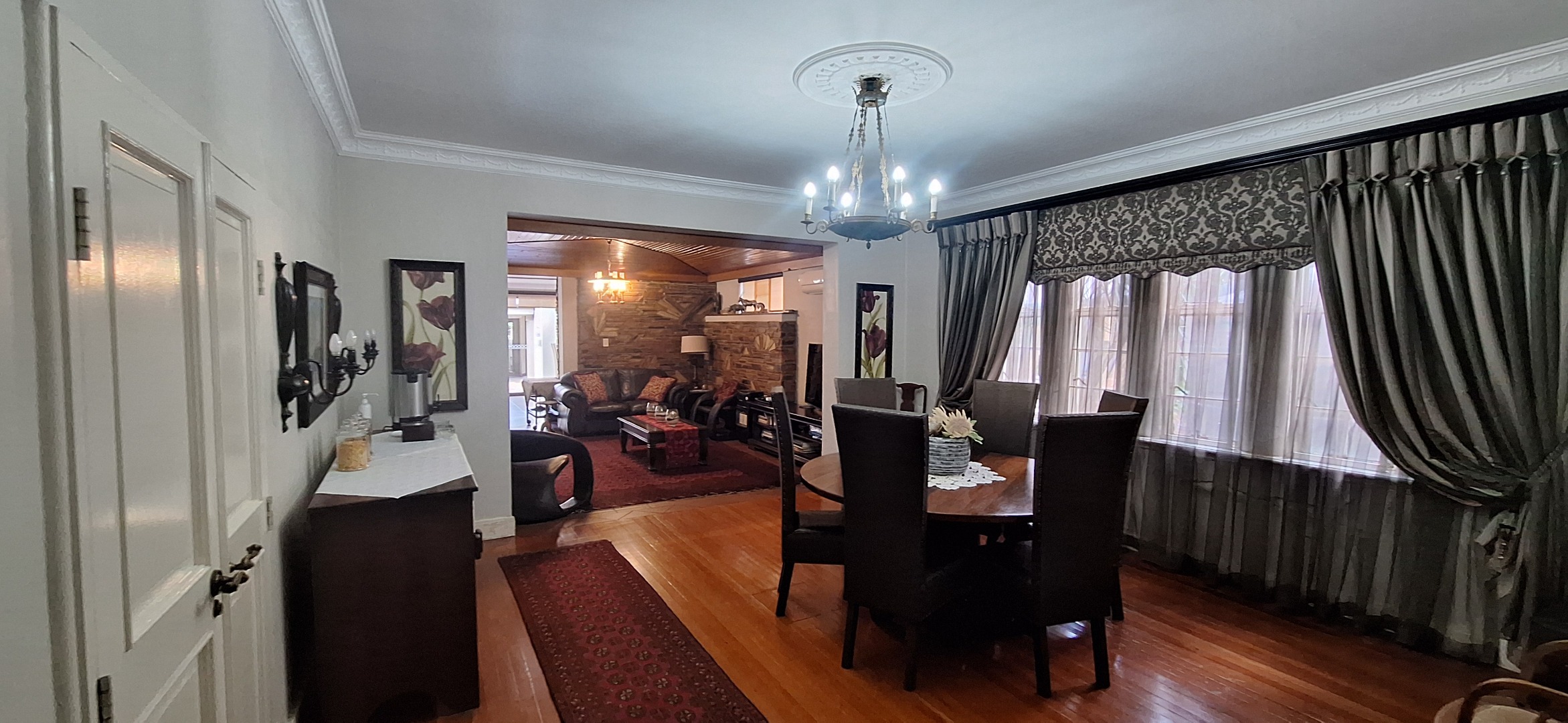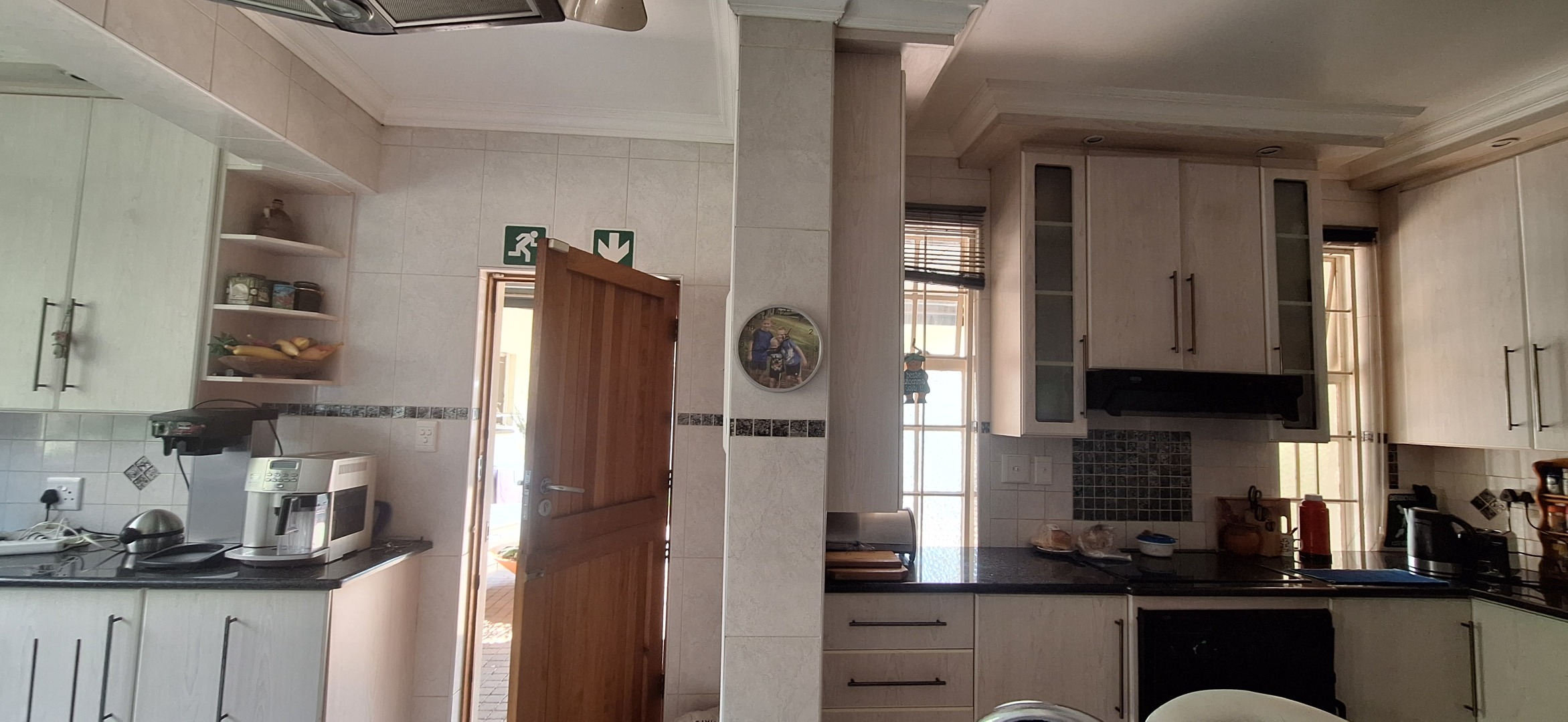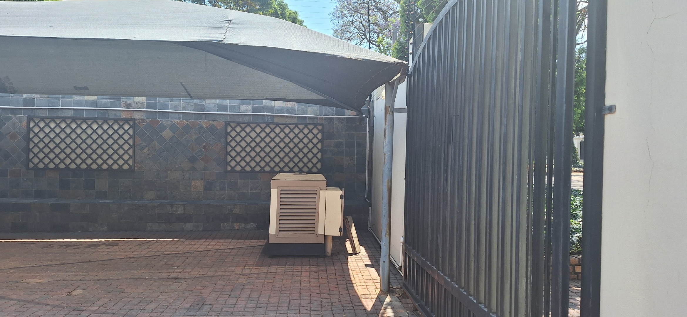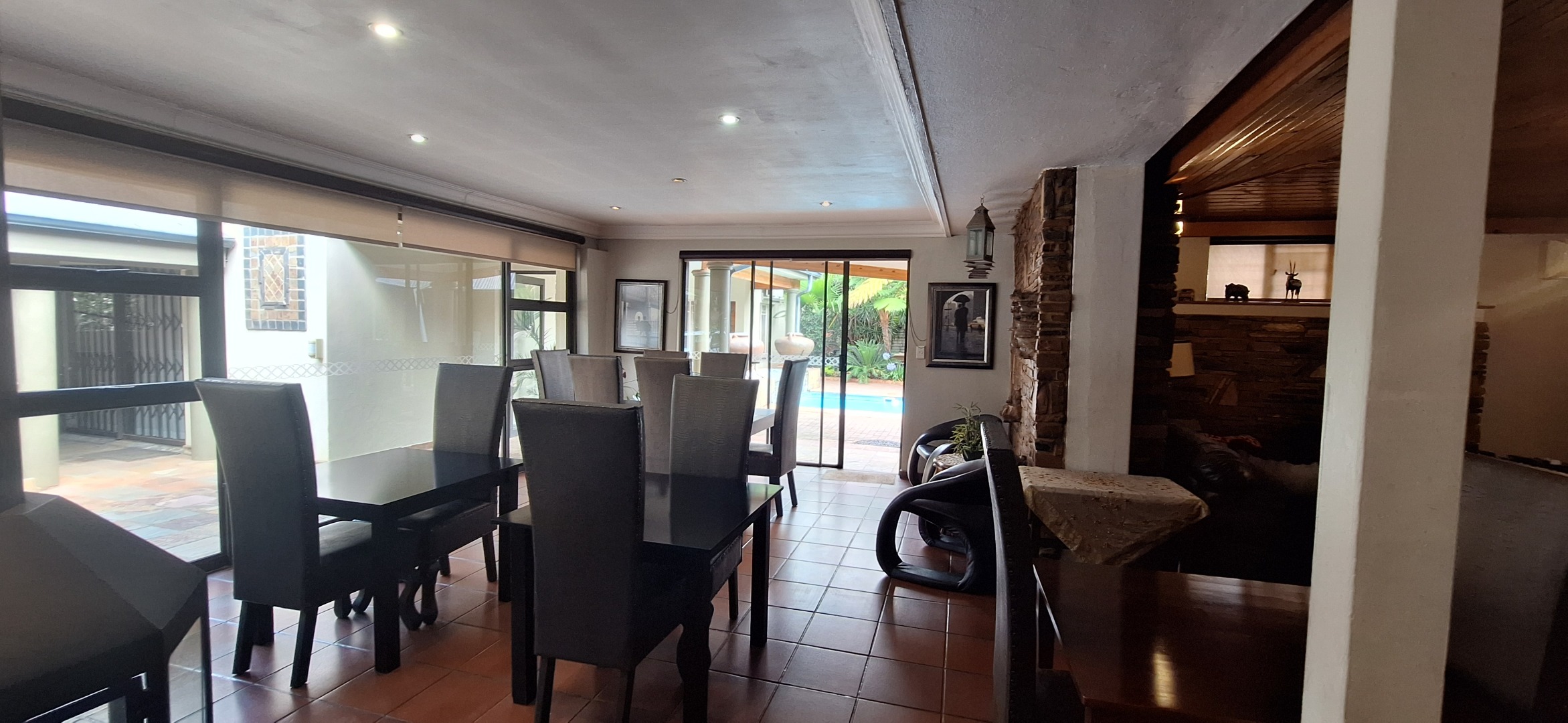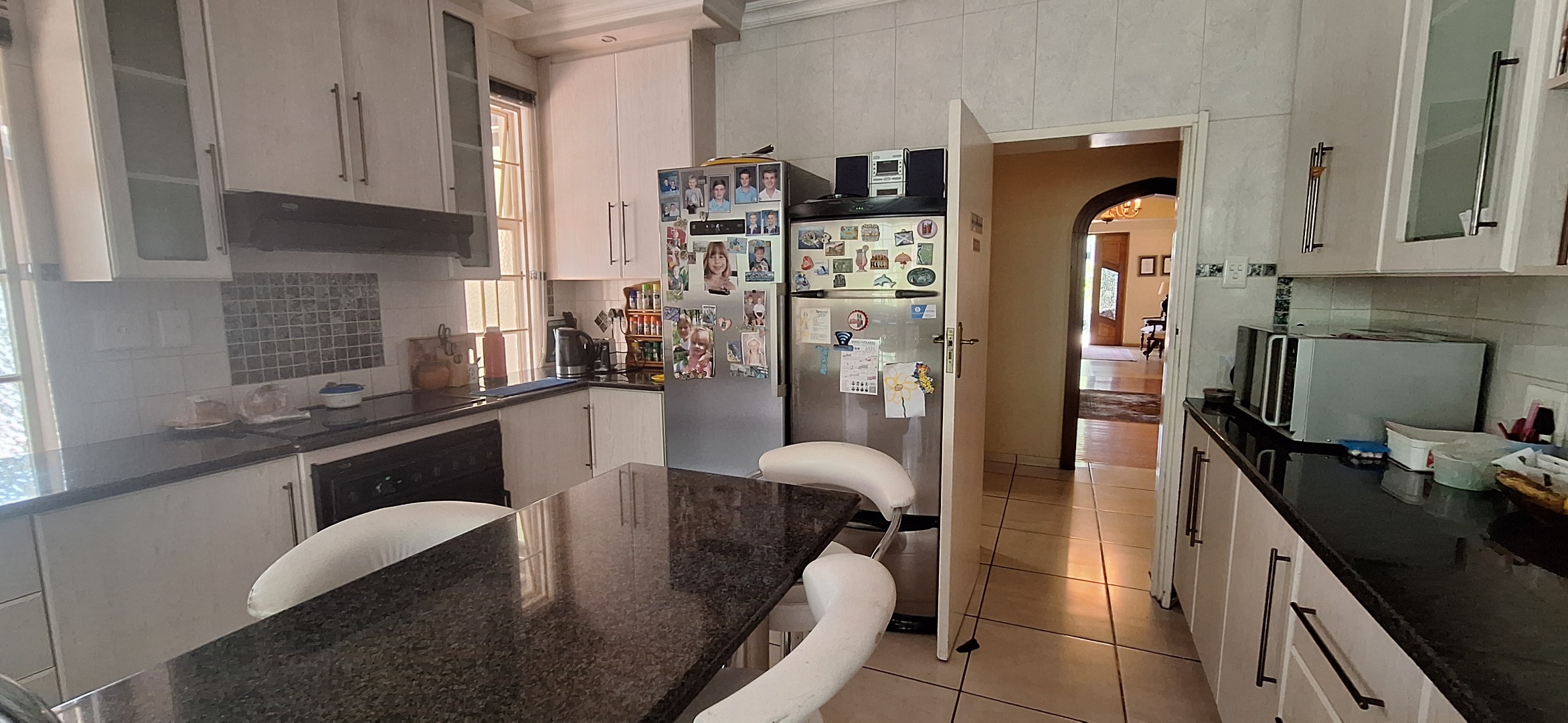 The generous 1317 sqm erf unfolds into a private oasis, featuring a sparkling swimming pool, a charming lapa, and a built-in braai for alfresco gatherings. Lush gardens, sustained by an irrigation system, create a serene backdrop, while a spacious patio and multiple balconies invite tranquil contemplation. Practical amenities include three garages, nine parking bays, staff quarters, outside toilets, and a dedicated laundry. Enhanced security is provided by electric fencing, an access gate, and an intercom system, while modern conveniences include fibre connectivity, a solar geyser, and water tank, ensuring sustainable and efficient living.