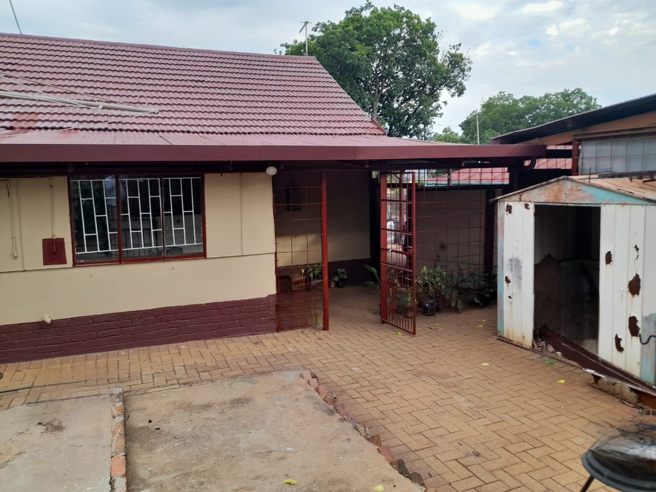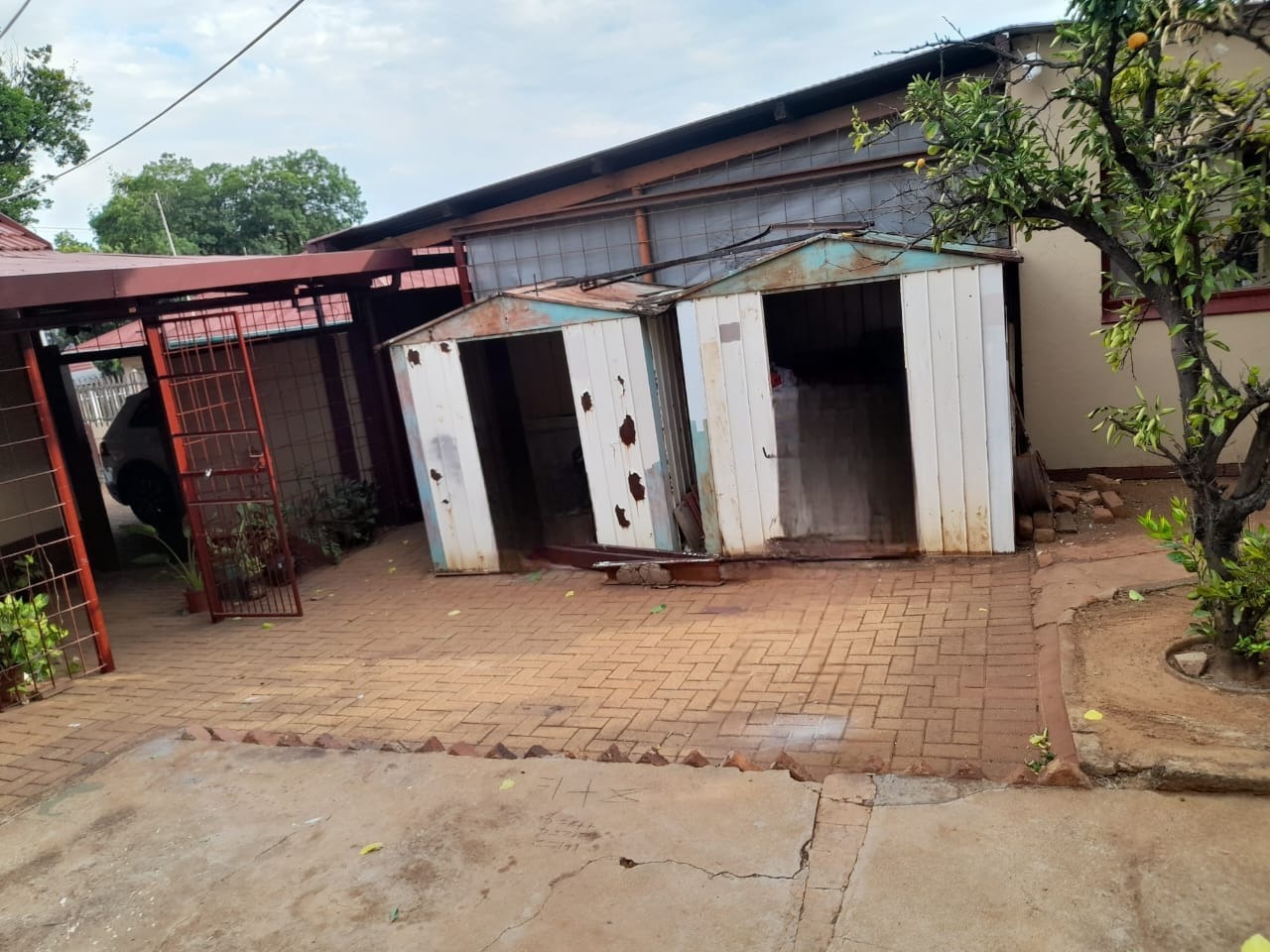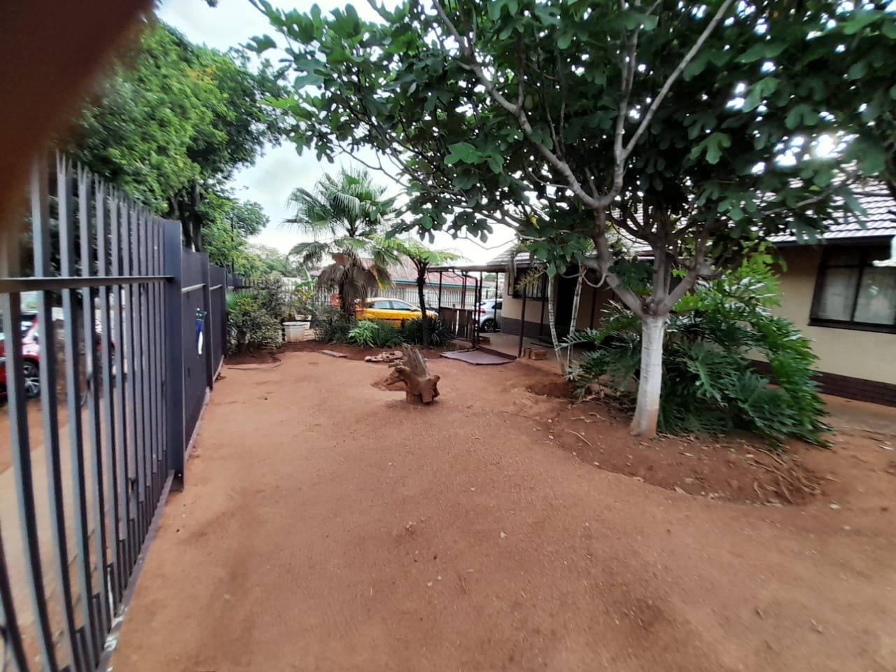 The exterior features a well-maintained house with a tiled roof, complemented by mature trees that provide natural shade and privacy. The spacious outdoor area, while unpaved, offers ample room for future landscaping and includes a wendy house for additional storage or utility. Secure parking is provided with one garage and two additional parking spaces for convenience.