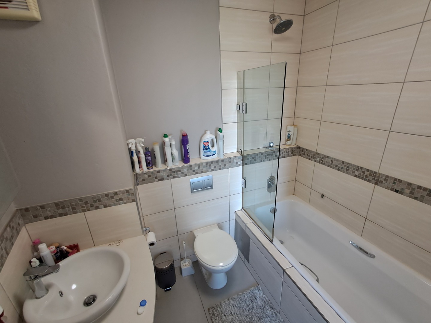 The interior of this apartment is thoughtfully designed for comfort and functionality. It features an open-plan layout encompassing a spacious lounge, a dedicated dining area, and a well-appointed kitchen, perfect for both daily living and entertaining. Modern tiling and fixtures are evident throughout, including the sleek bathrooms, one of which showcases a contemporary glass shower enclosure and mosaic floor tiling.