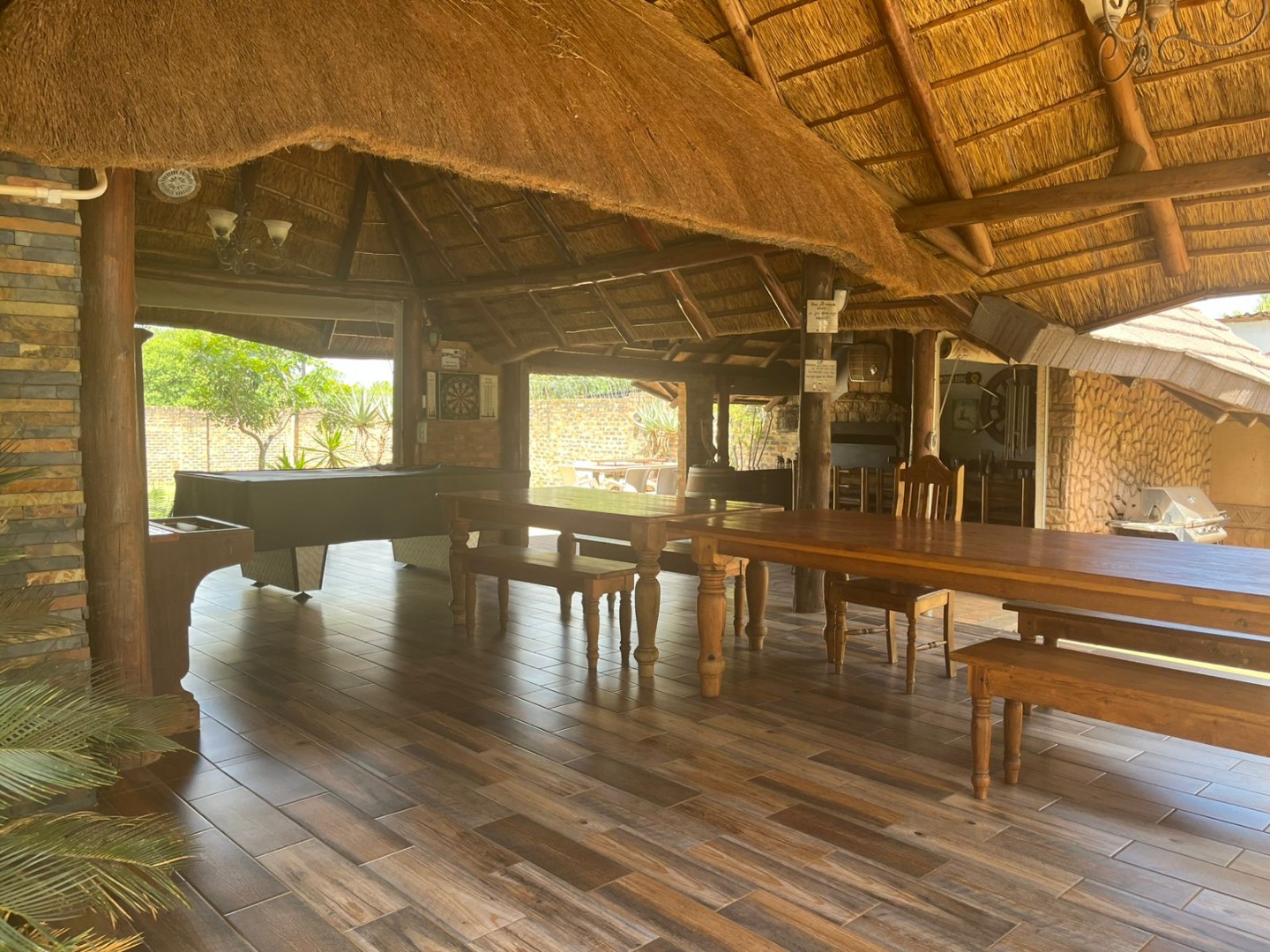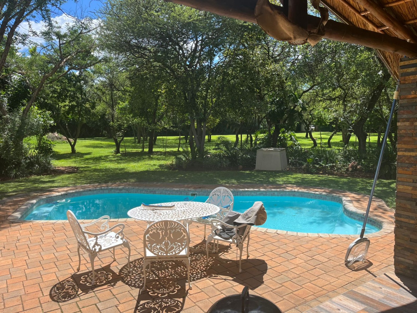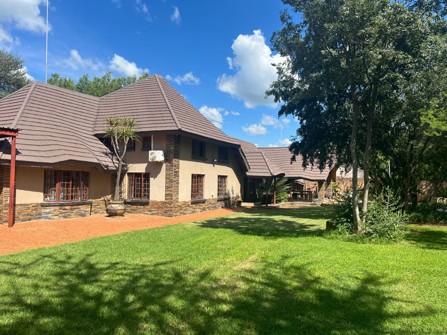 Discover a unique property in Kameeldrift East, Pretoria, South Africa, offering a blend of rustic charm and comfortable living. The exterior immediately captivates with its distinctive thatched and tiled roofs, stone cladding, and lush, well-maintained gardens featuring mature trees and paved pathways. A standout feature is the charming treehouse, providing a whimsical retreat and enhancing the property's kerb appeal. Inside, the home presents a spacious, open-plan layout with a lounge, kitchen, and an inviting dining area. The interior boasts characterful thatched ceilings and exposed wooden beams, complemented by a mix of durable tiled and warm wooden flooring. Large windows, fitted with security bars, ensure ample natural light throughout the living spaces. This residence offers five comfortable bedrooms and four bathrooms, providing ample accommodation for a family. Built-in wardrobes in the bedrooms offer practical storage solutions. For outdoor enjoyment, the property features a refreshing pool, a lapa, a patio, and a built-in braai, perfect for entertaining. The expansive garden provides a serene environment, while a large carport accommodates multiple vehicles. Adding to its versatility, the property includes a flatlet and staff quarters, catering to various needs. The presence of security bars on windows underscores a focus on safety. Located in Kameeldrift East, this home offers a tranquil lifestyle within reach of Pretoria amenities. Key Features: * 5 Bedrooms, 4 Bathrooms * Unique Thatched and Tiled Roofs * Spacious Open-Plan Living * Inviting Pool and Lapa * Built-in Braai and Patio * Charming Treehouse Feature * Flatlet and Staff Quarters * Ample Parking (6 bays, 1 garage)