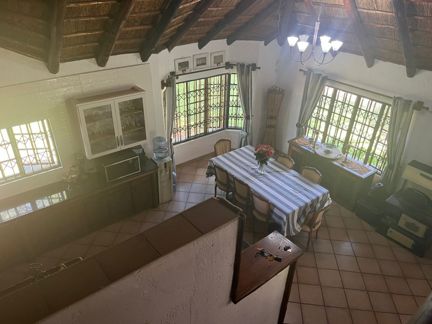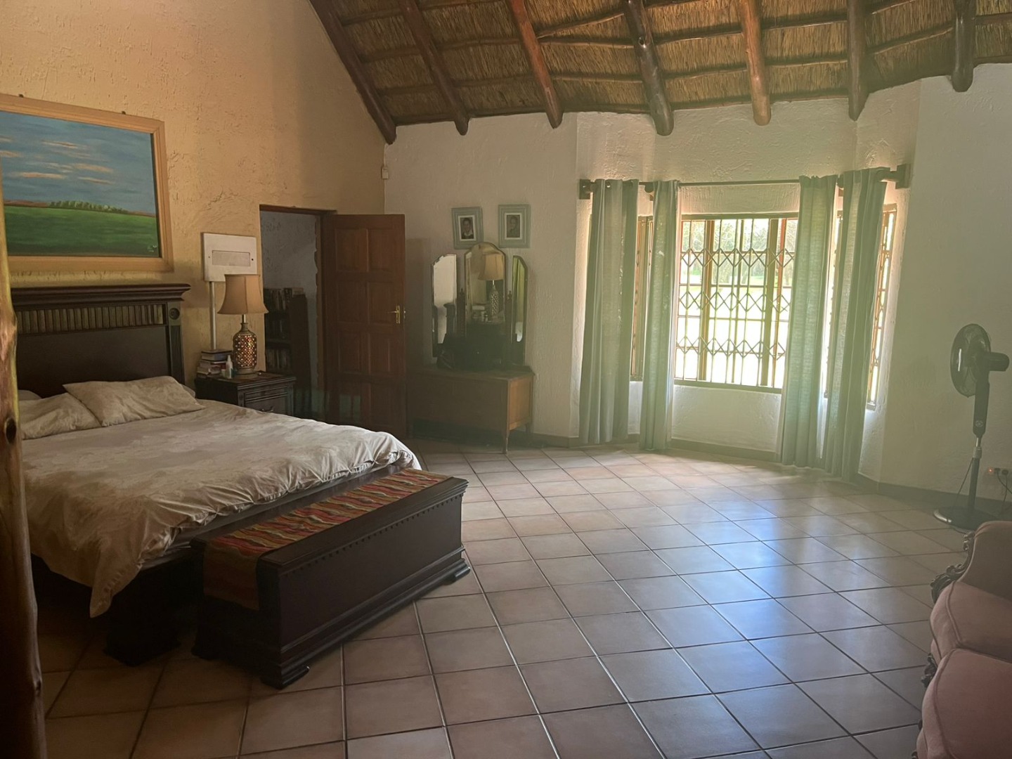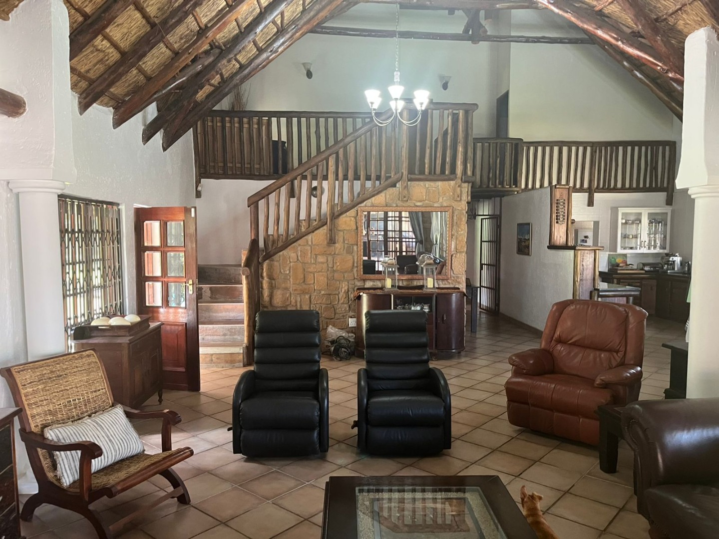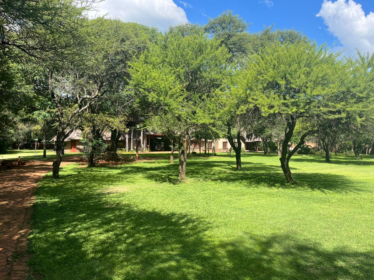 Discover a unique property in Kameeldrift East, Pretoria, South Africa, offering a blend of rustic charm and comfortable living. The exterior immediately captivates with its distinctive thatched and tiled roofs, stone cladding, and lush, well-maintained gardens featuring mature trees and paved pathways. A standout feature is the charming treehouse, providing a whimsical retreat and enhancing the property's kerb appeal. Inside, the home presents a spacious, open-plan layout with a lounge, kitchen, and an inviting dining area. The interior boasts characterful thatched ceilings and exposed wooden beams, complemented by a mix of durable tiled and warm wooden flooring. Large windows, fitted with security bars, ensure ample natural light throughout the living spaces. This residence offers five comfortable bedrooms and four bathrooms, providing ample accommodation for a family. Built-in wardrobes in the bedrooms offer practical storage solutions. For outdoor enjoyment, the property features a refreshing pool, a lapa, a patio, and a built-in braai, perfect for entertaining. The expansive garden provides a serene environment, while a large carport accommodates multiple vehicles. Adding to its versatility, the property includes a flatlet and staff quarters, catering to various needs. The presence of security bars on windows underscores a focus on safety. Located in Kameeldrift East, this home offers a tranquil lifestyle within reach of Pretoria amenities. Key Features: * 5 Bedrooms, 4 Bathrooms * Unique Thatched and Tiled Roofs * Spacious Open-Plan Living * Inviting Pool and Lapa * Built-in Braai and Patio * Charming Treehouse Feature * Flatlet and Staff Quarters * Ample Parking (6 bays, 1 garage)