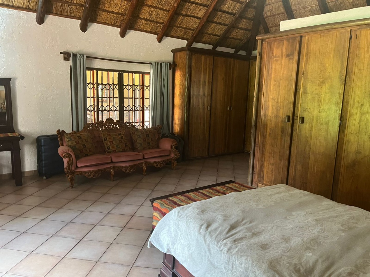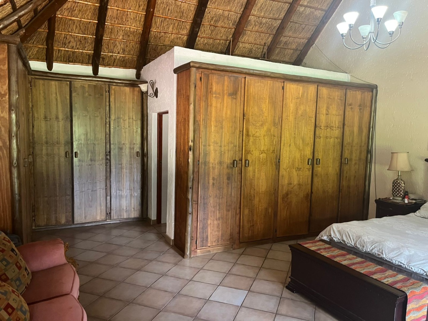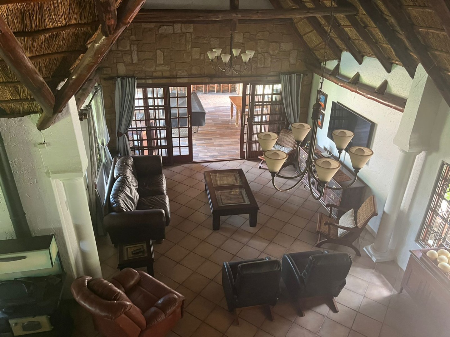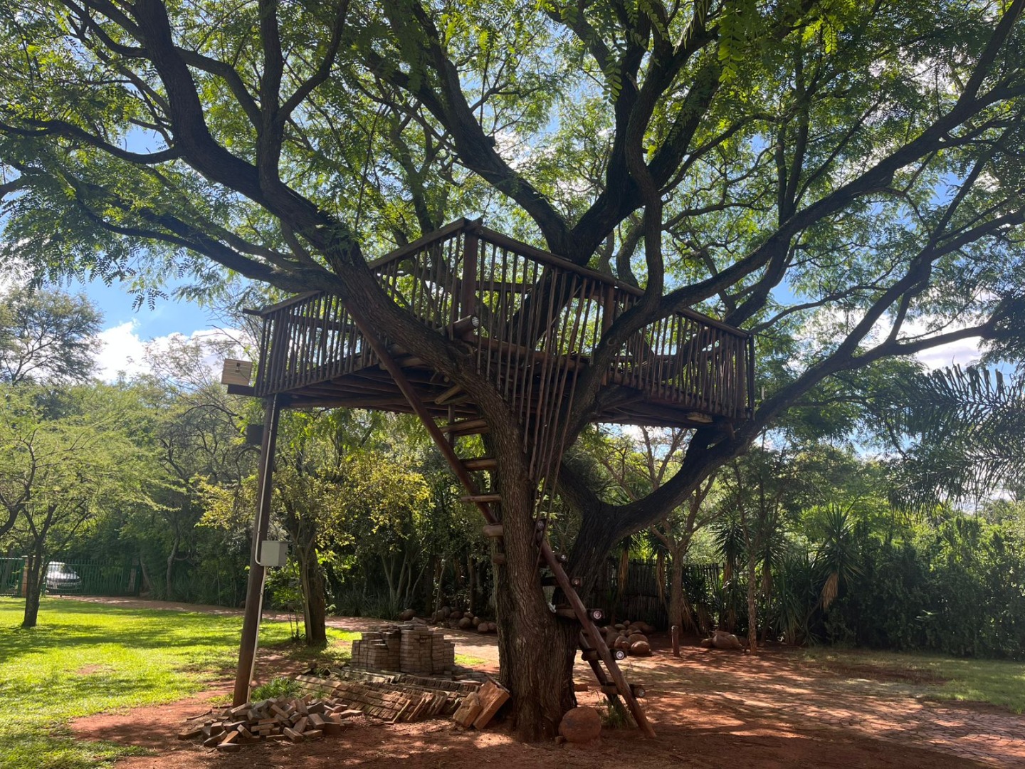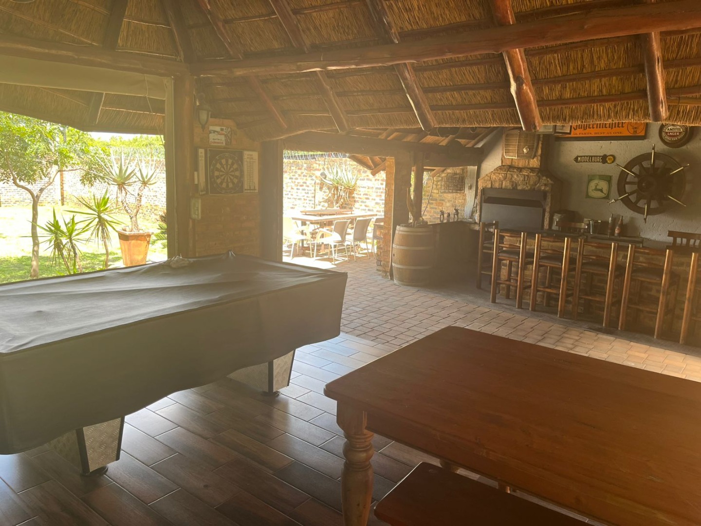 Discover a unique property in Kameeldrift East, Pretoria, South Africa, offering a blend of rustic charm and comfortable living. The exterior immediately captivates with its distinctive thatched and tiled roofs, stone cladding, and lush, well-maintained gardens featuring mature trees and paved pathways. A standout feature is the charming treehouse, providing a whimsical retreat and enhancing the property's kerb appeal. Inside, the home presents a spacious, open-plan layout with a lounge, kitchen, and an inviting dining area. The interior boasts characterful thatched ceilings and exposed wooden beams, complemented by a mix of durable tiled and warm wooden flooring. Large windows, fitted with security bars, ensure ample natural light throughout the living spaces. This residence offers five comfortable bedrooms and four bathrooms, providing ample accommodation for a family. Built-in wardrobes in the bedrooms offer practical storage solutions. For outdoor enjoyment, the property features a refreshing pool, a lapa, a patio, and a built-in braai, perfect for entertaining. The expansive garden provides a serene environment, while a large carport accommodates multiple vehicles. Adding to its versatility, the property includes a flatlet and staff quarters, catering to various needs. The presence of security bars on windows underscores a focus on safety. Located in Kameeldrift East, this home offers a tranquil lifestyle within reach of Pretoria amenities. Key Features: * 5 Bedrooms, 4 Bathrooms * Unique Thatched and Tiled Roofs * Spacious Open-Plan Living * Inviting Pool and Lapa * Built-in Braai and Patio * Charming Treehouse Feature * Flatlet and Staff Quarters * Ample Parking (6 bays, 1 garage)