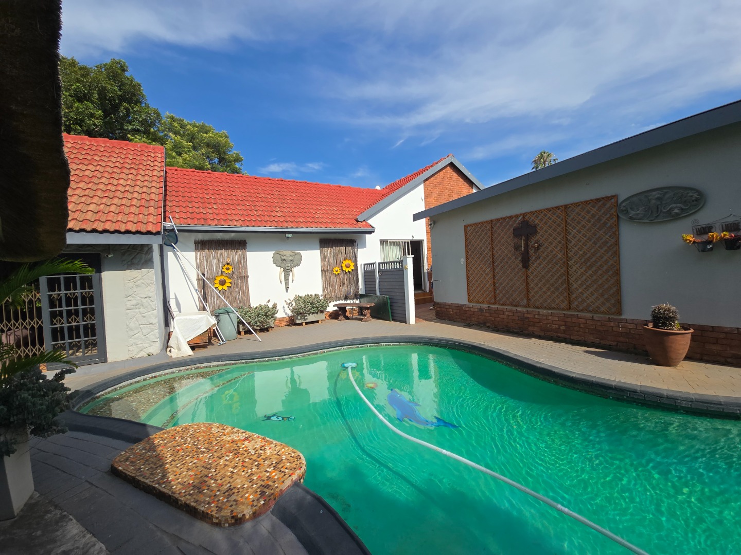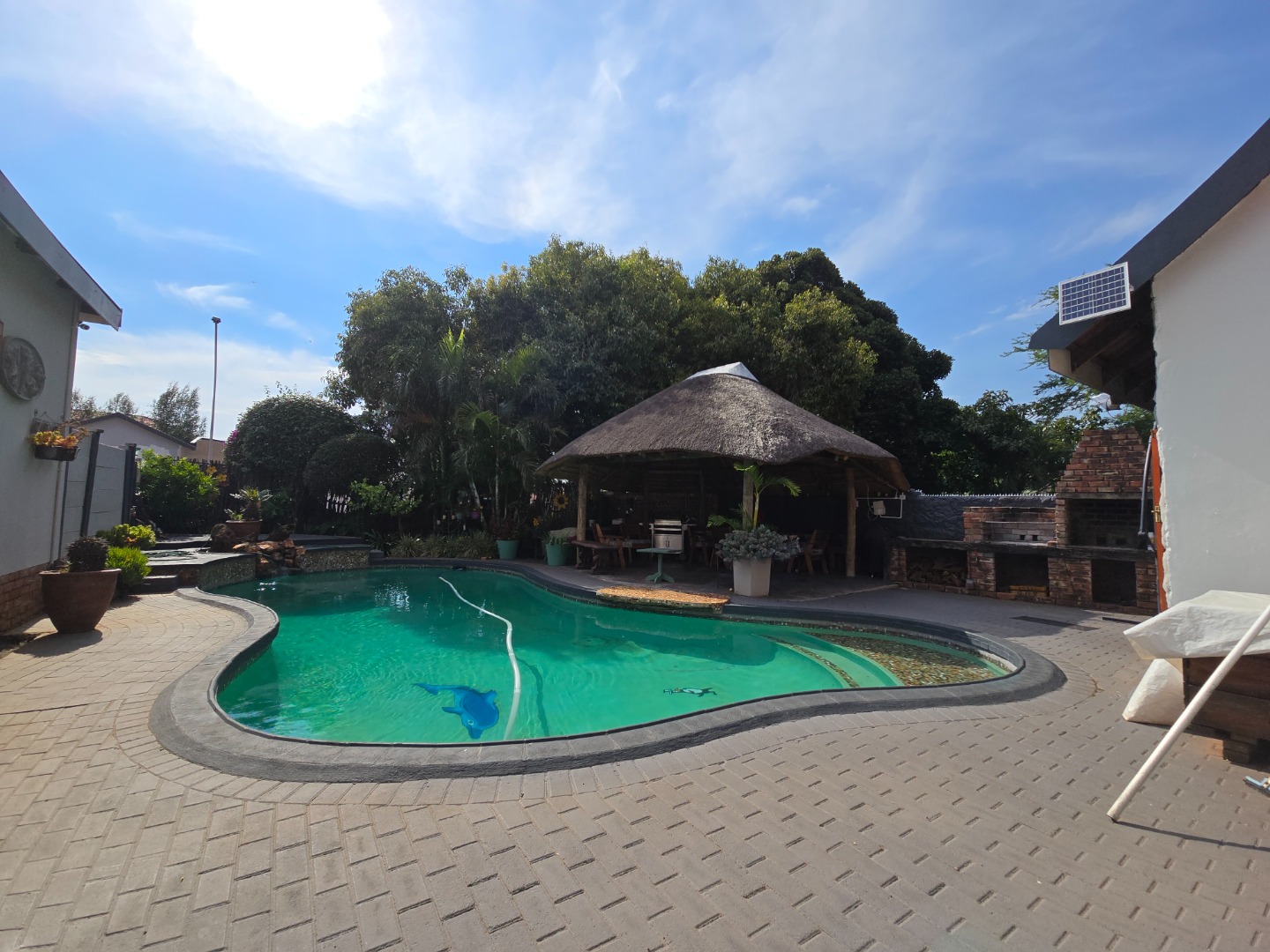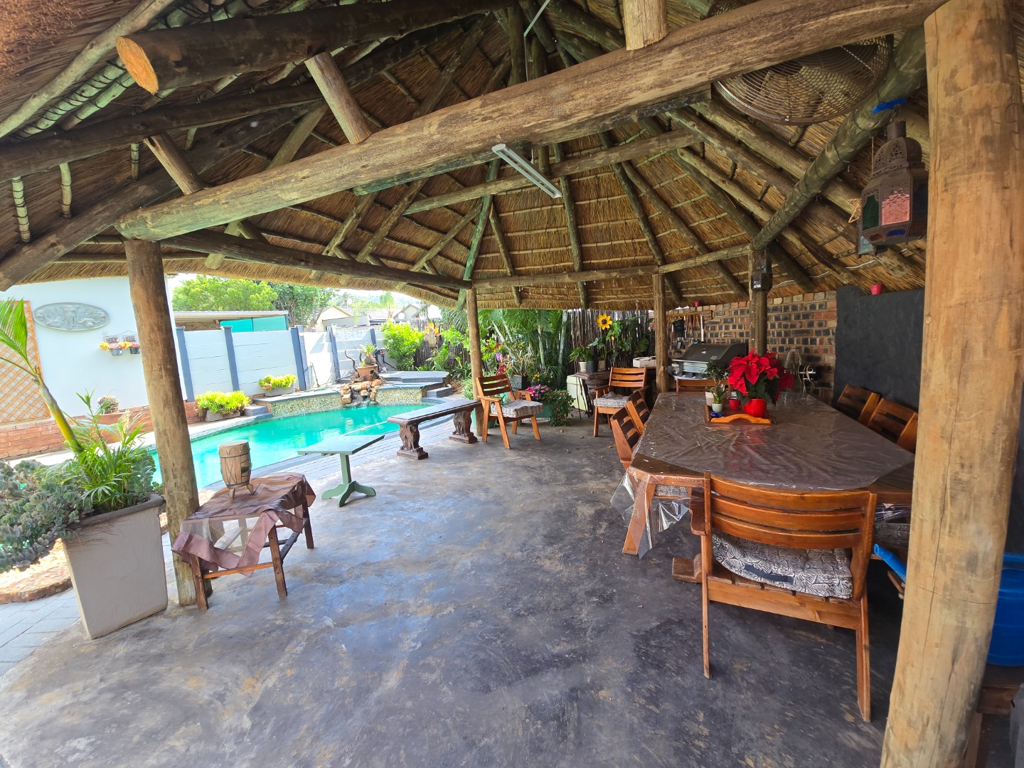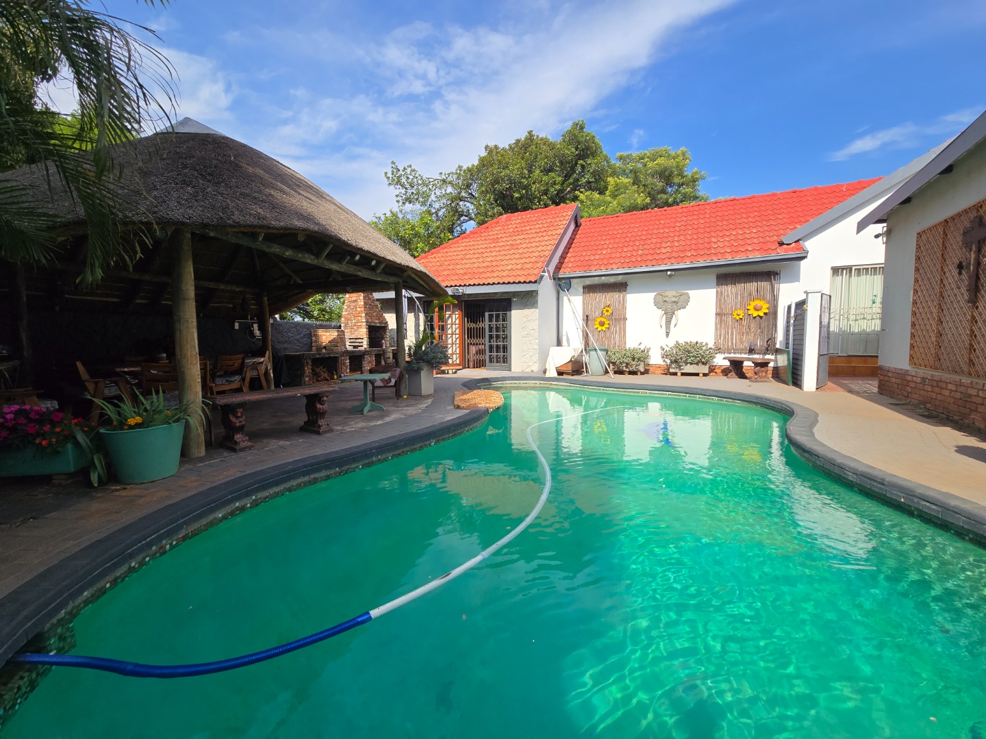 Outdoor living is a major feature of this home. Enjoy a large swimming pool, a lapa, and two braai areas, creating the perfect setting for hosting family gatherings, weekend braais, and relaxed social occasions. The beautifully landscaped garden adds to the charm, featuring a unique Moroccan-style seating area tucked into a quiet corner — a tranquil space to unwind and enjoy the outdoors.