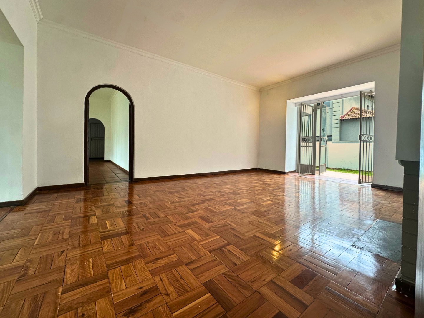 Inside, an entrance hall leads to expansive living spaces, including a lounge, a family TV room, and a dining area, all filled with natural light and character features such as arched doorways, parquet flooring, and crown molding. The kitchen provides ample storage, a pantry, and solid wooden cabinetry with a built-in oven, stovetop, and double sink.