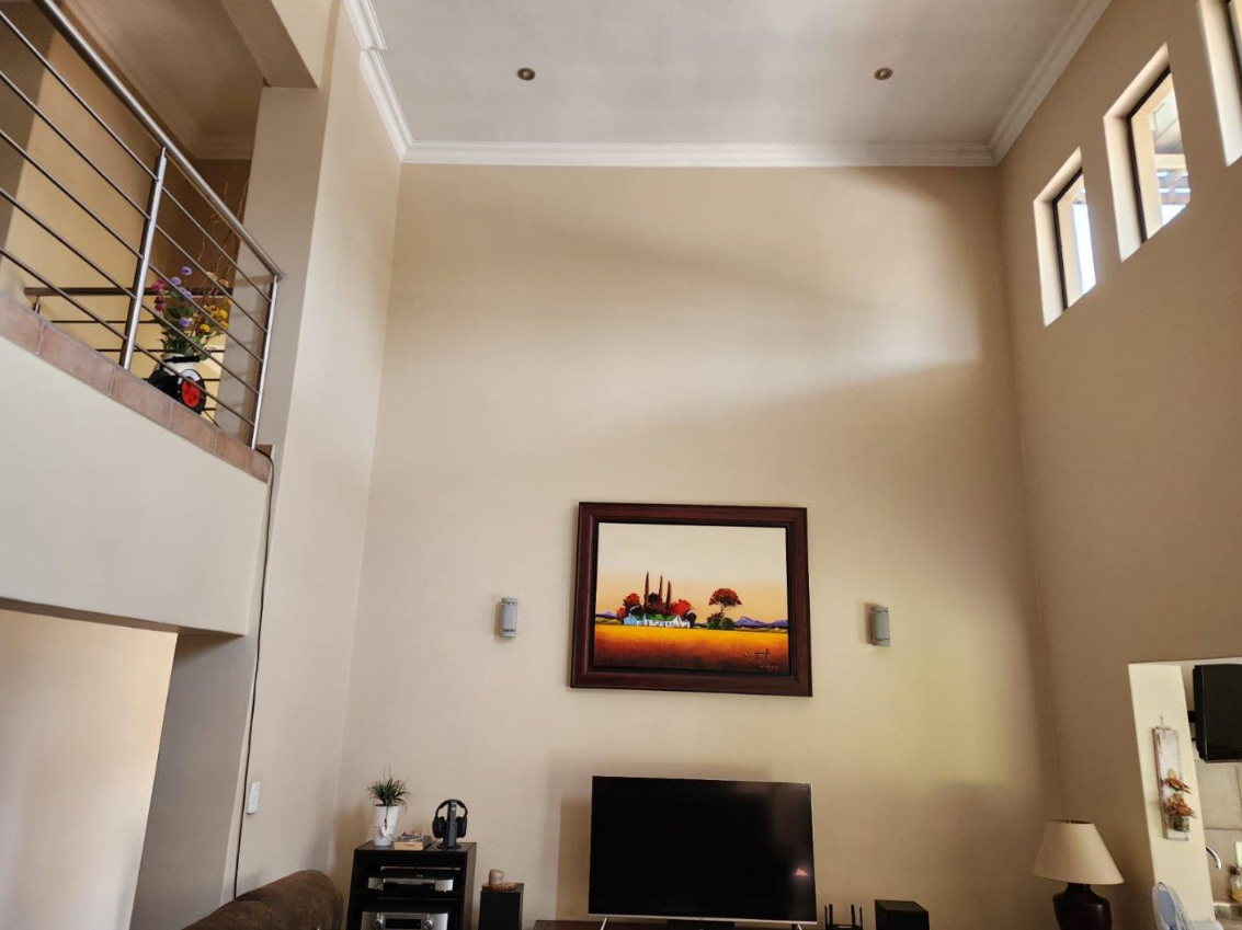 The flowing living areas include an impressive TV lounge with striking double-volume ceilings, creating an airy and inviting atmosphere. Upstairs, the private main bedroom offers a true retreat, complete with a full en-suite bathroom, his-and-hers closets, and its own balcony with stunning views. Two additional bedrooms are located on the ground floor and share a full bathroom, while a dedicated study provides an ideal work-from-home space.