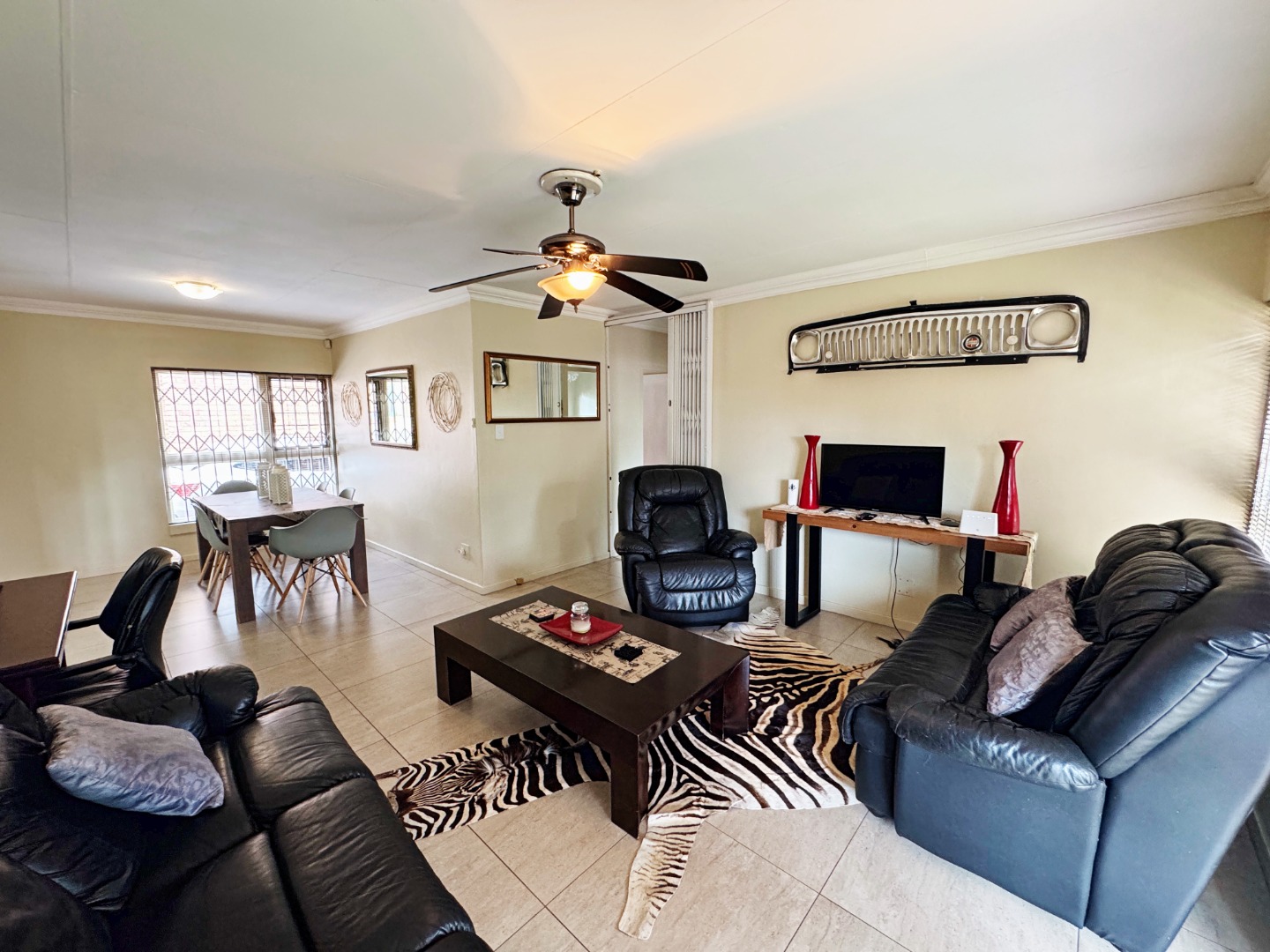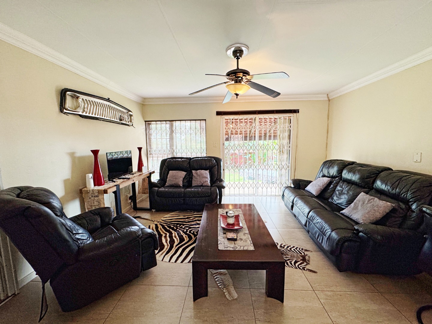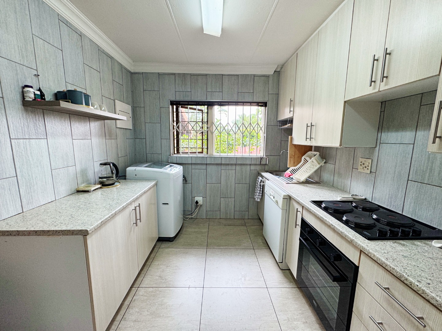 Inside, the open-plan lounge and dining area have tiled floors, a ceiling fan, and a large sliding door with a security gate leading to the garden. The modern kitchen includes light wood-grain cupboards, with space for a top-loader washing machine, large fridge, and microwave.