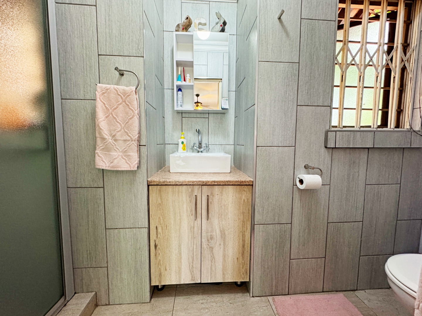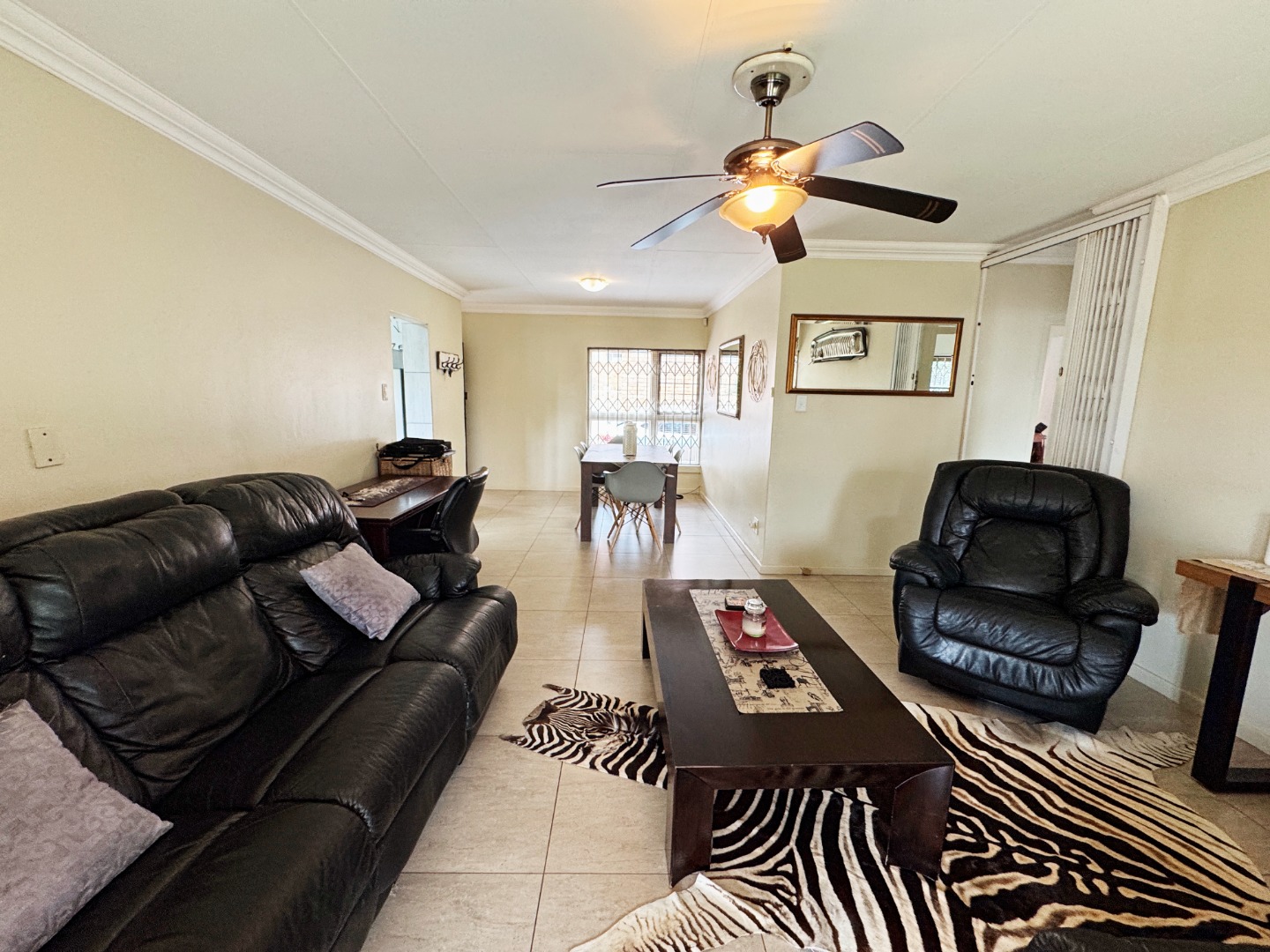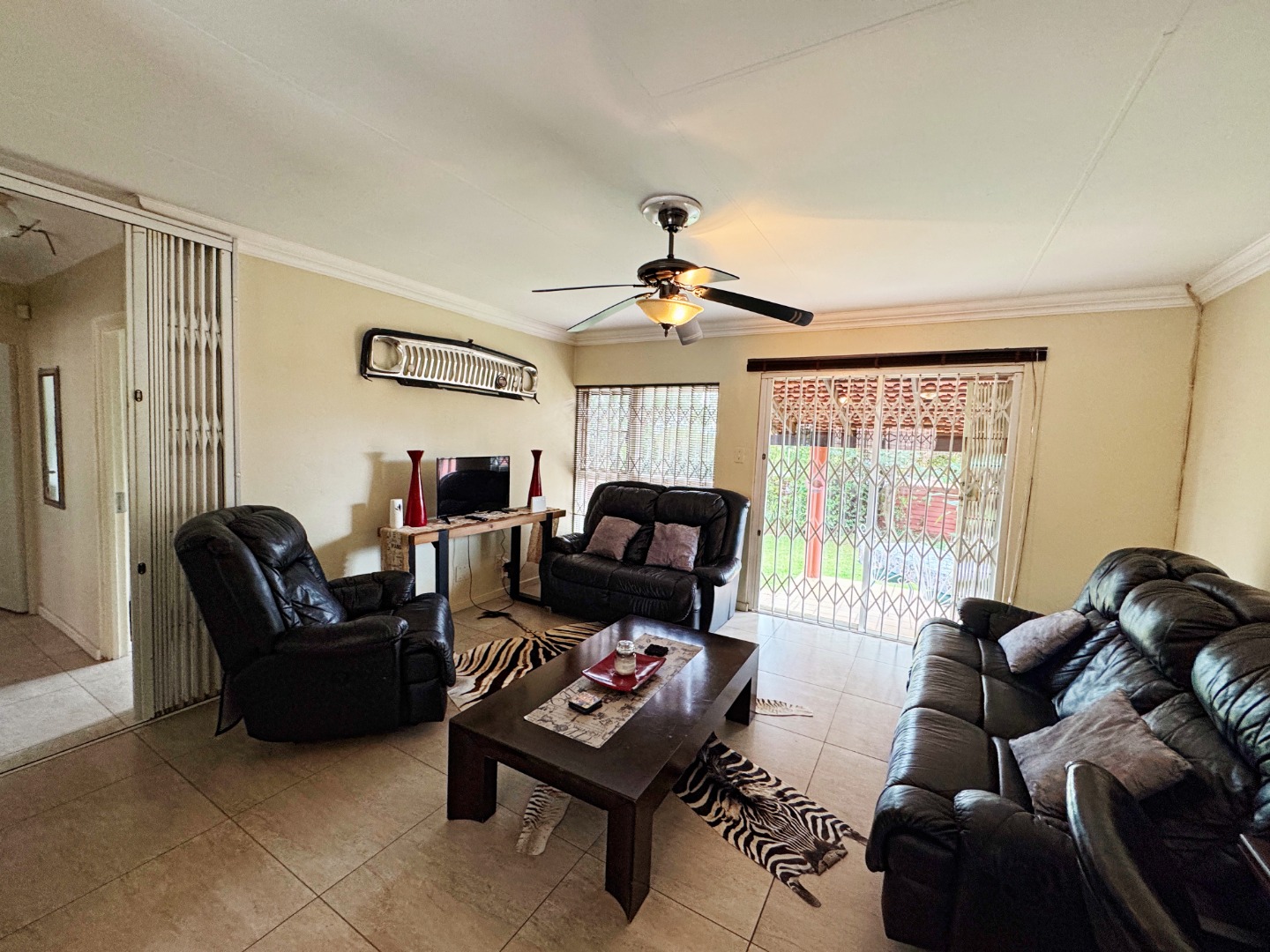 Inside, the open-plan lounge and dining area have tiled floors, a ceiling fan, and a large sliding door with a security gate leading to the garden. The modern kitchen includes light wood-grain cupboards, with space for a top-loader washing machine, large fridge, and microwave.