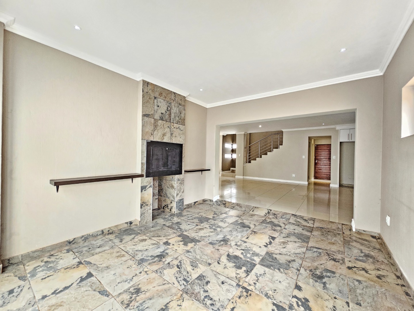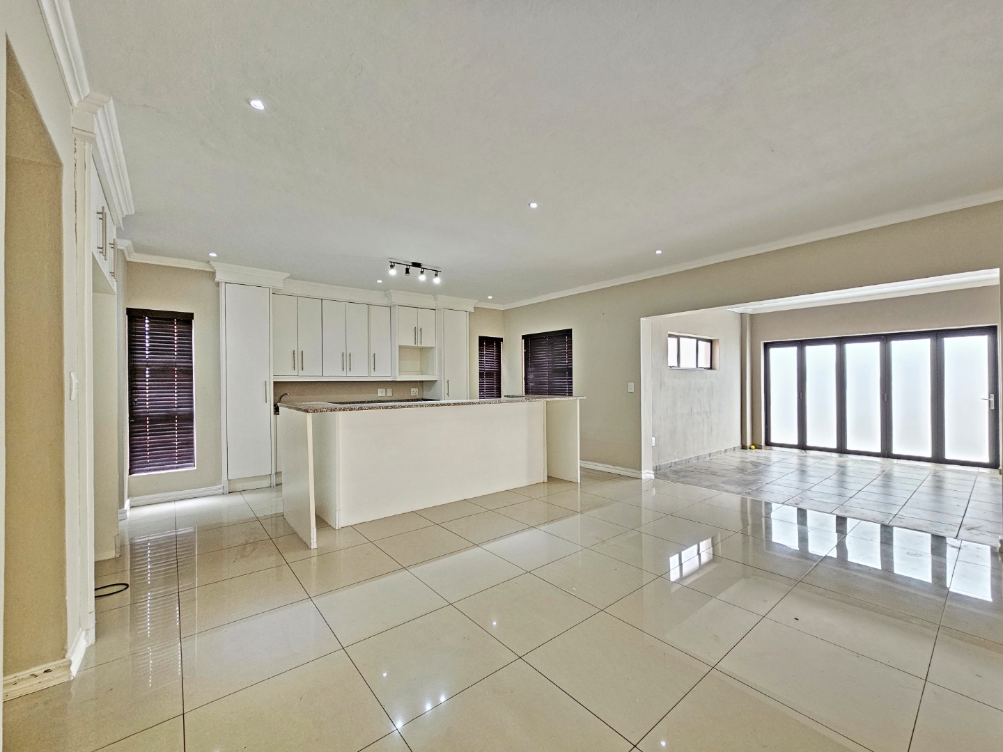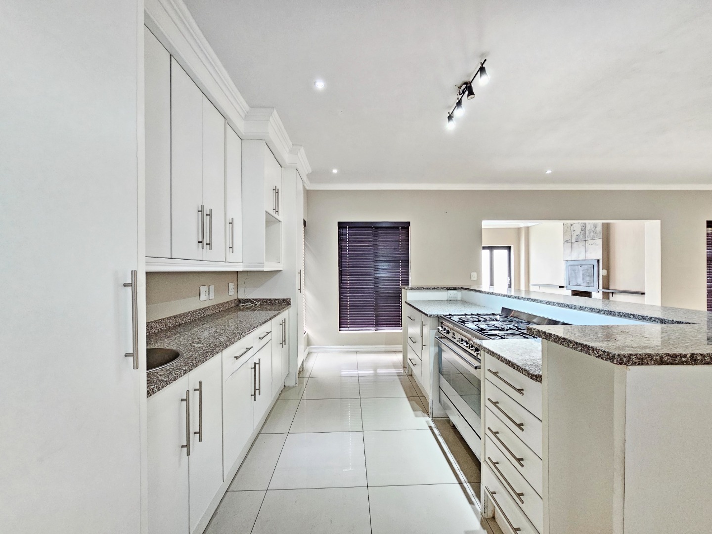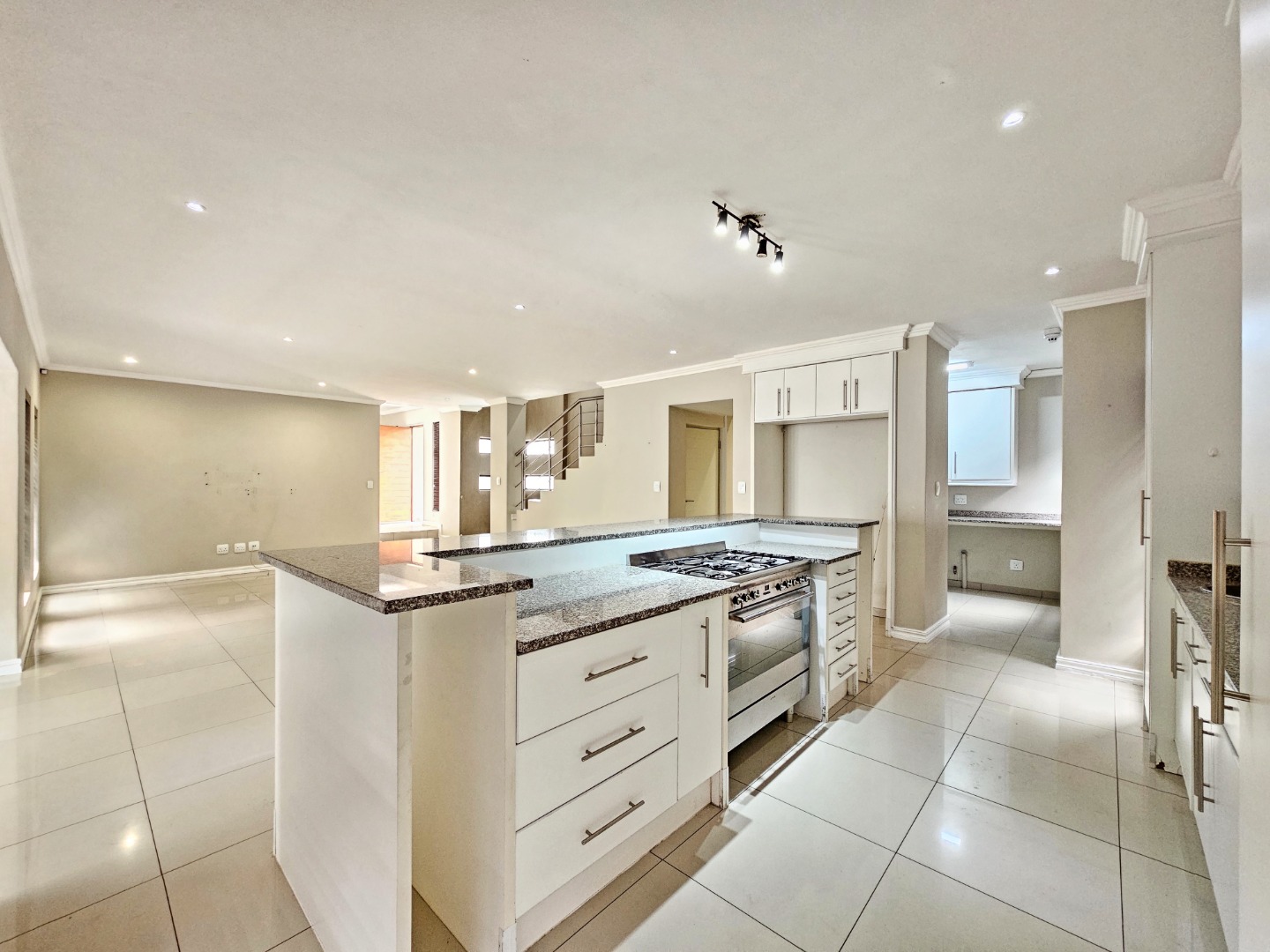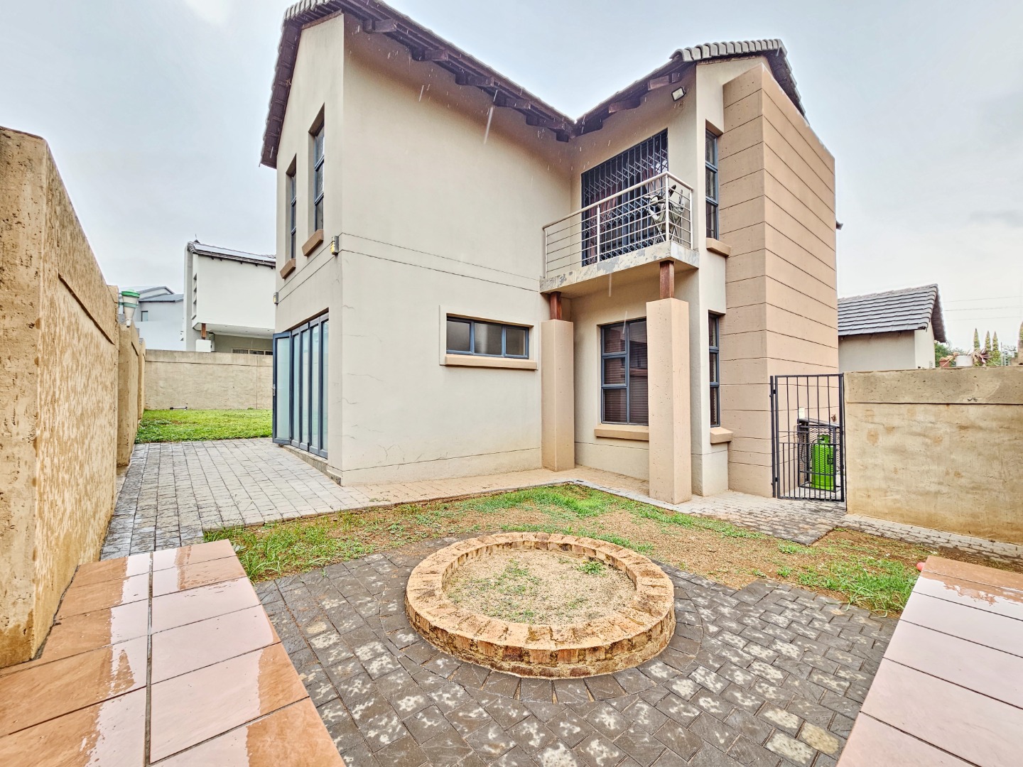 The ground floor opens into light-filled, interconnected living spaces that include a stylish lounge, dining area, and family TV room. Large sliding doors extend the living area onto an enclosed patio fitted with a built-in braai, allowing effortless indoor-outdoor entertaining throughout the year. The contemporary kitchen serves as the heart of the home, featuring a gas stove, ample cabinetry, a separate scullery, and a walk-in pantry—ideal for anyone who enjoys cooking and hosting.