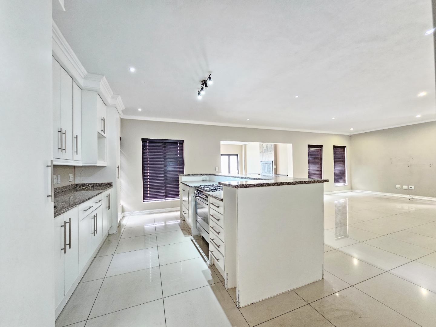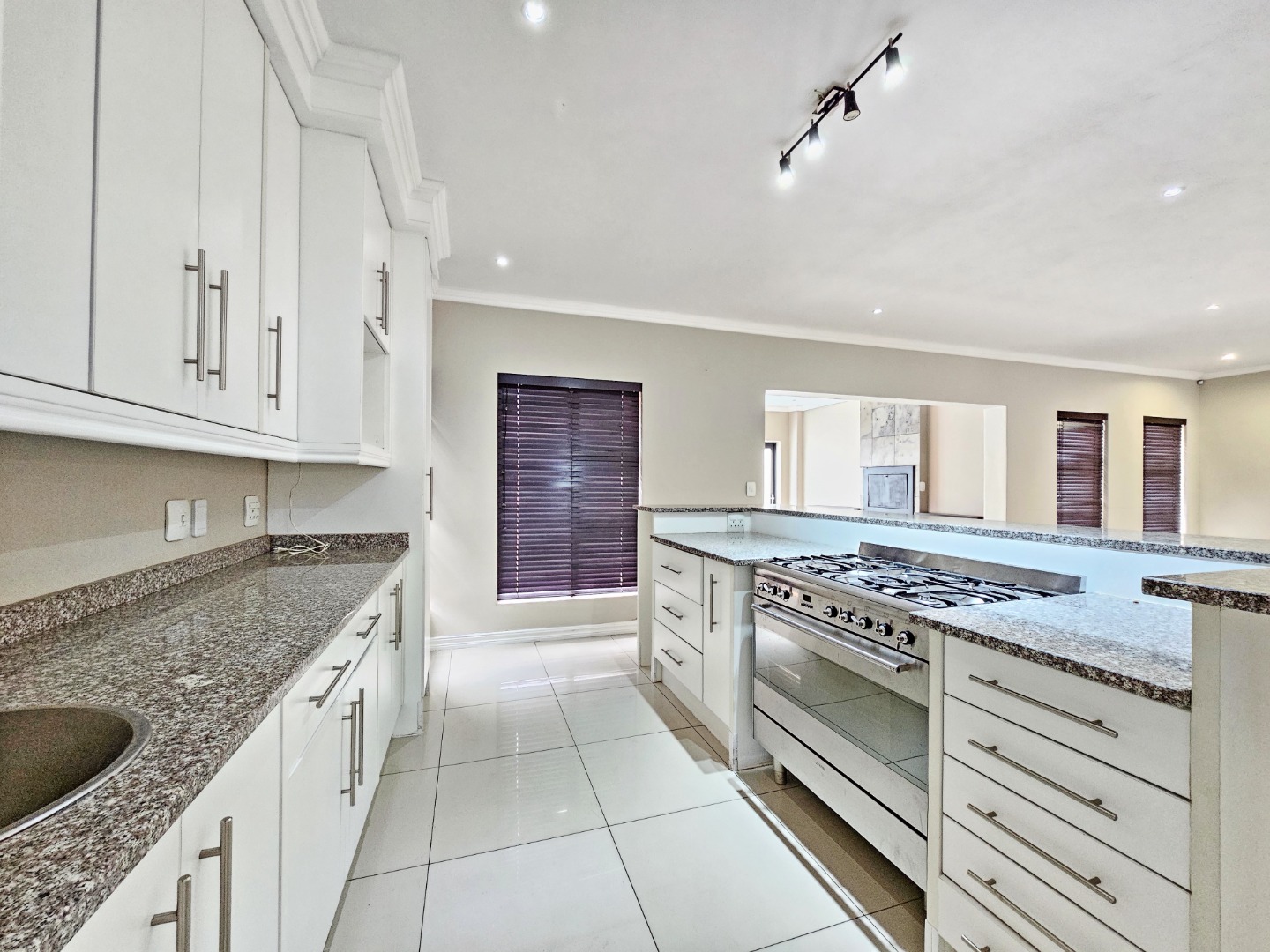The ground floor opens into light-filled, interconnected living spaces that include a stylish lounge, dining area, and family TV room. Large sliding doors extend the living area onto an enclosed patio fitted with a built-in braai, allowing effortless indoor-outdoor entertaining throughout the year. The contemporary kitchen serves as the heart of the home, featuring a gas stove, ample cabinetry, a separate scullery, and a walk-in pantry—ideal for anyone who enjoys cooking and hosting.