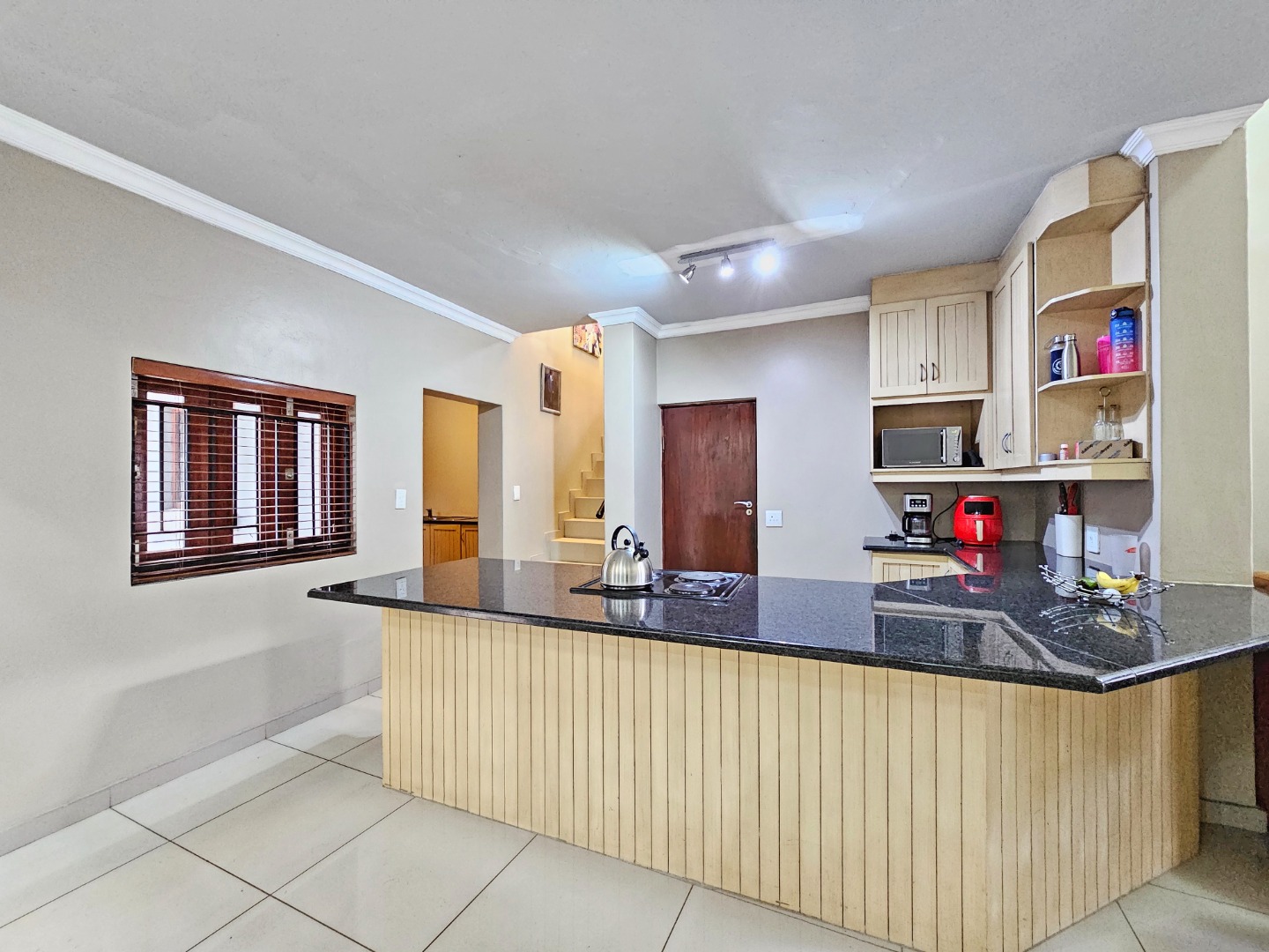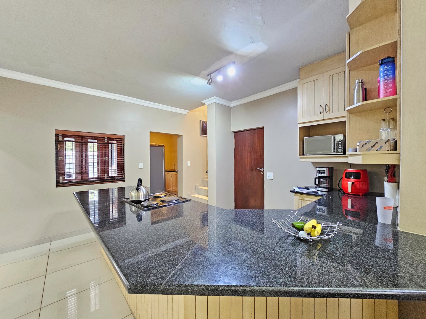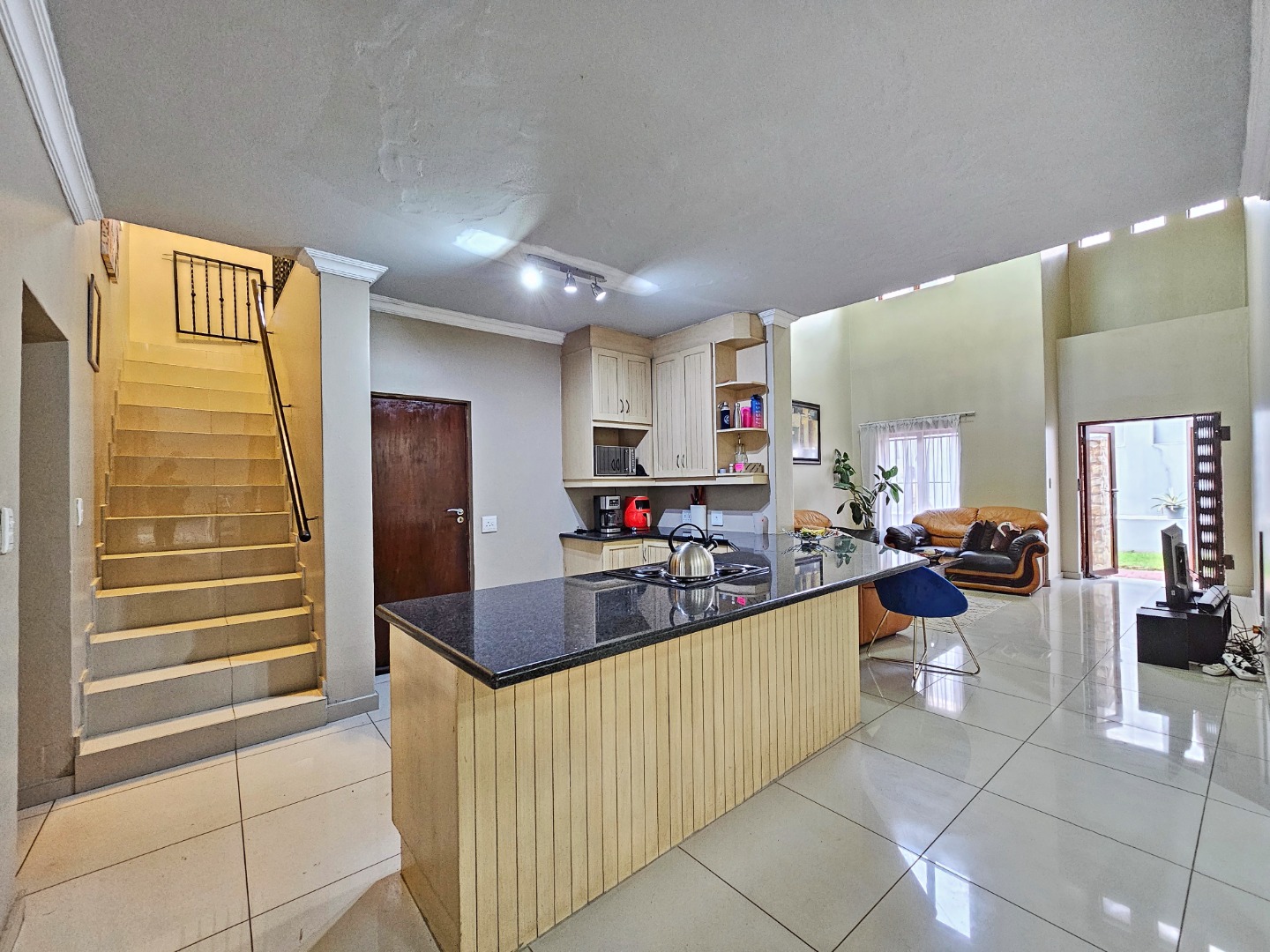Upon entering the home, you are welcomed by a spacious open-plan layout that seamlessly connects the kitchen, dining area, and comfortable living space. The modern kitchen is fitted with sleek granite countertops, generous cupboard space, and a separate scullery that provides additional convenience while keeping the main kitchen area neat and organized. This central living area creates an inviting environment that is perfect for both everyday living and entertaining guests.