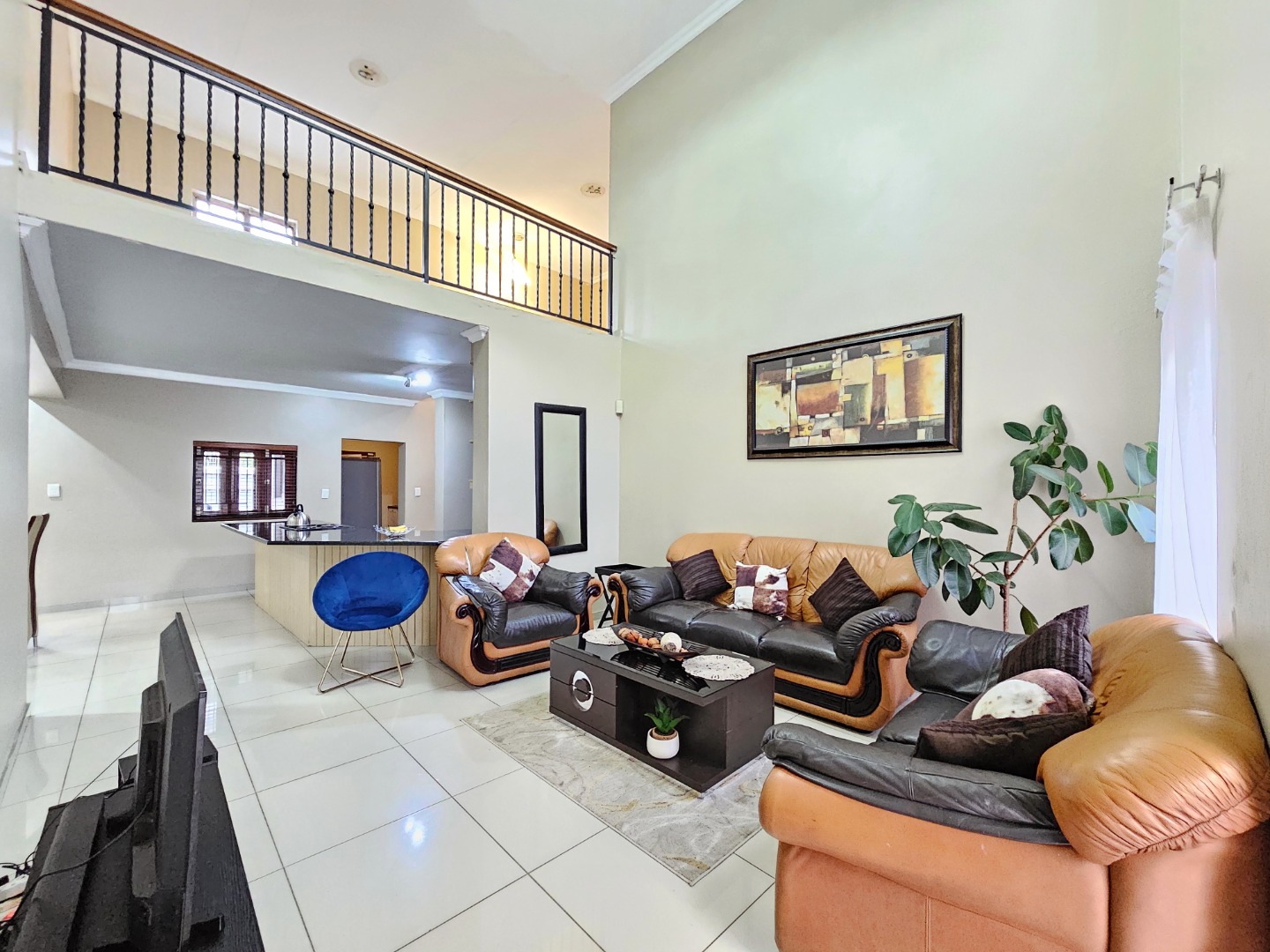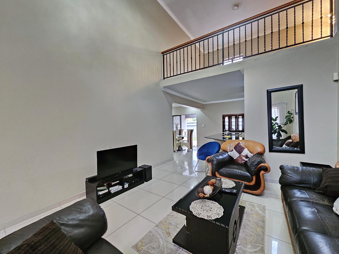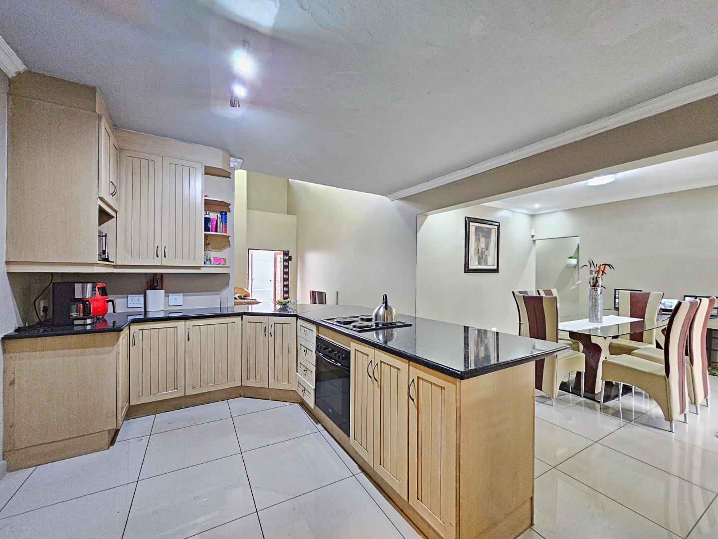 Upon entering the home, you are welcomed by a spacious open-plan layout that seamlessly connects the kitchen, dining area, and comfortable living space. The modern kitchen is fitted with sleek granite countertops, generous cupboard space, and a separate scullery that provides additional convenience while keeping the main kitchen area neat and organized. This central living area creates an inviting environment that is perfect for both everyday living and entertaining guests.