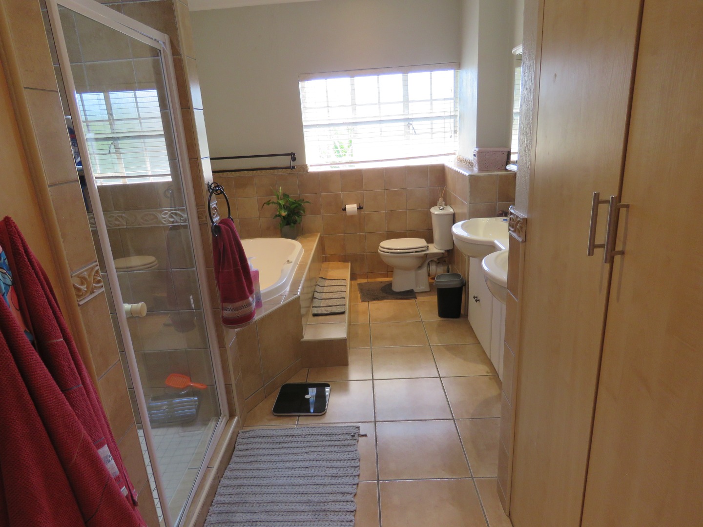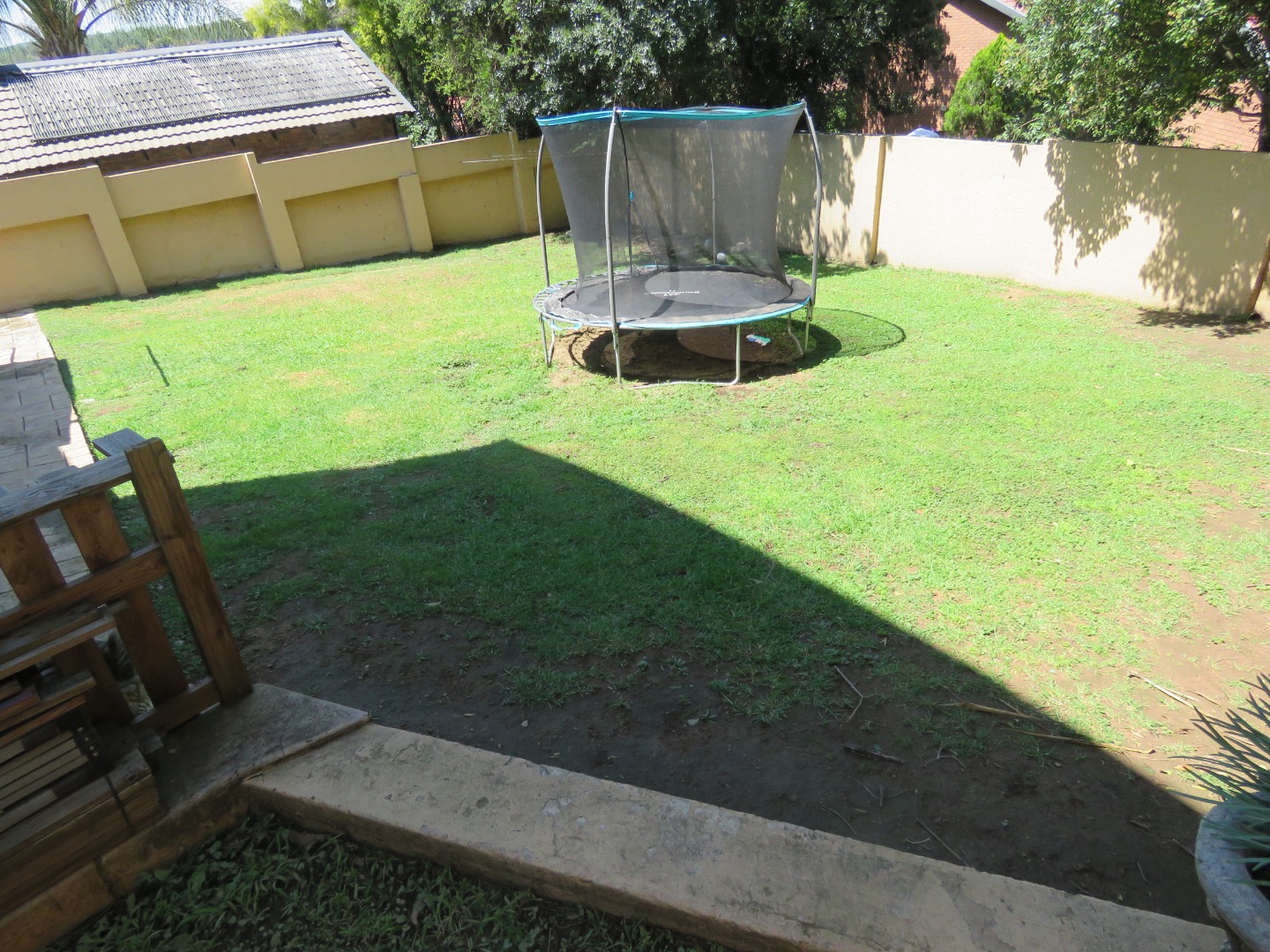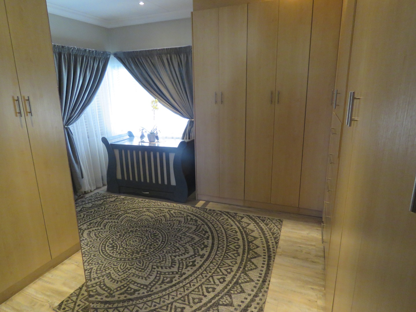 The exterior boasts a private patio, a refreshing swimming pool, and a lapa with a built-in braai, perfect for outdoor leisure. The 1081 sqm erf includes a well-maintained garden, paving, and a wendy house. This wendy house was equiped with electricity. A double garage provides secure parking, complemented by staff quarters and outside toilet with shower.