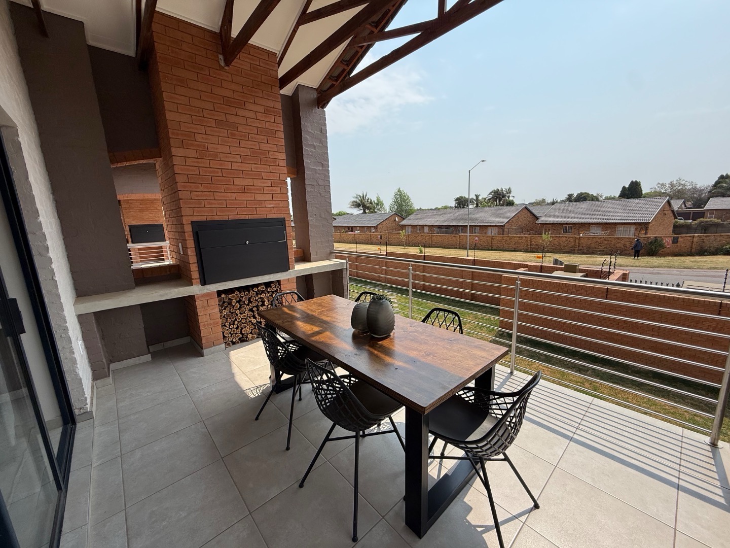 Step outside to an expansive patio, an entertainer's dream, complete with a built-in braai and stylish outdoor dining space. The vaulted ceiling with exposed wooden beams adds a touch of architectural charm, while the tiled flooring ensures easy upkeep. Two dedicated parking bays provide convenience and peace of mind.