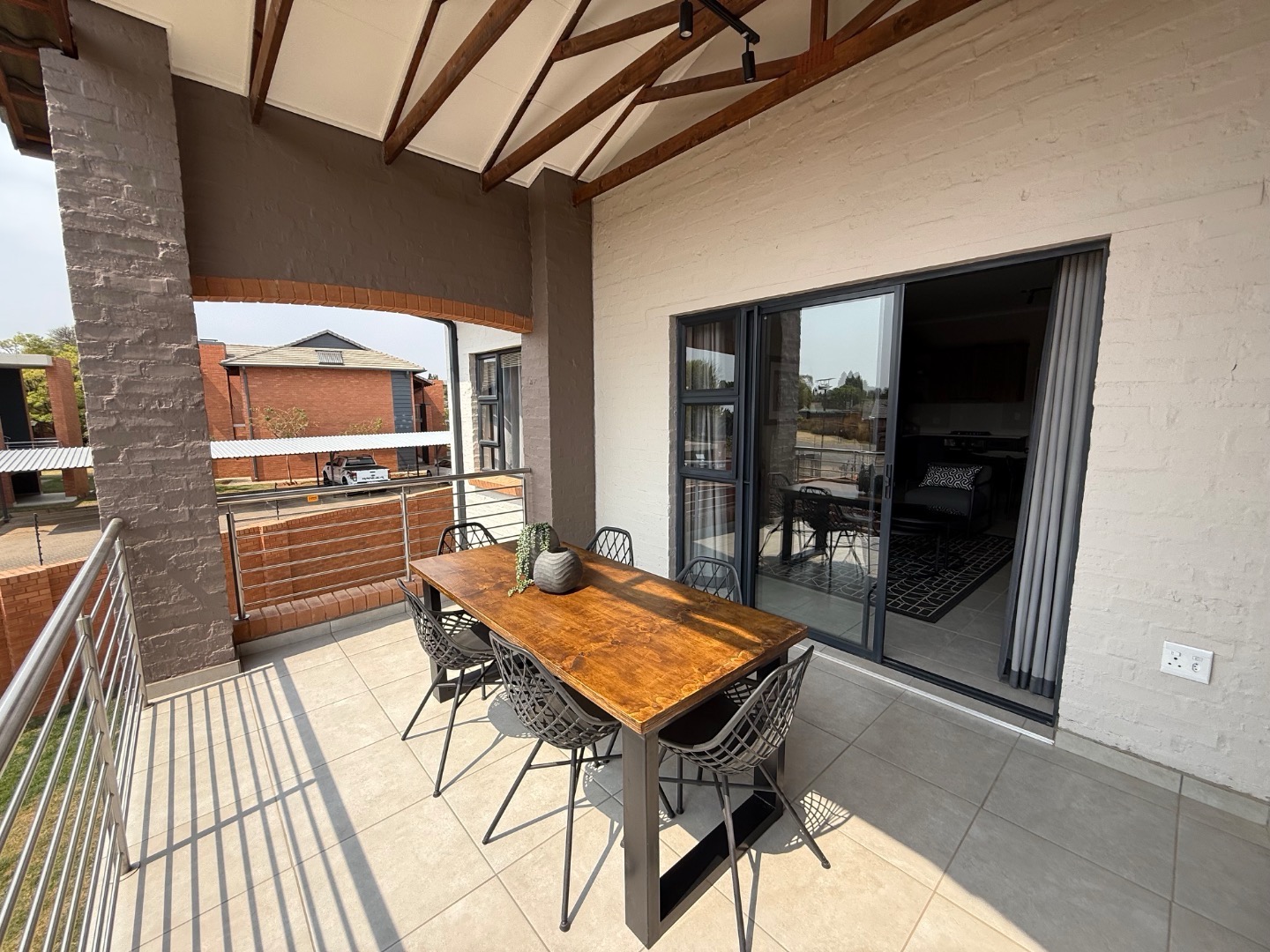 Step outside to an expansive patio, an entertainer's dream, complete with a built-in braai and stylish outdoor dining space. The vaulted ceiling with exposed wooden beams adds a touch of architectural charm, while the tiled flooring ensures easy upkeep. Two dedicated parking bays provide convenience and peace of mind.
