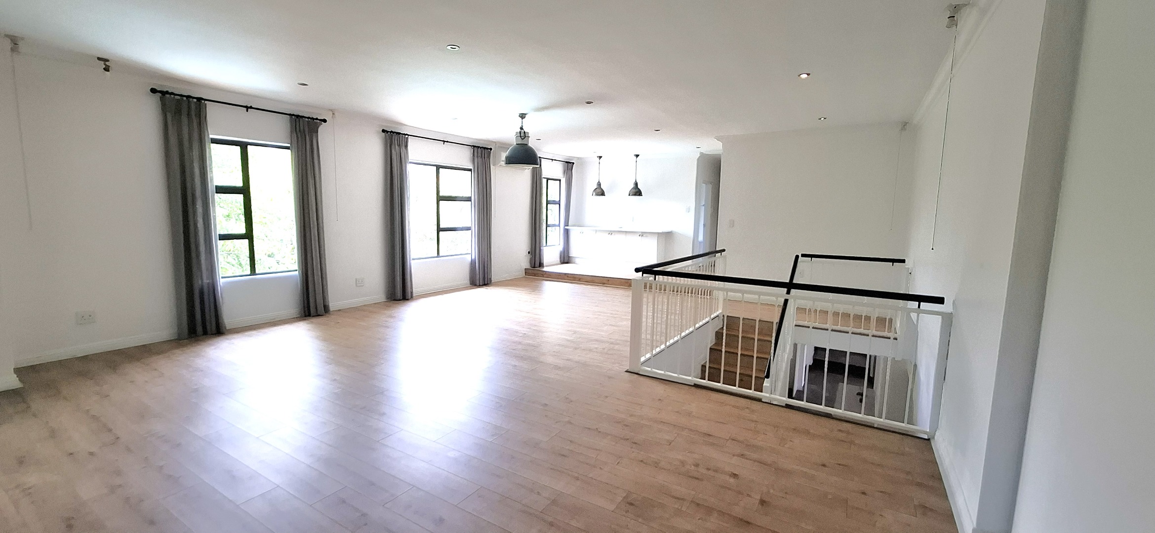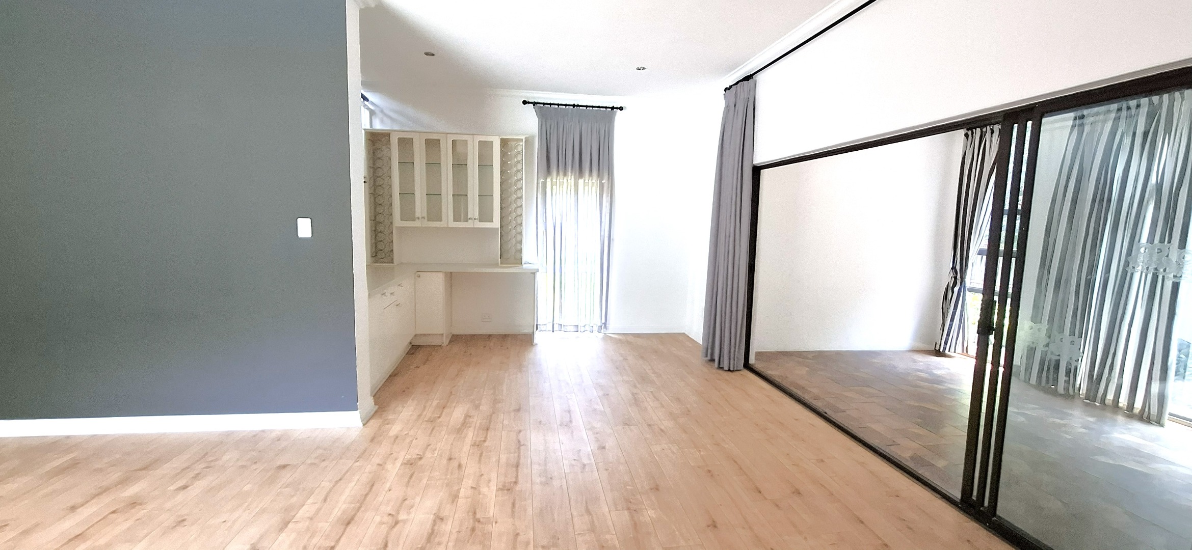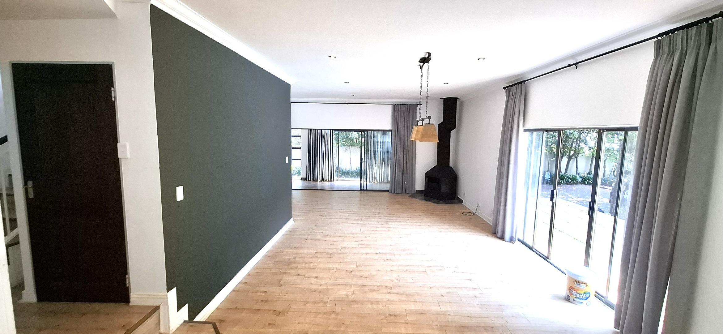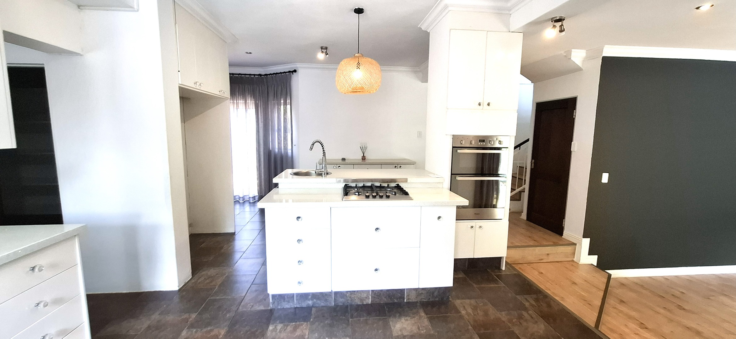 The ground floor is anchored by generous living areas that connect naturally with both indoor and outdoor spaces. The kitchen serves as the heart of the home, opening into the dining and lounge areas and complemented by a walk-in pantry and separate scullery. A dedicated entertainment room with built-in braai creates an inviting space for gatherings, while large doors lead out to the garden and pool area.