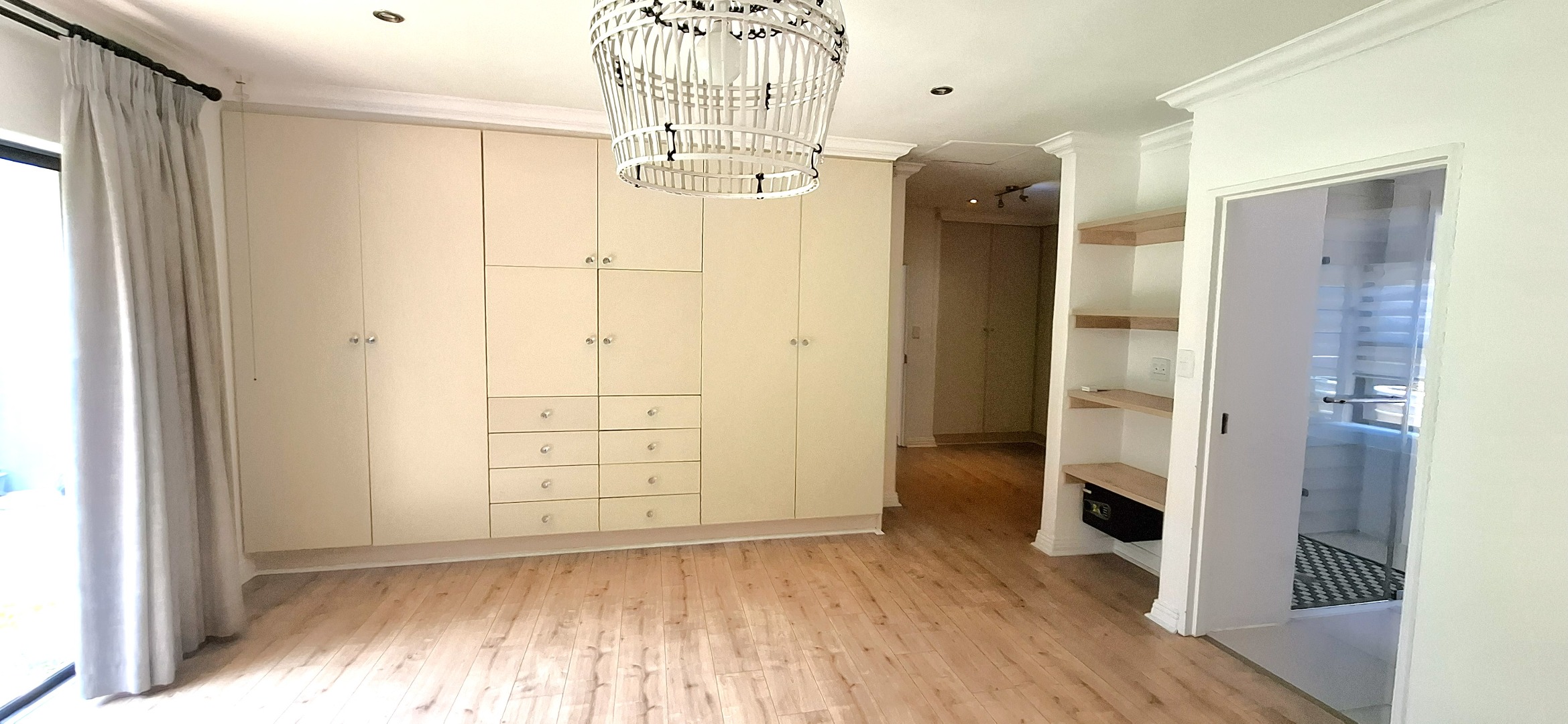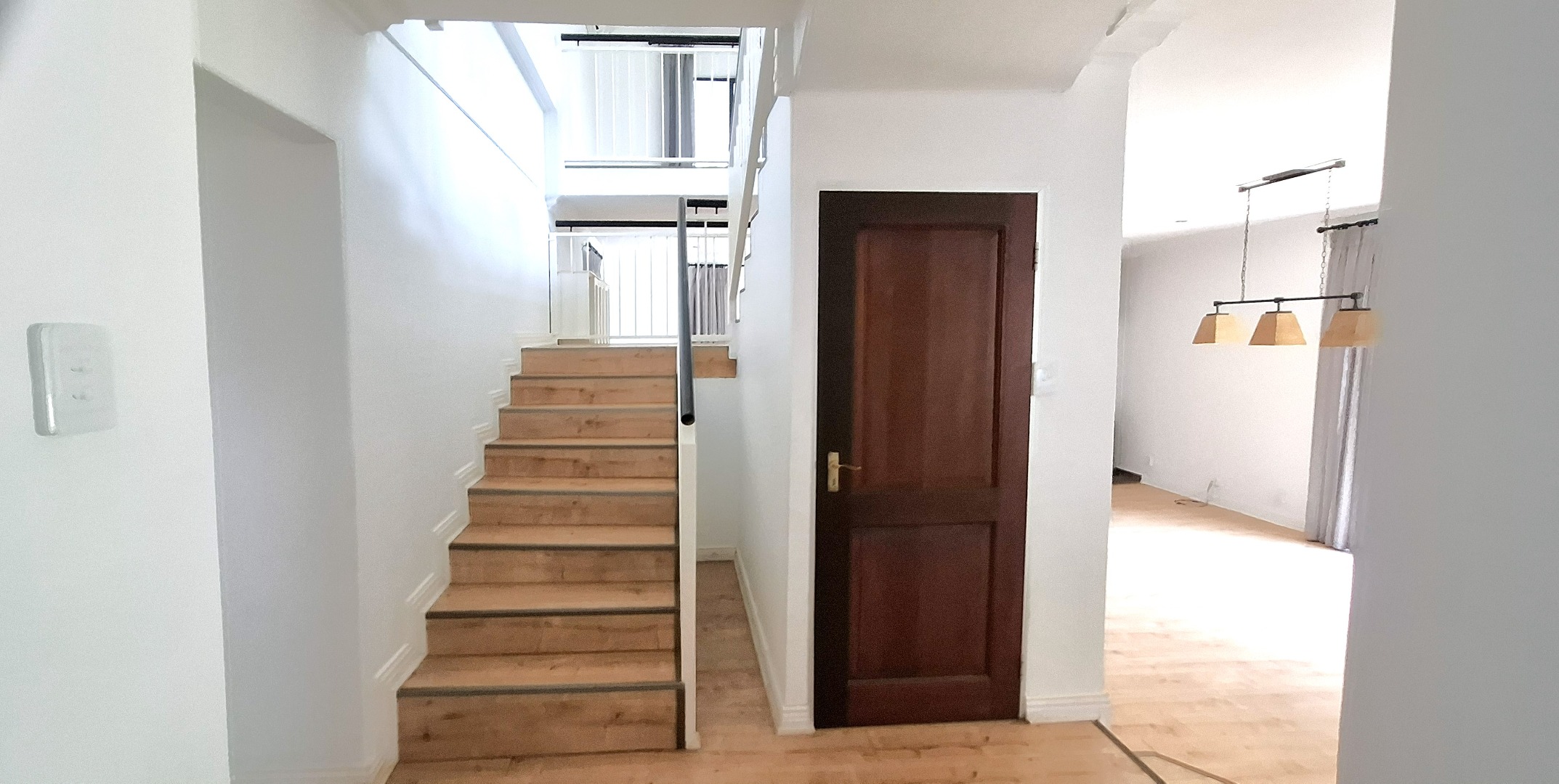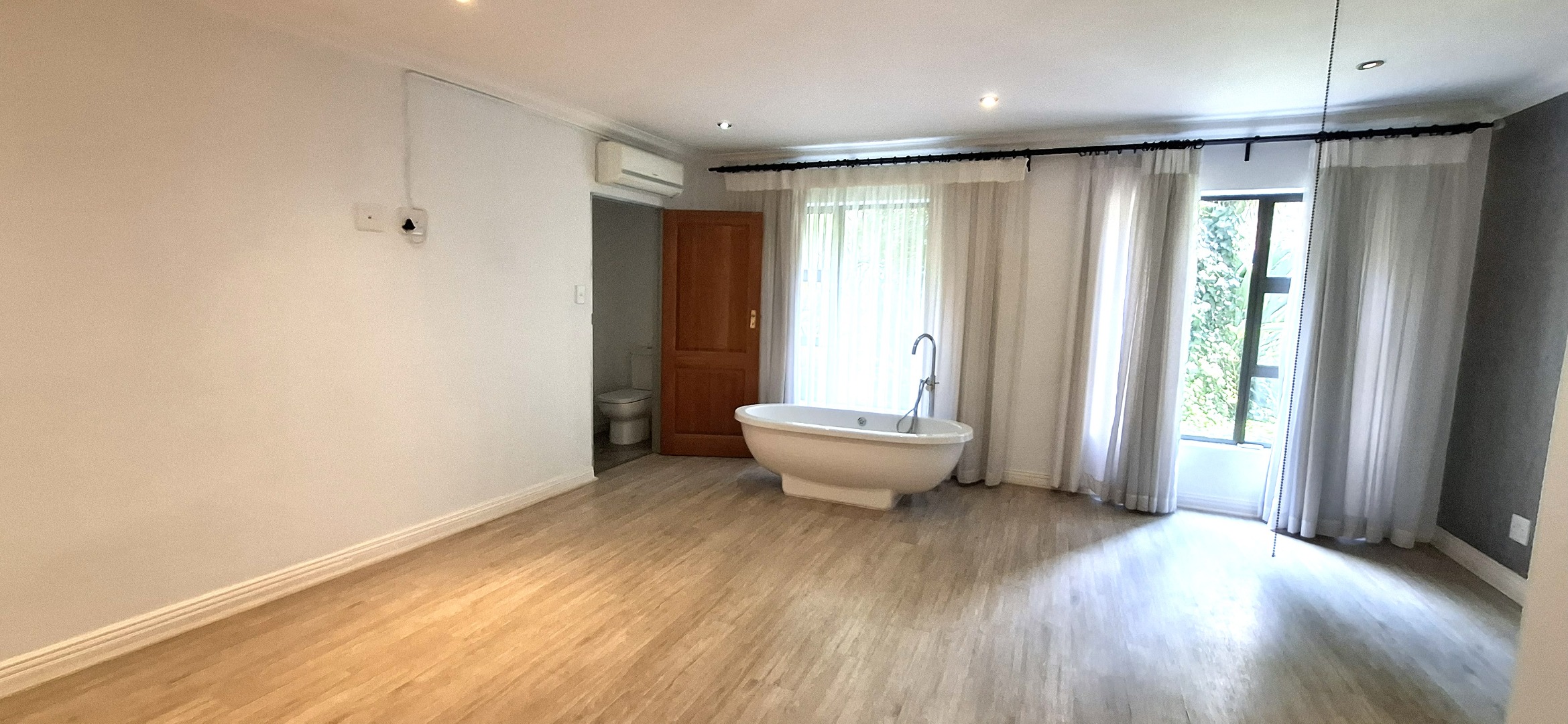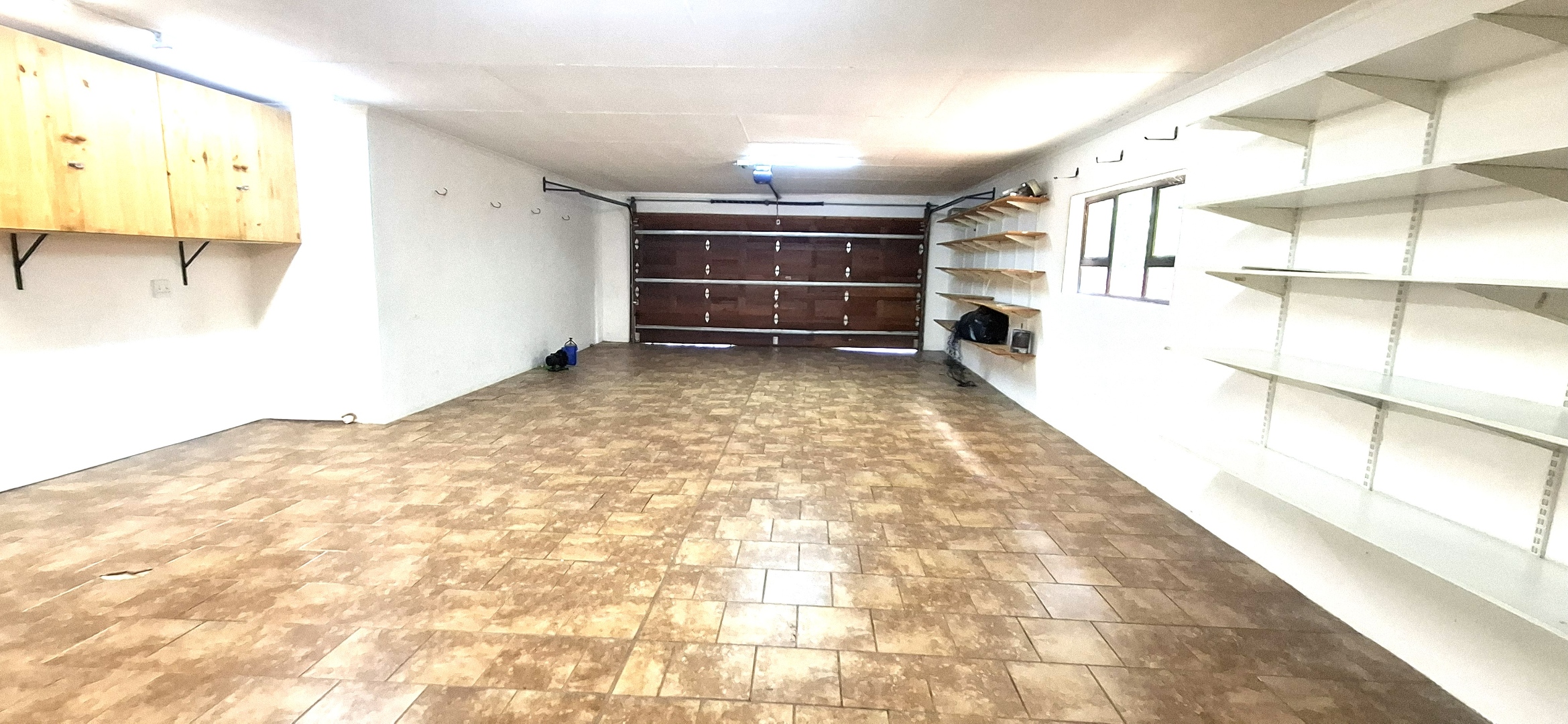 The ground floor is anchored by generous living areas that connect naturally with both indoor and outdoor spaces. The kitchen serves as the heart of the home, opening into the dining and lounge areas and complemented by a walk-in pantry and separate scullery. A dedicated entertainment room with built-in braai creates an inviting space for gatherings, while large doors lead out to the garden and pool area.