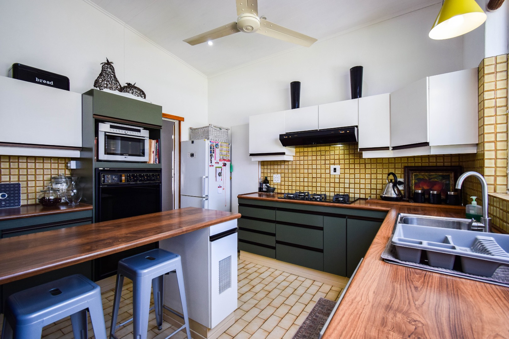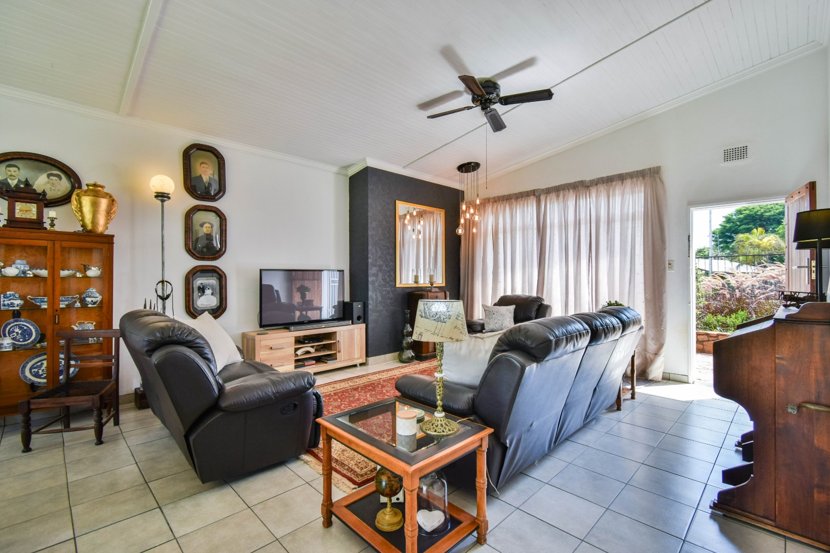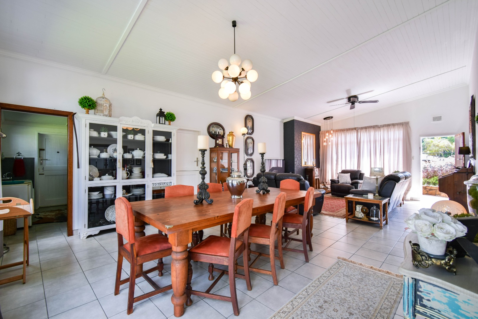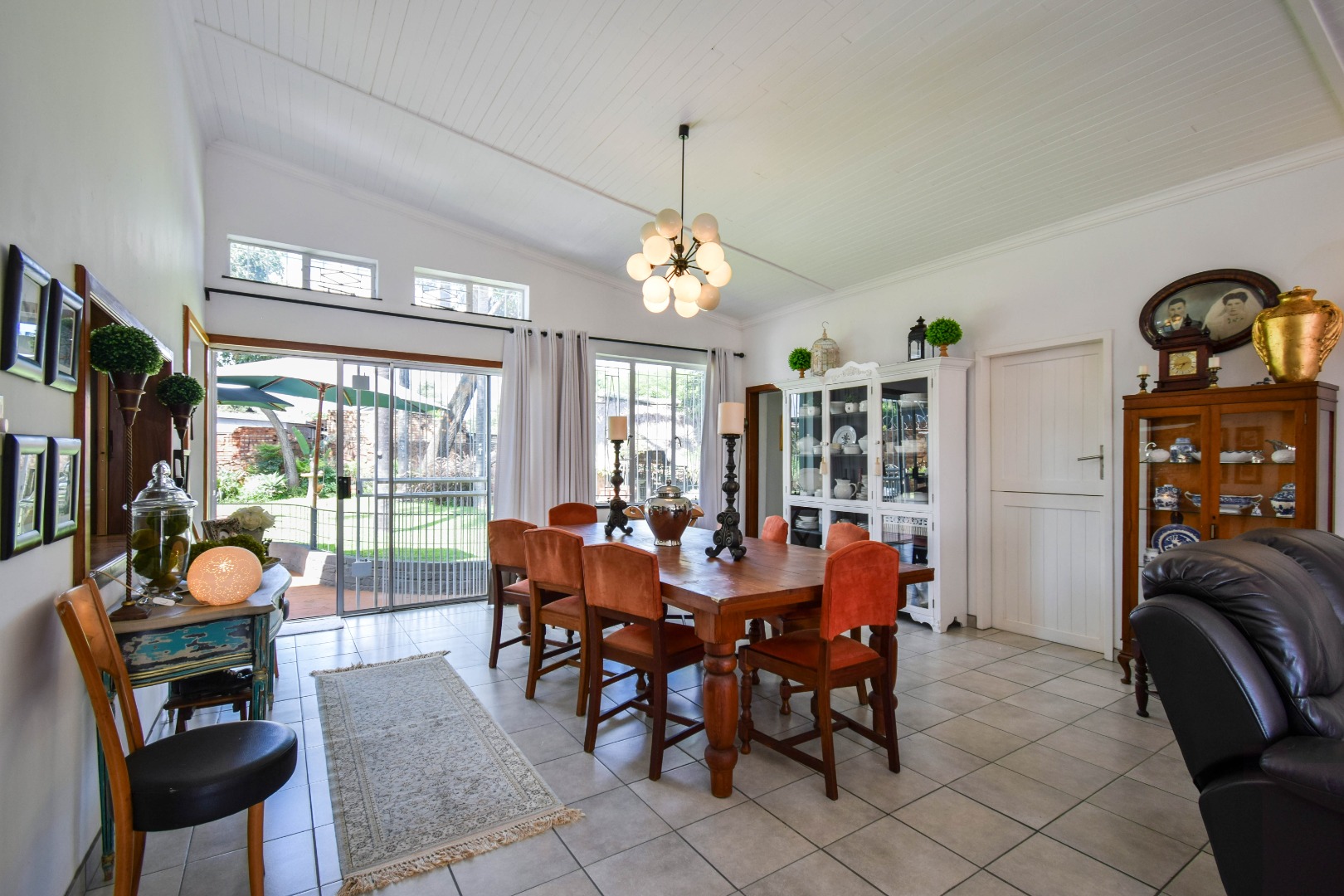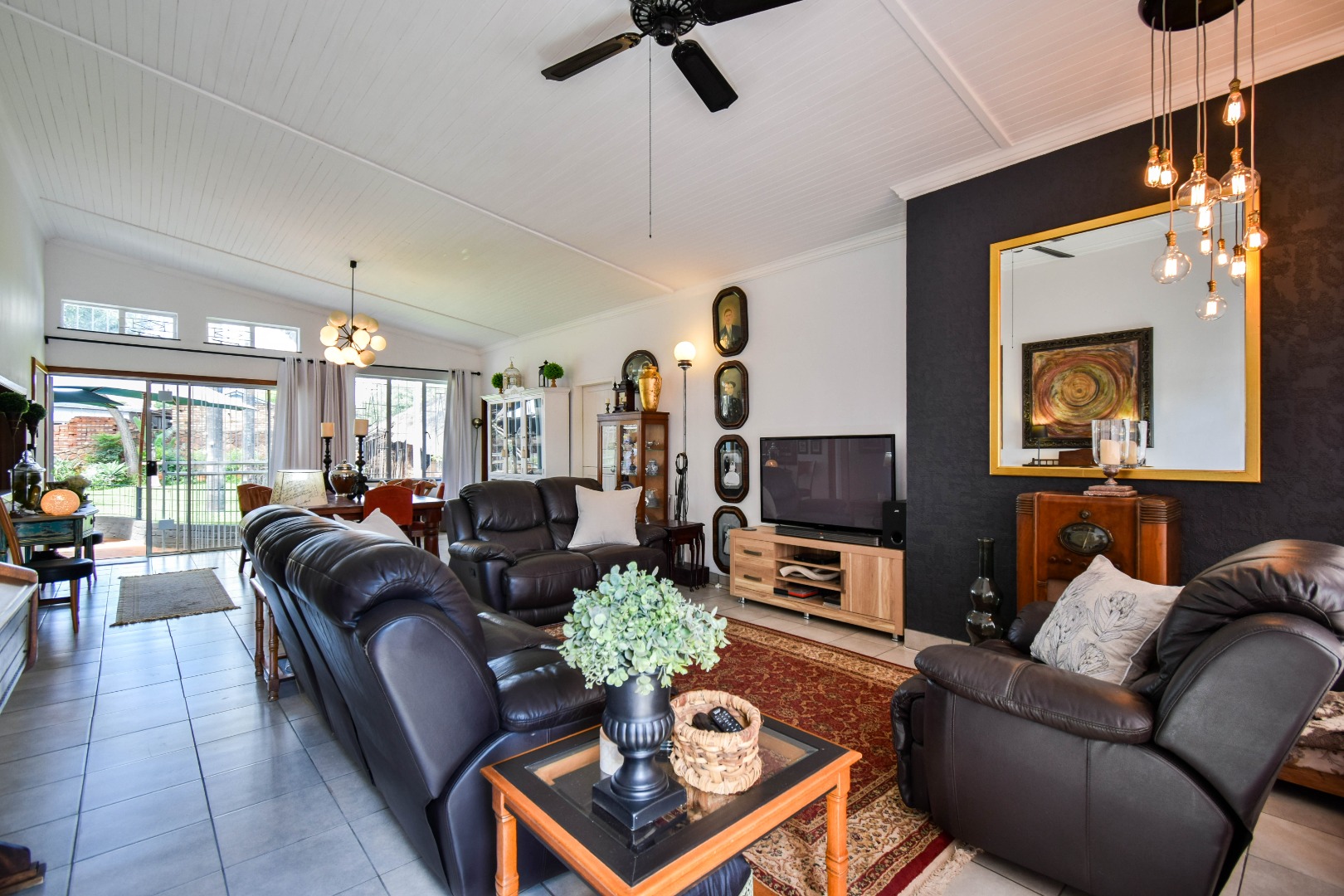 The interior boasts a spacious open-plan living and dining area, characterised by high, paneled wood ceilings, and durable tiled flooring throughout. Large windows and sliding doors ensure abundant natural light, creating an airy atmosphere and providing seamless access to the outdoor spaces. The home includes a dedicated lounge/TV room, and a dining room, offering versatile living options for various needs. A functional kitchen and a convenient laundry area caters to daily requirements, alongside a guest toilet for added practicality.