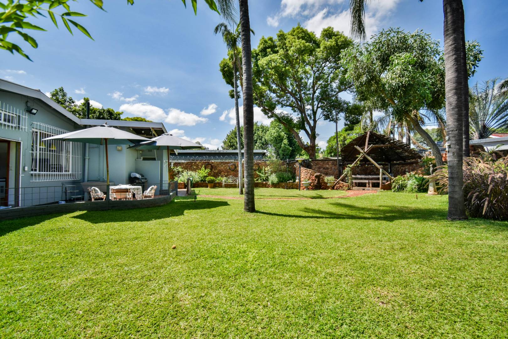 Outdoors, residents can enjoy a lapa as well as another entertainment area, both perfect for entertaining, and a well-kept garden supported by an irrigation system and sprinklers. The property is pet-friendly and features essential amenities such as a borehole and water tanks, enhancing self-sufficiency. Security is well-addressed with burglar bars and a security gates, ensuring peace of mind.