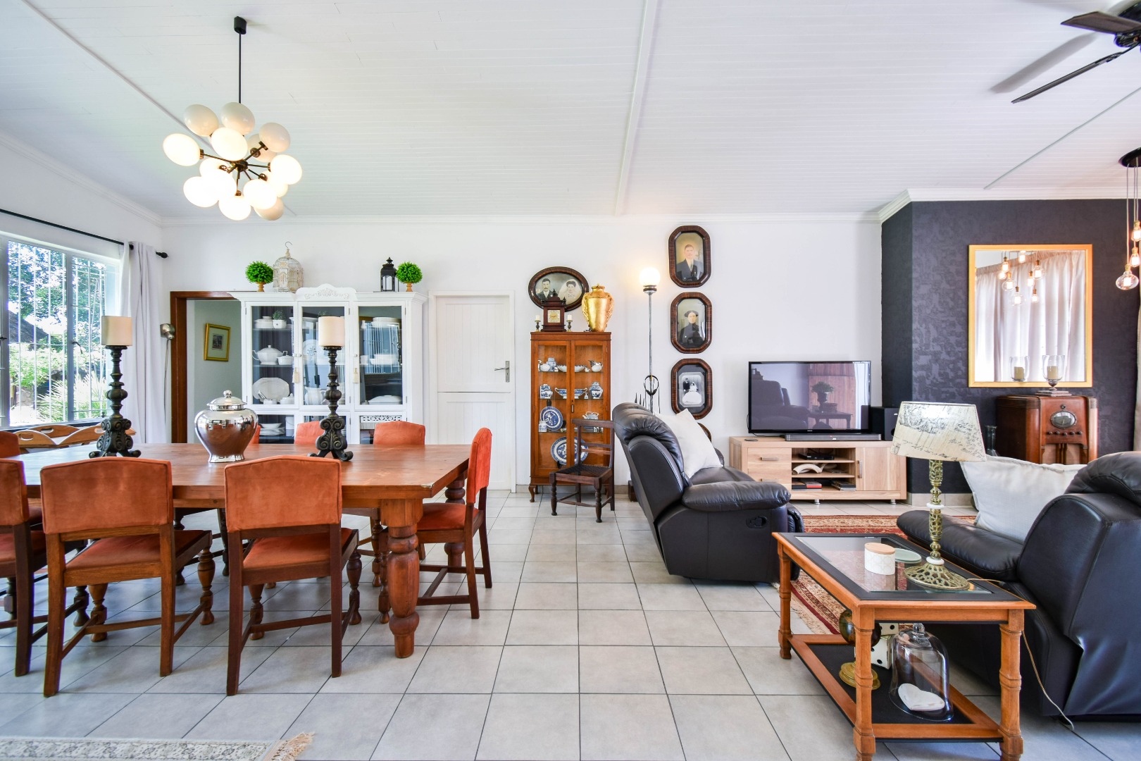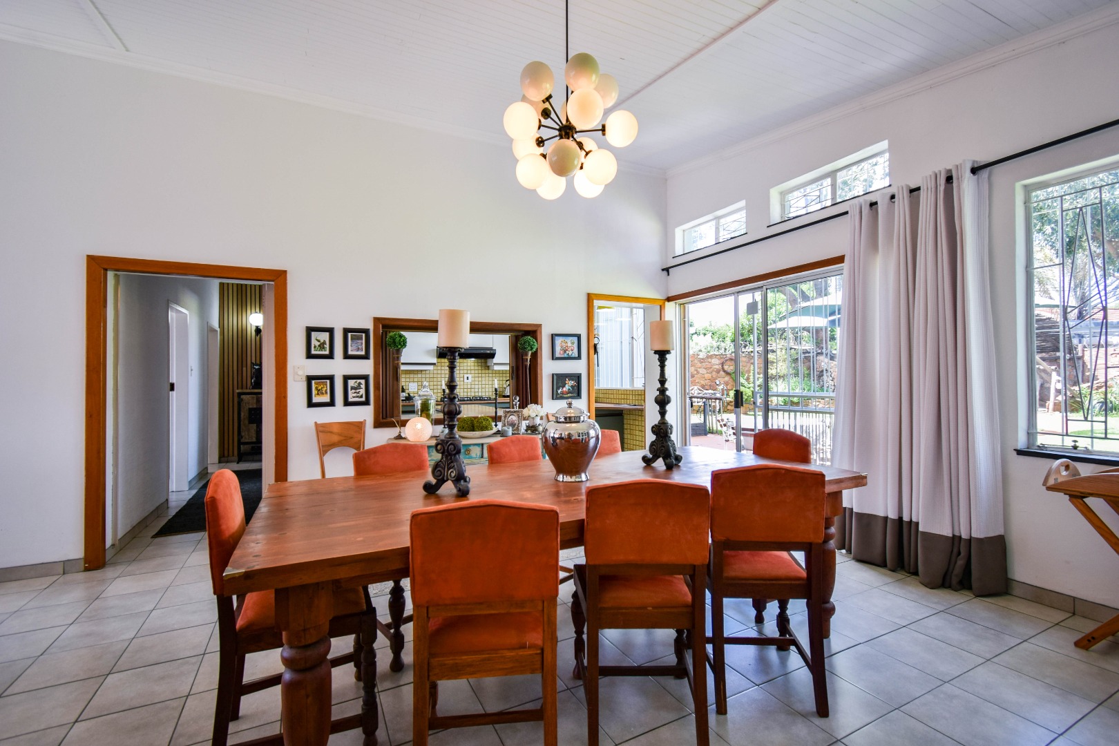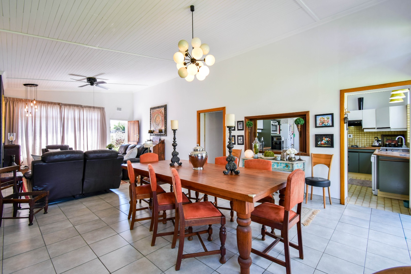 The interior boasts a spacious open-plan living and dining area, characterised by high, paneled wood ceilings, and durable tiled flooring throughout. Large windows and sliding doors ensure abundant natural light, creating an airy atmosphere and providing seamless access to the outdoor spaces. The home includes a dedicated lounge/TV room, and a dining room, offering versatile living options for various needs. A functional kitchen and a convenient laundry area caters to daily requirements, alongside a guest toilet for added practicality.