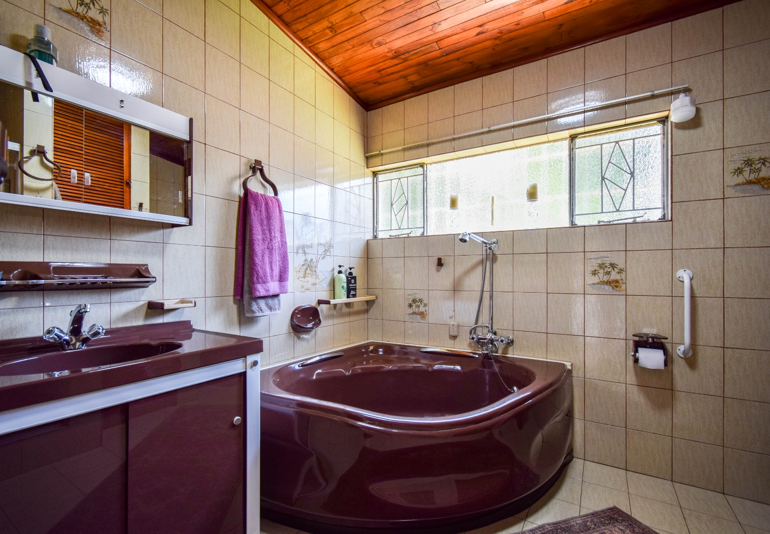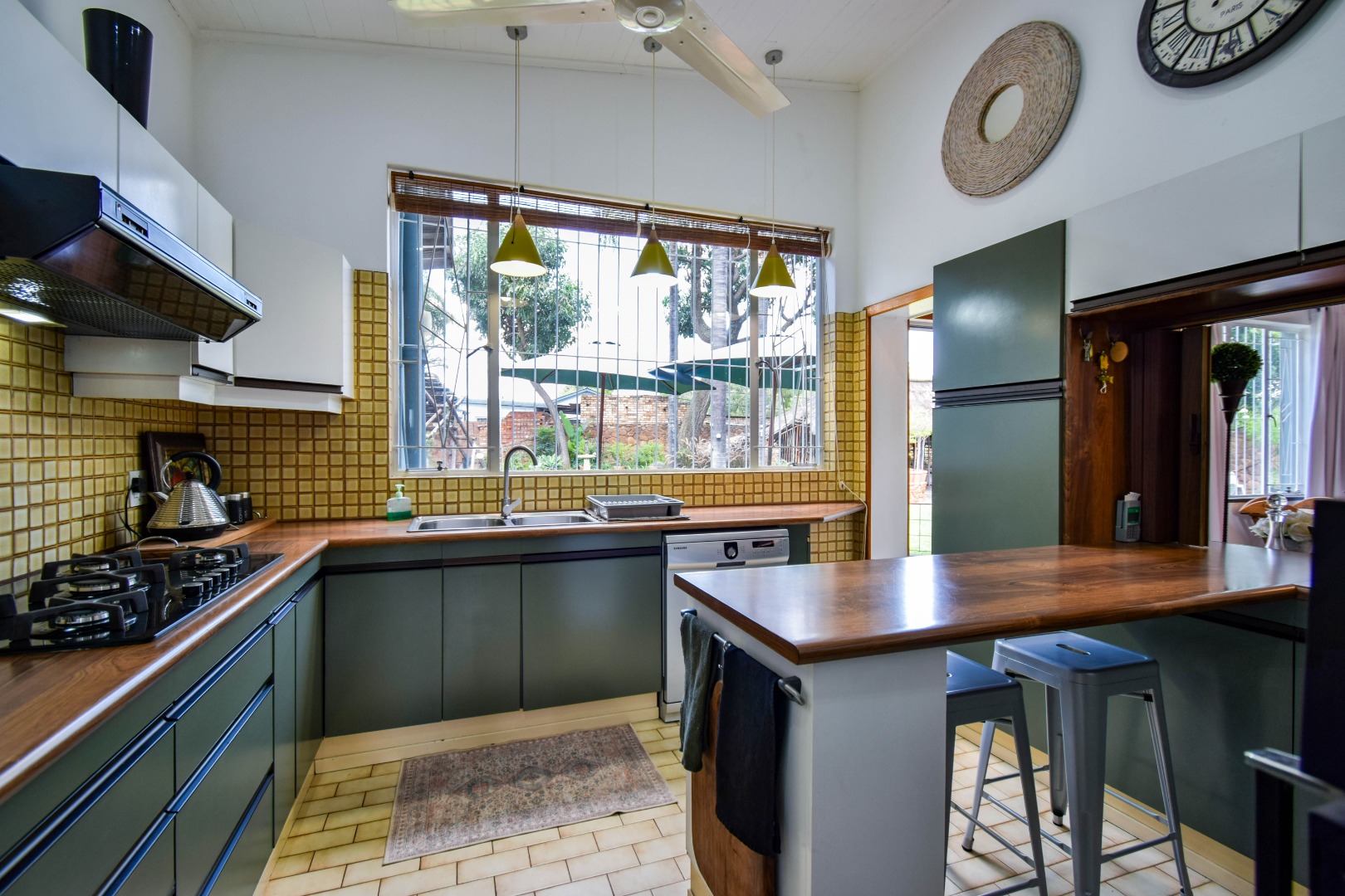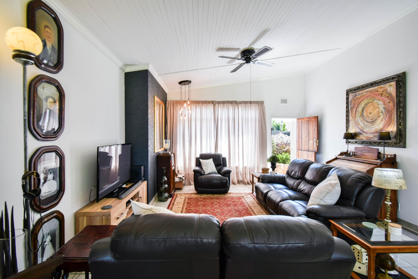 The interior boasts a spacious open-plan living and dining area, characterised by high, paneled wood ceilings, and durable tiled flooring throughout. Large windows and sliding doors ensure abundant natural light, creating an airy atmosphere and providing seamless access to the outdoor spaces. The home includes a dedicated lounge/TV room, and a dining room, offering versatile living options for various needs. A functional kitchen and a convenient laundry area caters to daily requirements, alongside a guest toilet for added practicality.