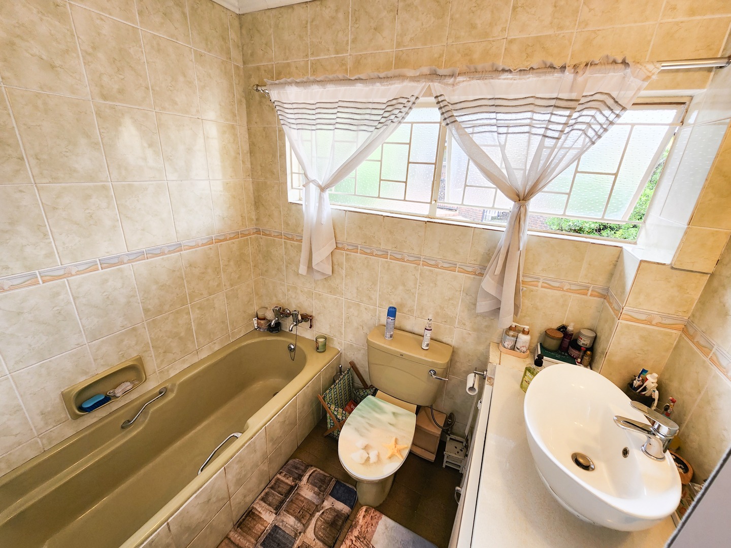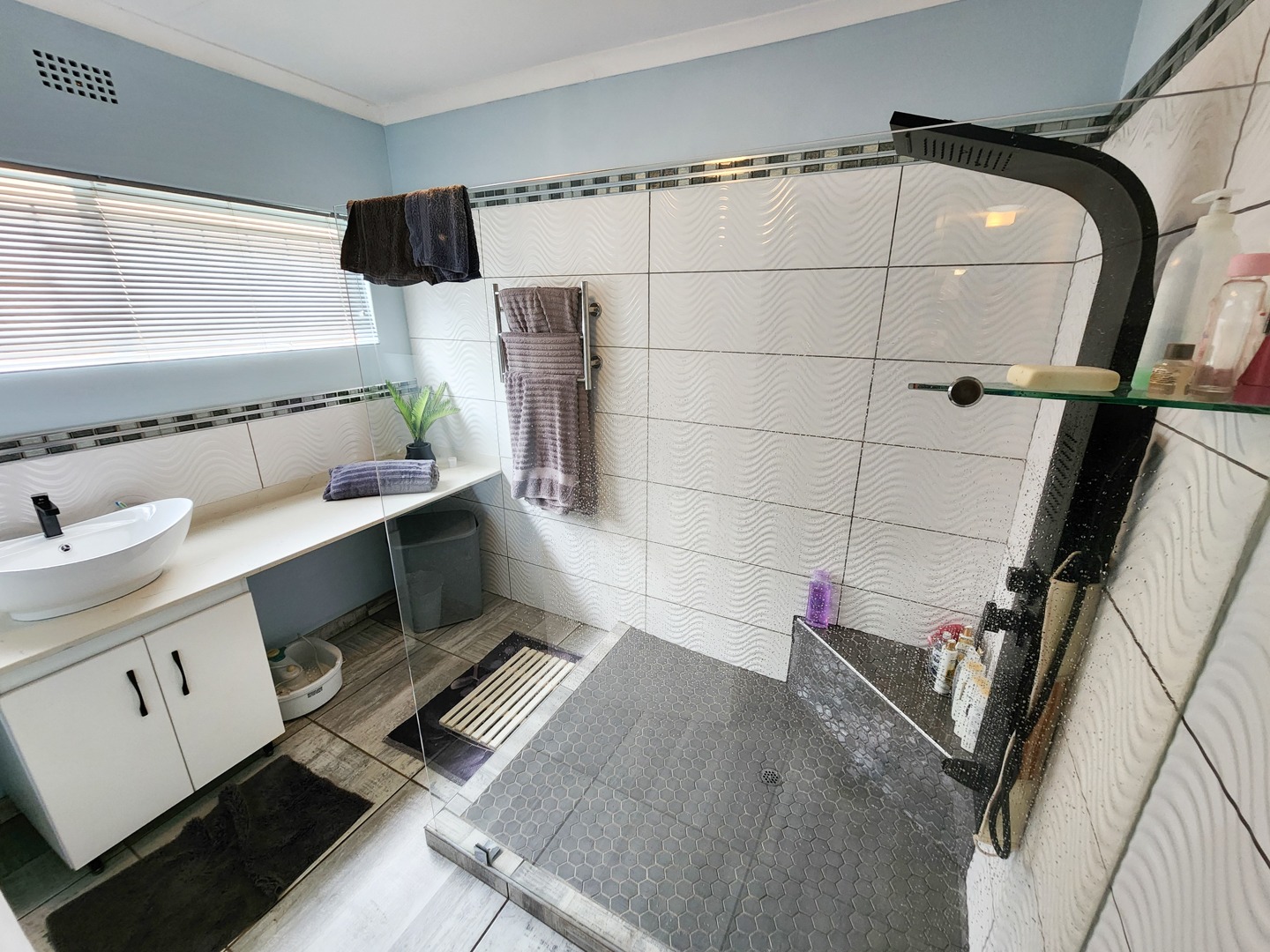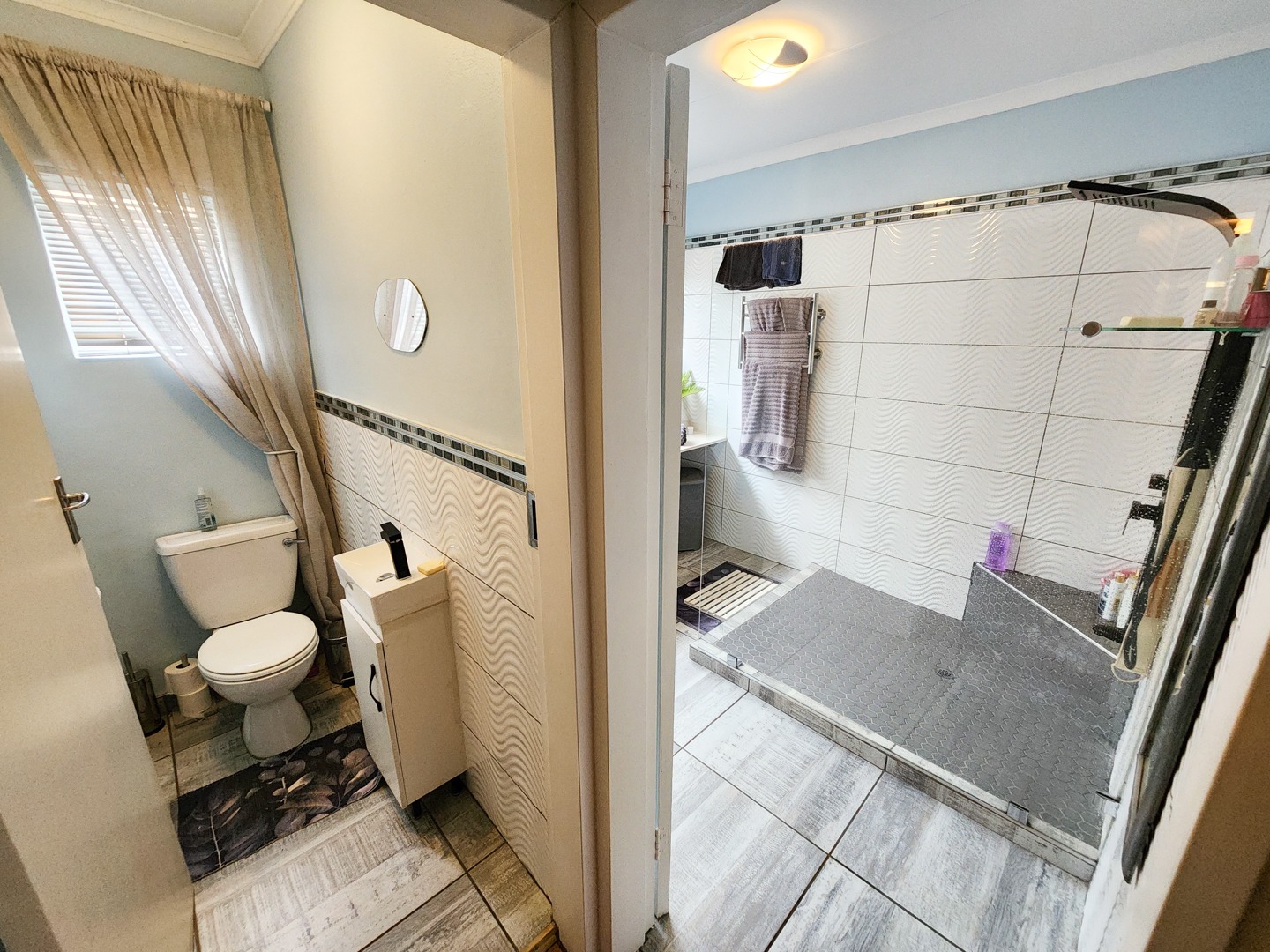 The main house accommodates three generously sized bedrooms. The main bedroom features laminated flooring, a dedicated dressing room, and a private en-suite bathroom complete with bath, toilet, and basin. Two additional carpeted bedrooms with built-in cupboards are serviced by a modern bathroom offering a large shower and basin, complemented by a separate toilet and basin for added convenience. Built-in linen cupboards in the passage provide additional practical storage.