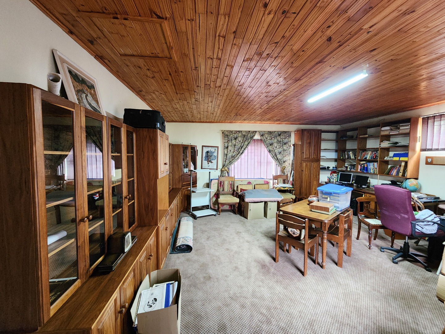 Above the double garage, a spacious study fitted with custom solid wood cupboards offers exceptional flexibility. With direct access from both the garage and the main house, this versatile area is ideal as a professional home office, creative studio, or even a fourth bedroom conversion. The large double garage features an electric door and includes an additional small storage room.
