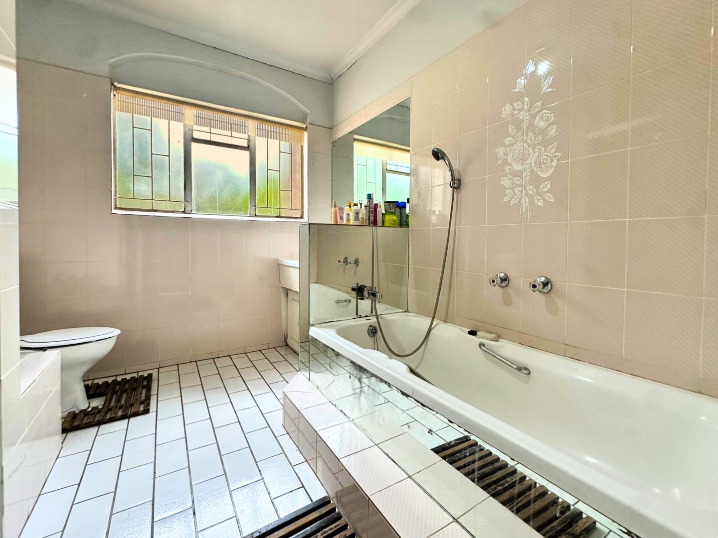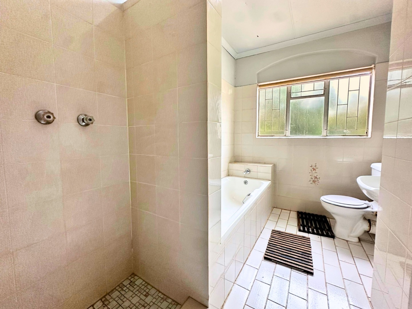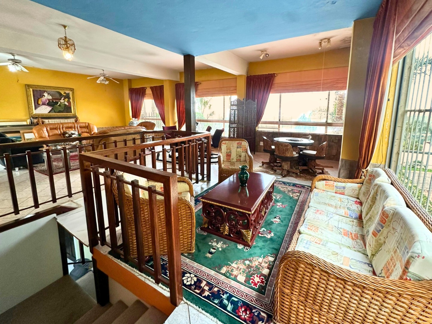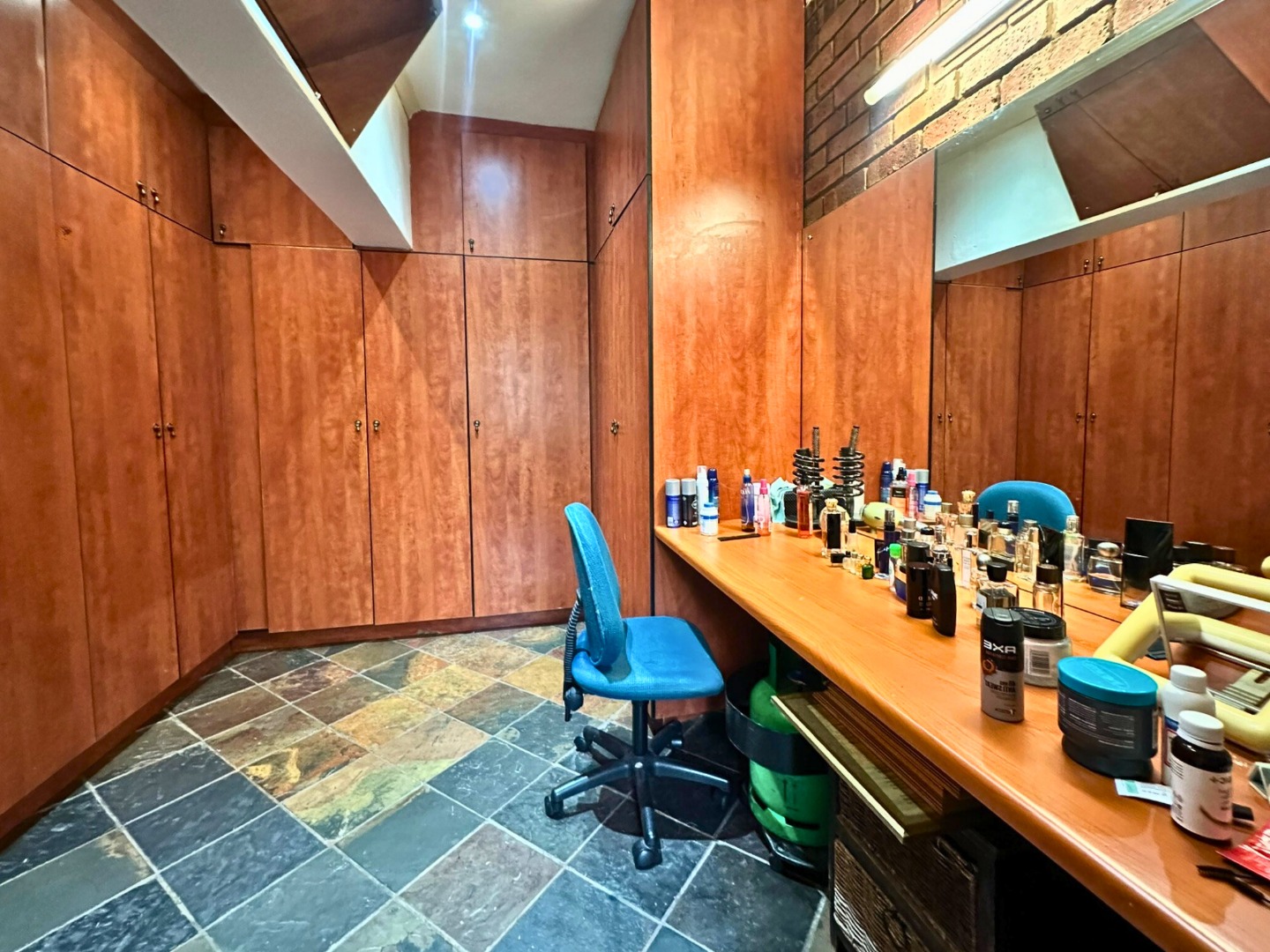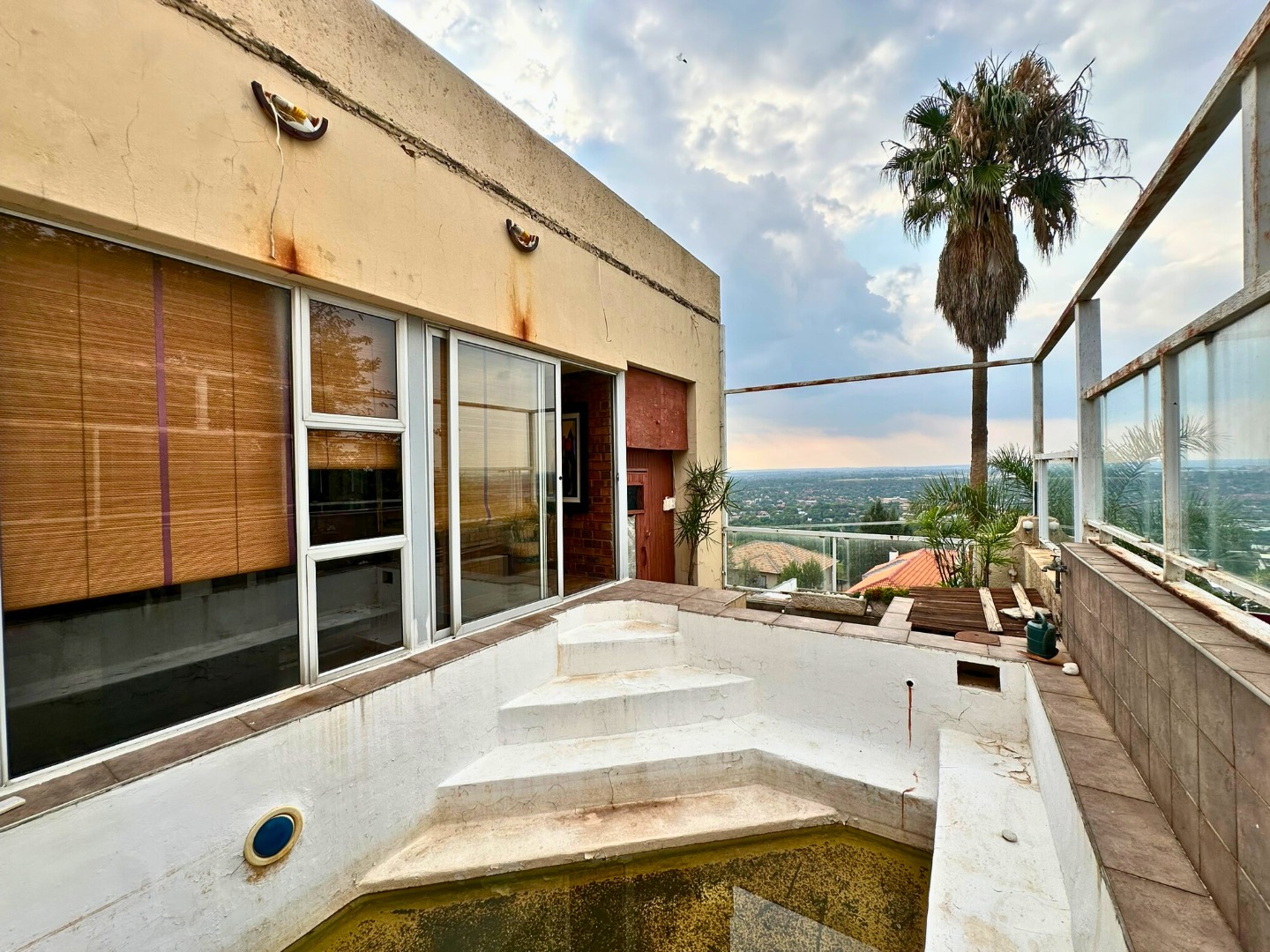 The upper floor accommodates four en-suite bedrooms, two study areas, additional living space, and a passage bathroom. The main suite features a fireplace and opens onto a private deck with a splash pool and sauna, all offering excellent potential for refurbishment.