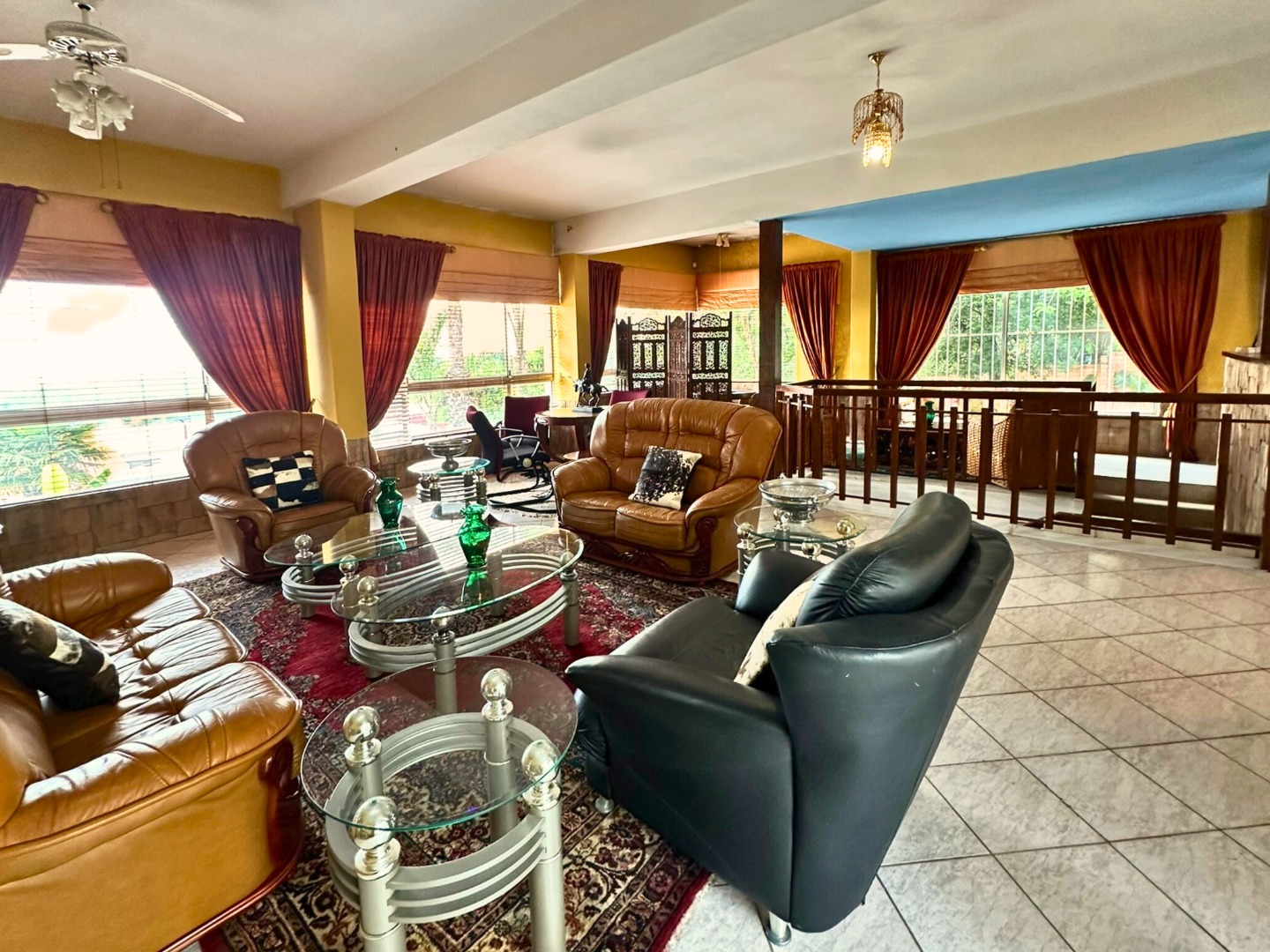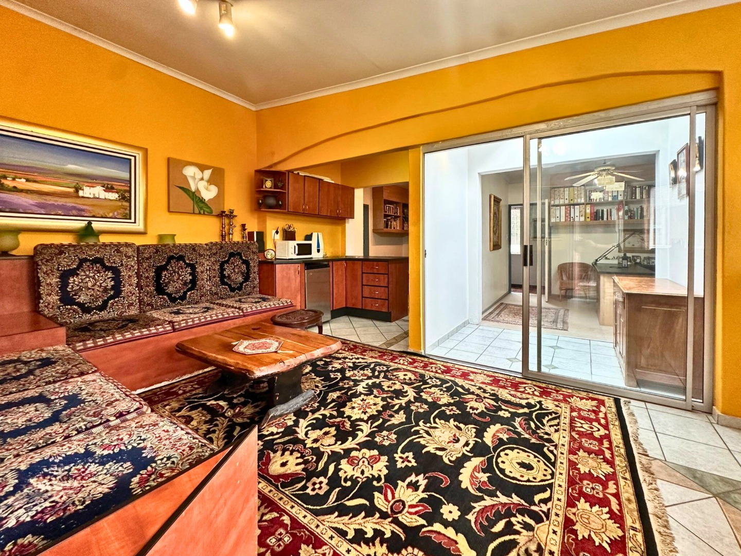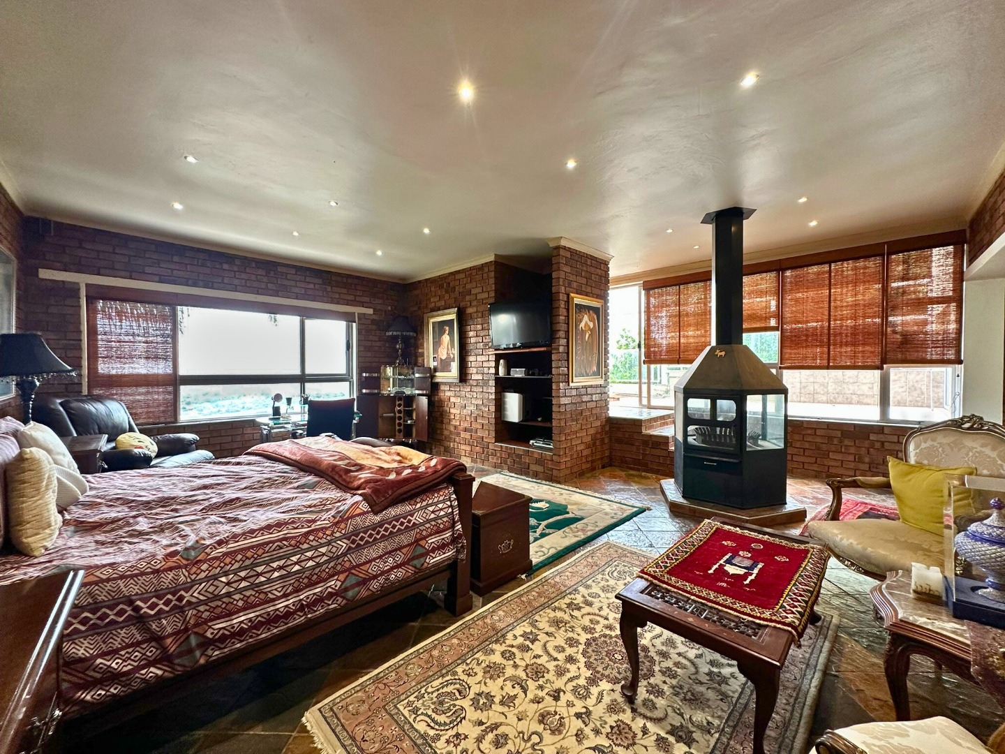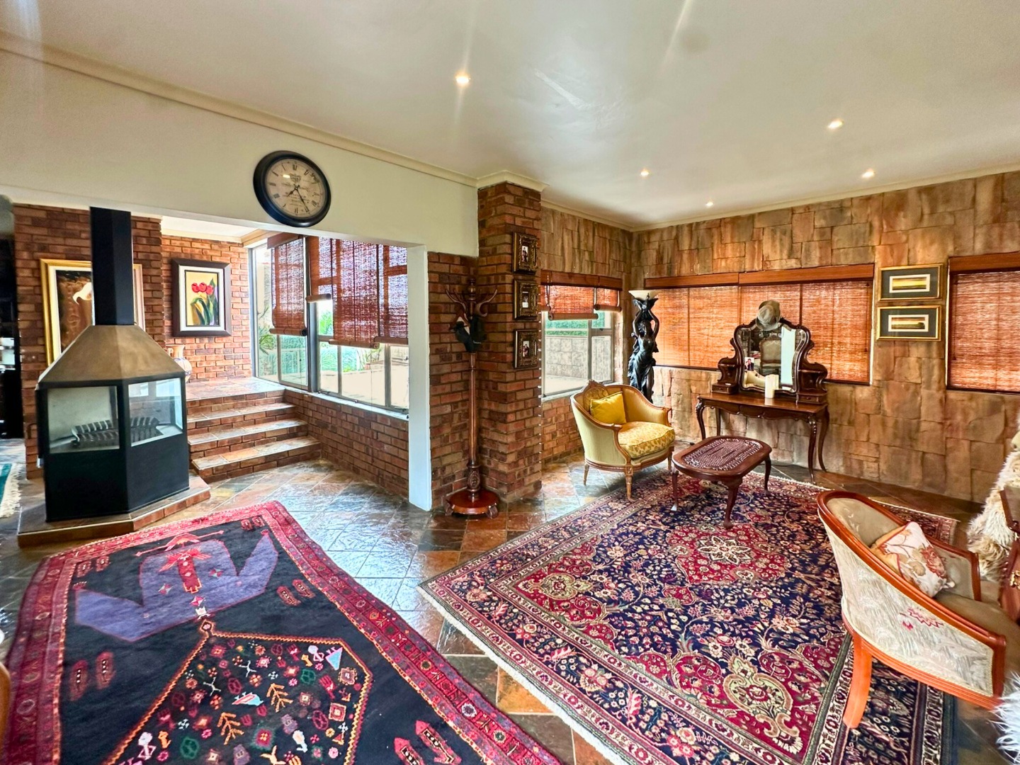 The multi level layout creates distinct living and entertainment zones. The main entrance opens into a central foyer with access to open plan living and dining areas that lead onto a large patio with built-in braai. The kitchen includes a gas/electric hob, scullery, and separate laundry. Lower levels offer expansive living areas with fireplaces and further patio access, while a private guest en-suite is positioned on its own level.