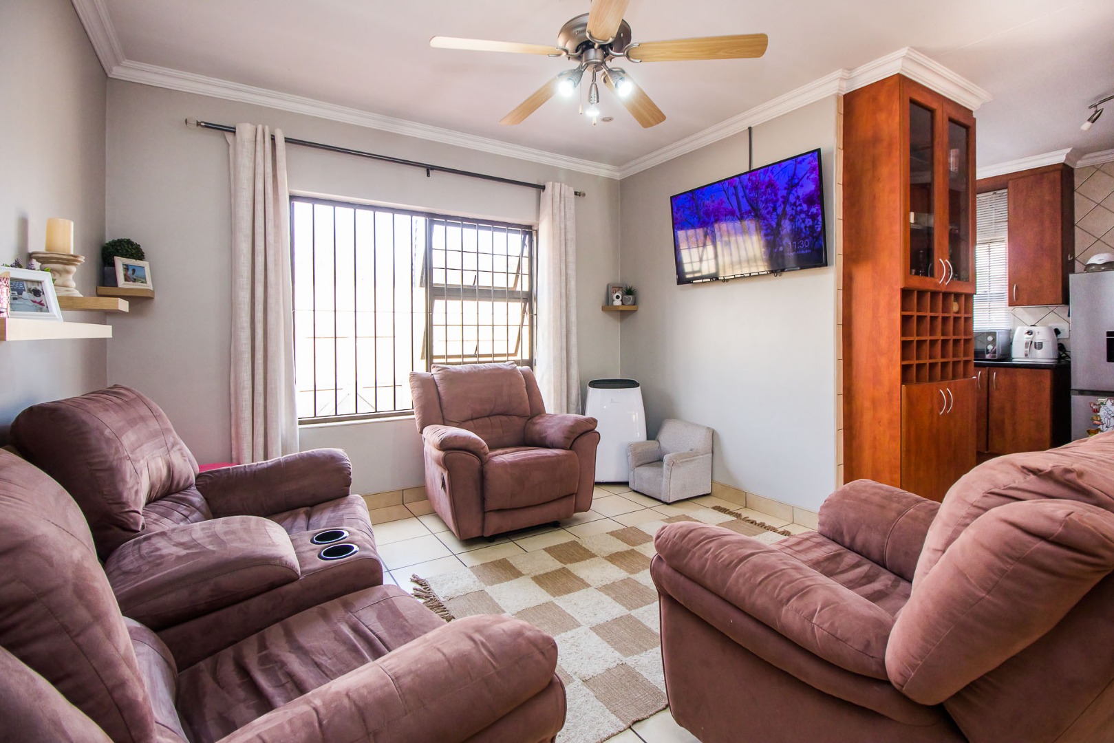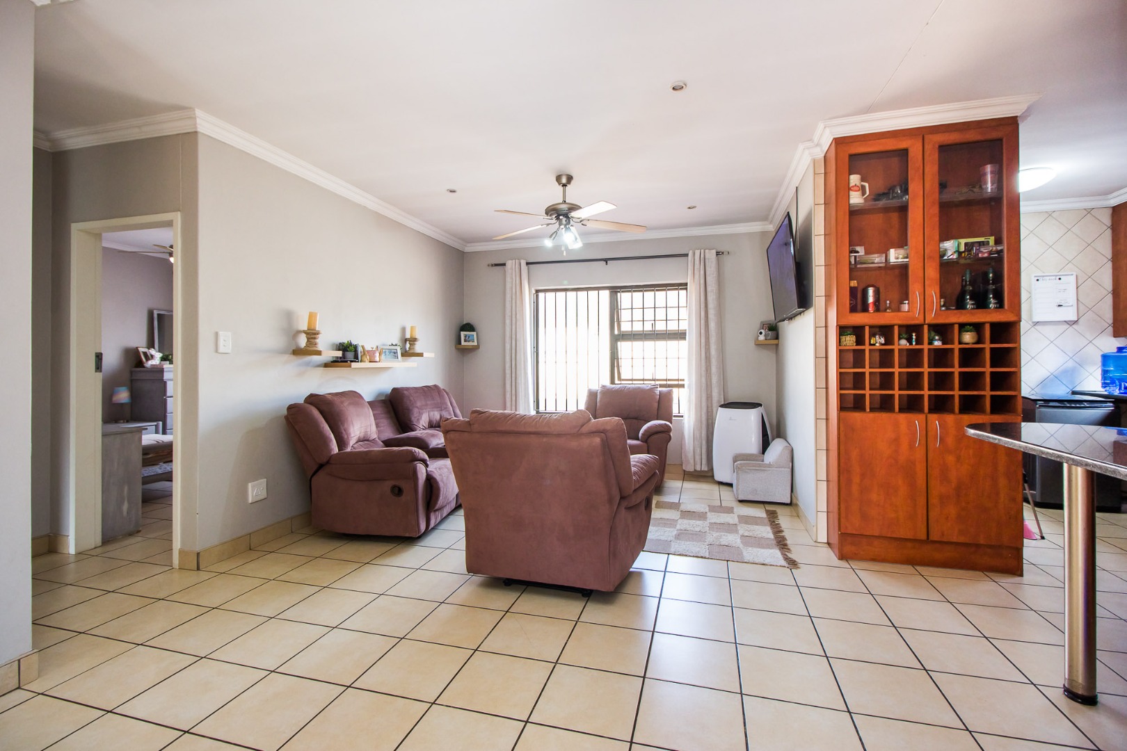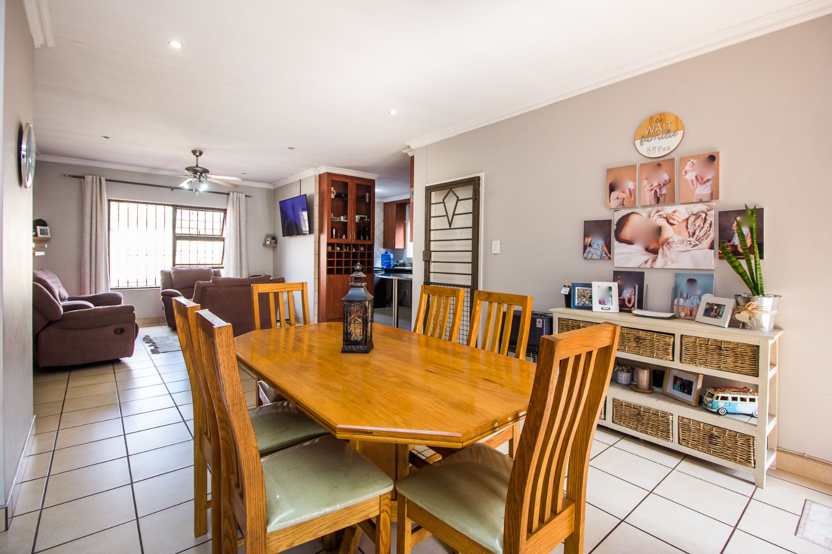 Step inside to discover an inviting open-plan living area, characterized by light gray walls, elegant crown molding, and durable tiled flooring throughout. The lounge and dining areas flow seamlessly, benefiting from ample natural light. The well-appointed kitchen, integrated into this open space, features cohesive cabinetry and provides a functional hub for daily living. A dedicated family TV room offers an additional versatile space for relaxation.