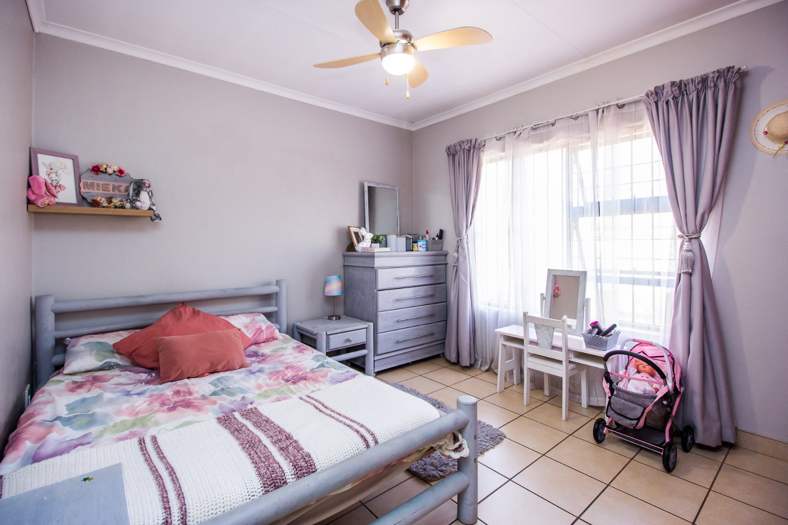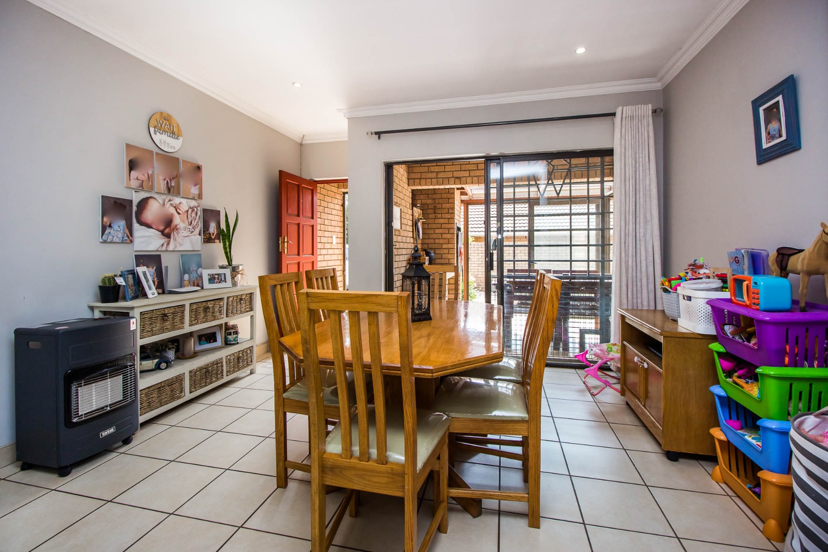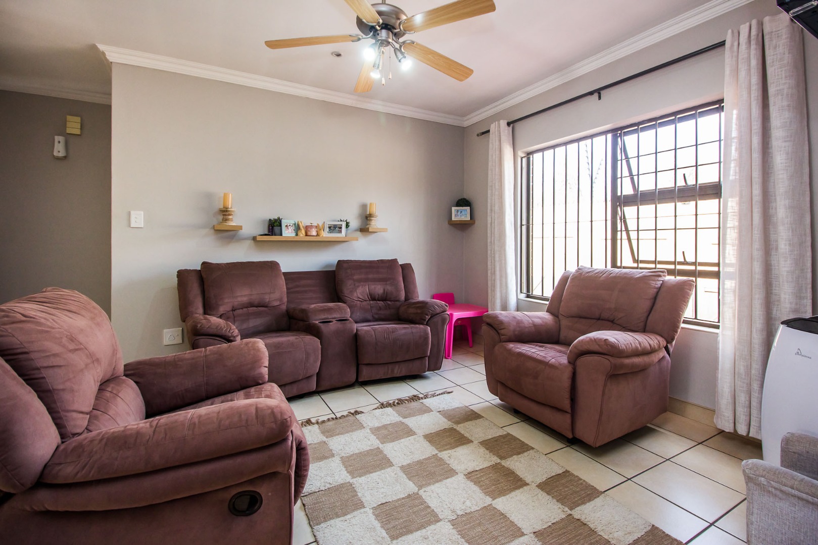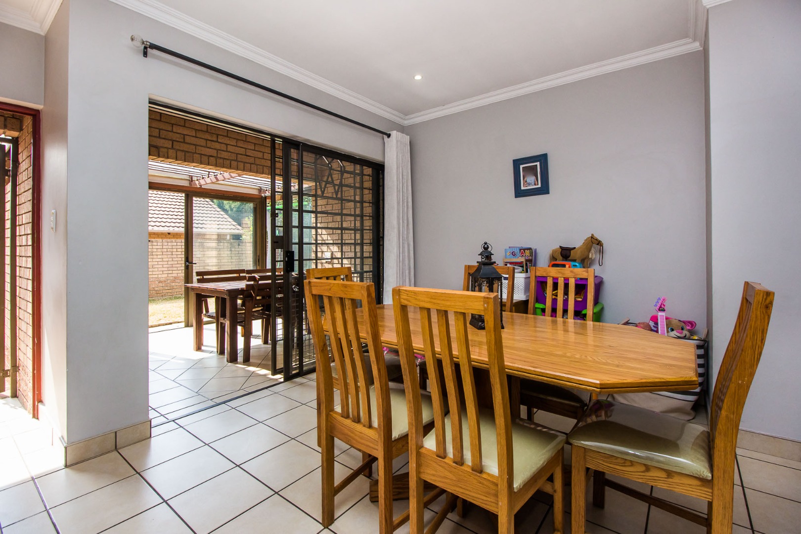 Step inside to discover an inviting open-plan living area, characterized by light gray walls, elegant crown molding, and durable tiled flooring throughout. The lounge and dining areas flow seamlessly, benefiting from ample natural light. The well-appointed kitchen, integrated into this open space, features cohesive cabinetry and provides a functional hub for daily living. A dedicated family TV room offers an additional versatile space for relaxation.