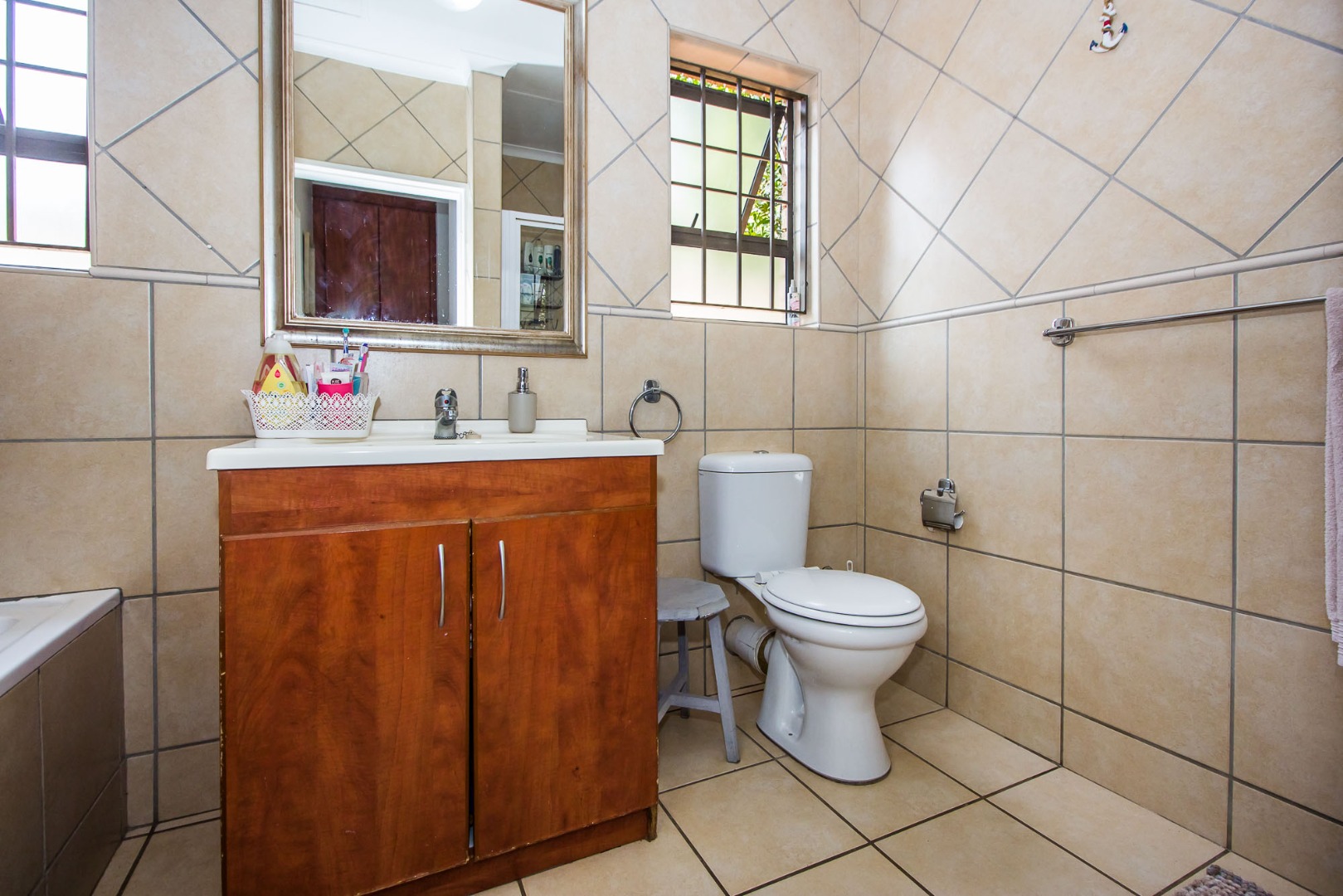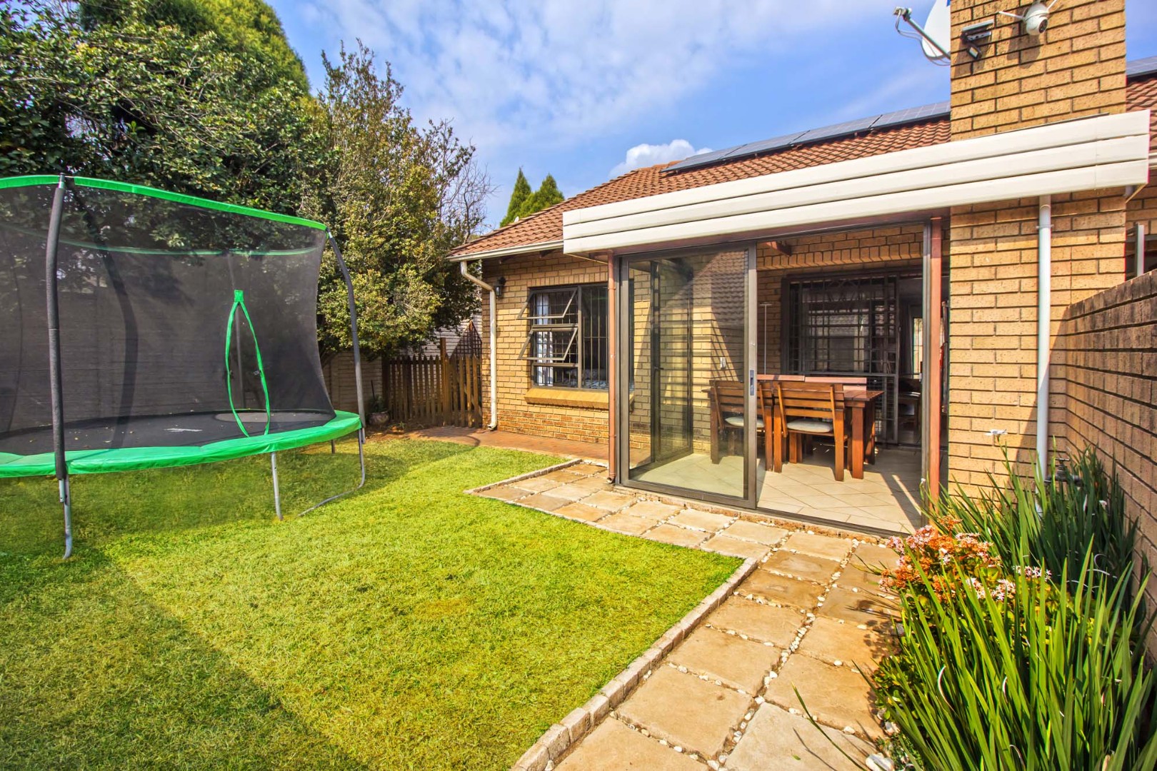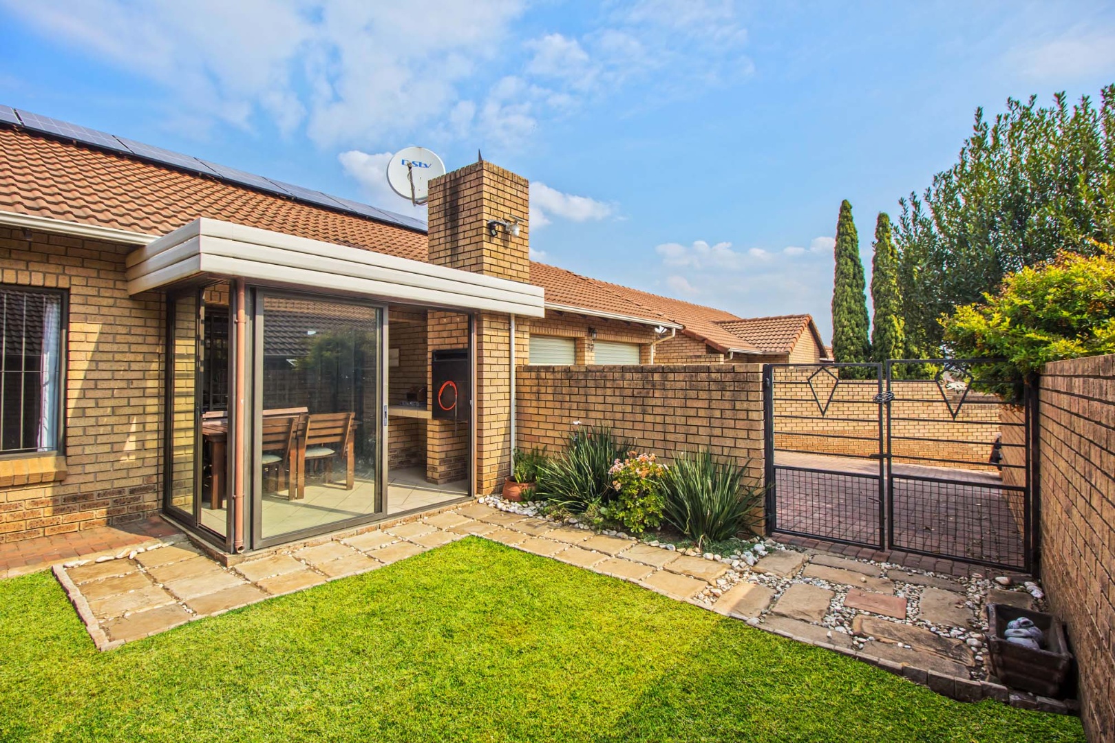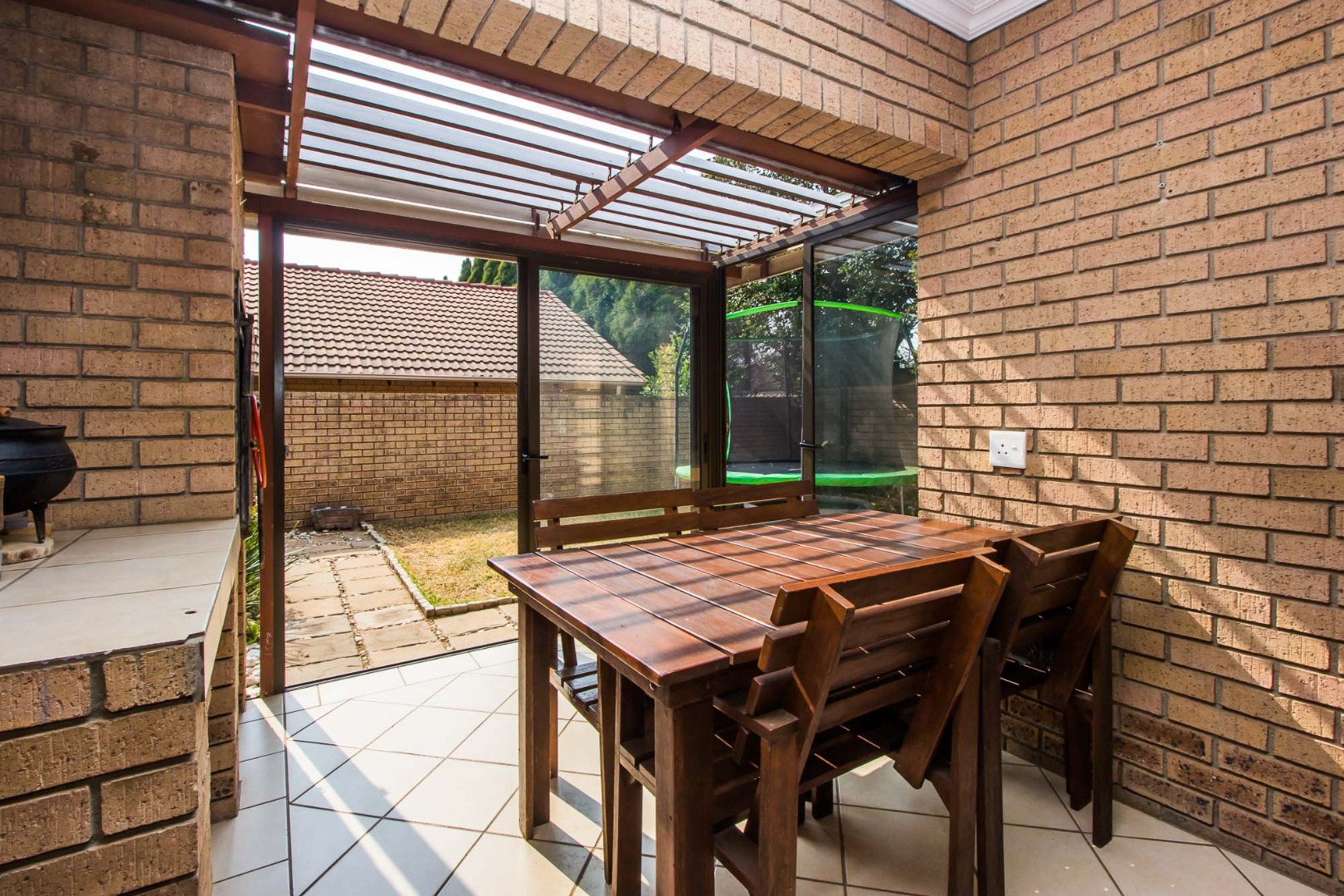 Outdoor living is a delight with an enclosed patio or sunroom, perfect for all-weather entertaining. This space features a built-in braai, ideal for social gatherings, and sliding doors that open to a manageable garden area. Additional practical amenities include a dedicated laundry area, ample storage, and an outside toilet, enhancing the home's functionality.