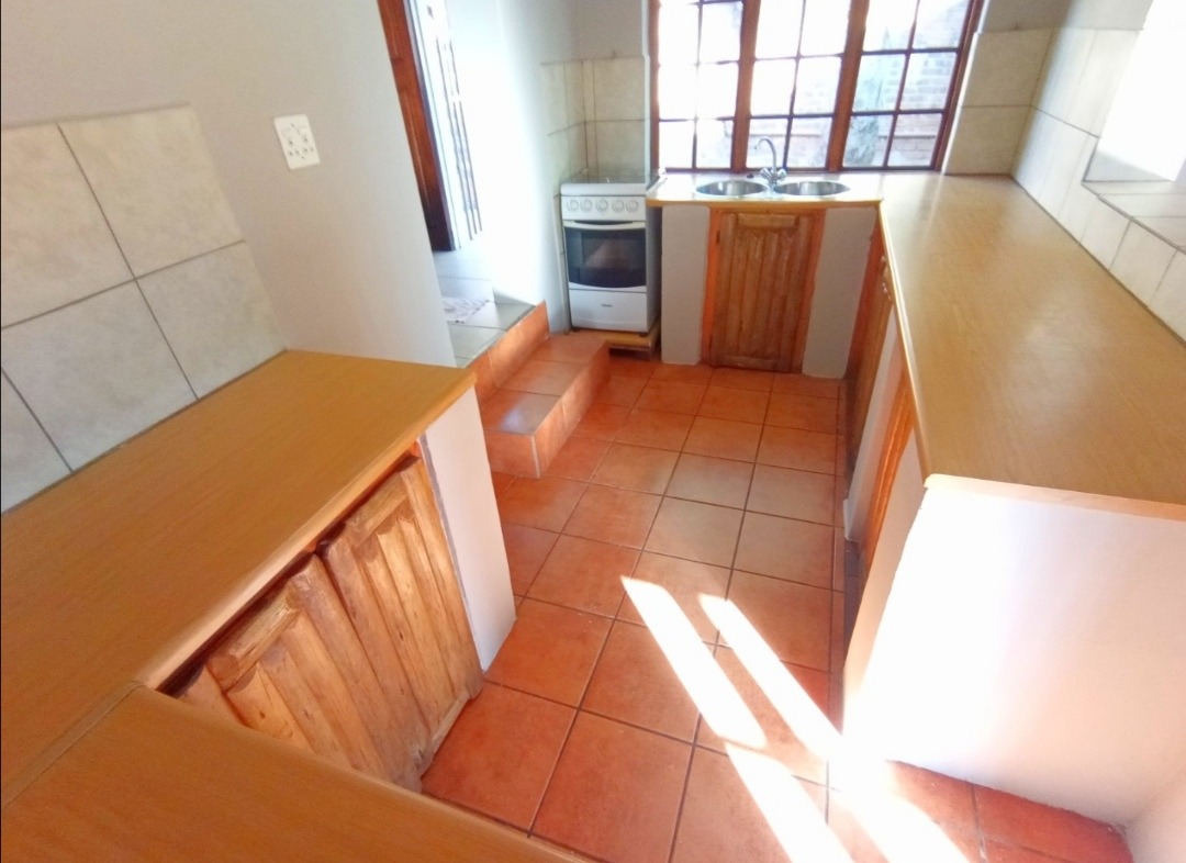 - Kitchen with built-in cupboards and stove.