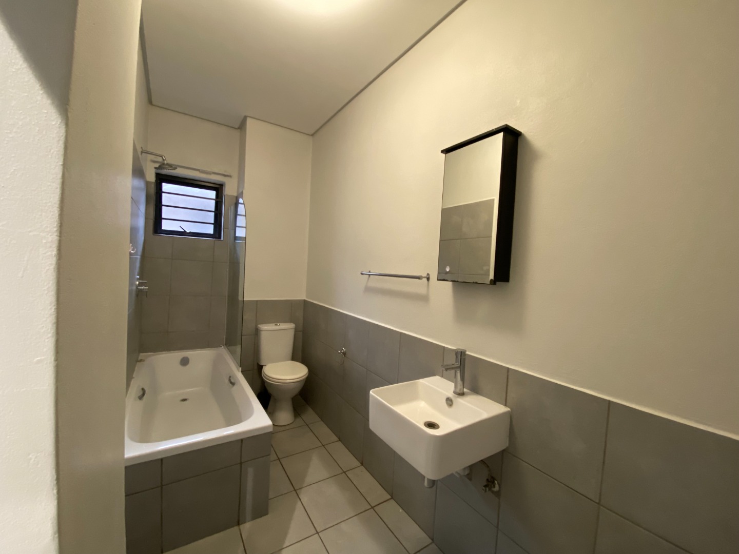 The bathroom is thoughtfully designed and includes a toilet and a modern bathtub fitted with a convenient two-in-one bath and shower combination. This practical layout caters to both quick showers and relaxing baths, offering the best of both worlds.
