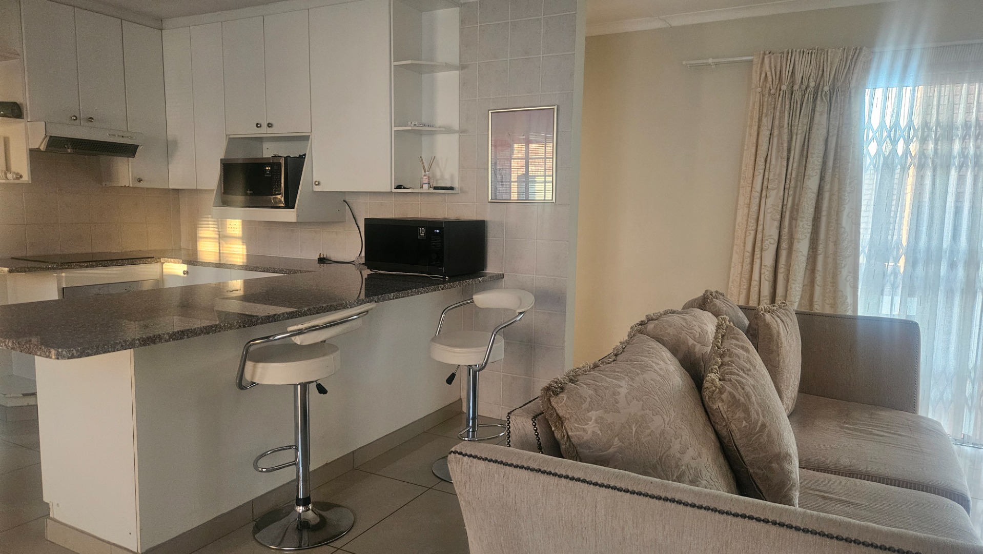 Step inside to discover a bright and clean open-plan layout seamlessly connecting the living, dining, and kitchen areas, all adorned with light-colored tiled flooring and neutral walls.