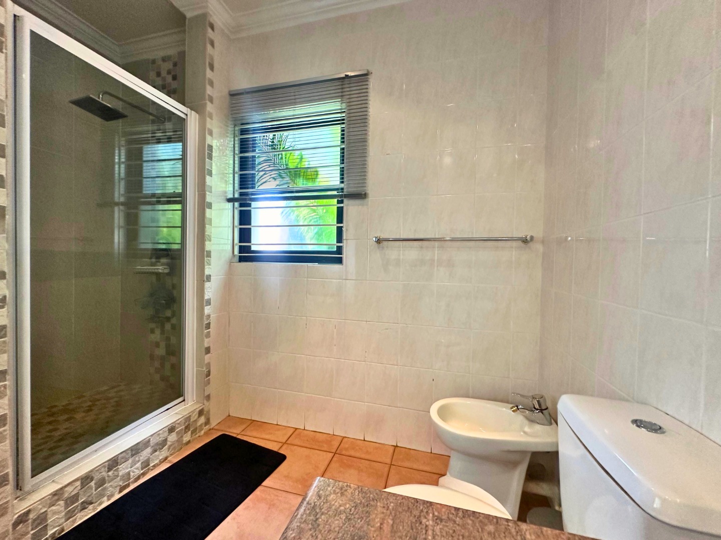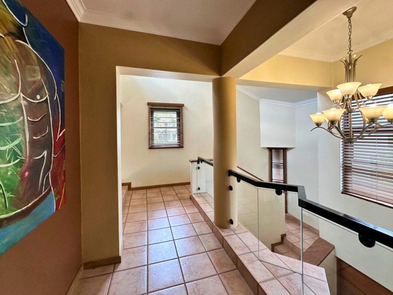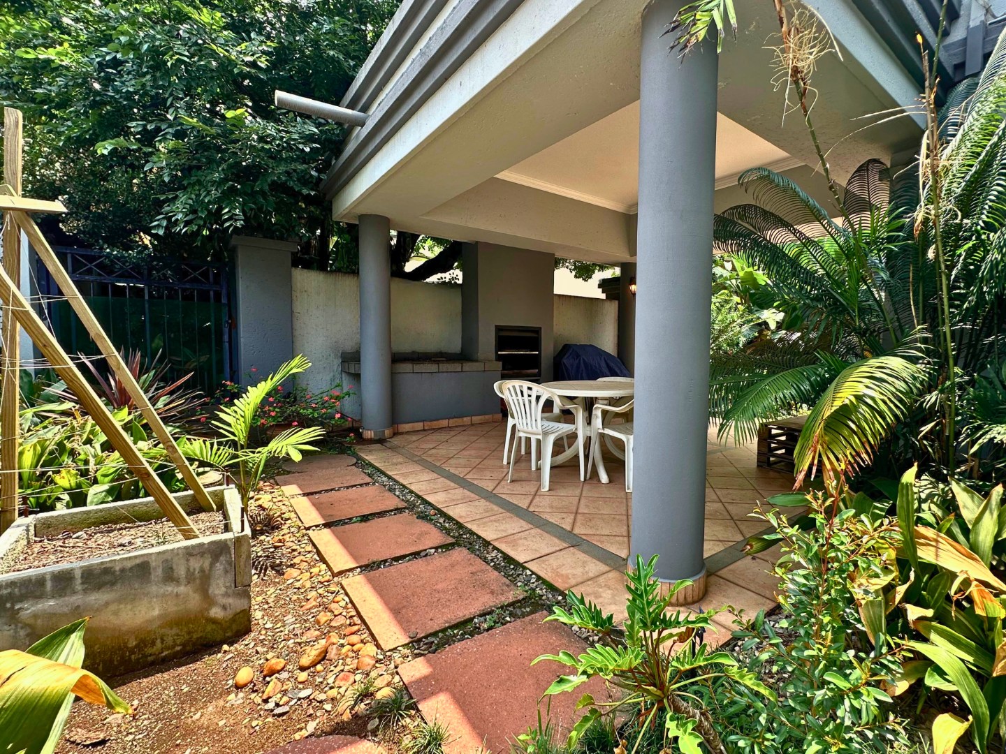 The main bedroom is conveniently situated downstairs, offering comfort and privacy with a full en-suite bathroom. Upstairs, two additional bedrooms share a full bathroom and open onto a generous living area or covered verandah with braai facilities. The upstairs layout is flexible, allowing the space to be adapted as a fourth bedroom, private lounge, or entertainment area to suit your lifestyle needs.