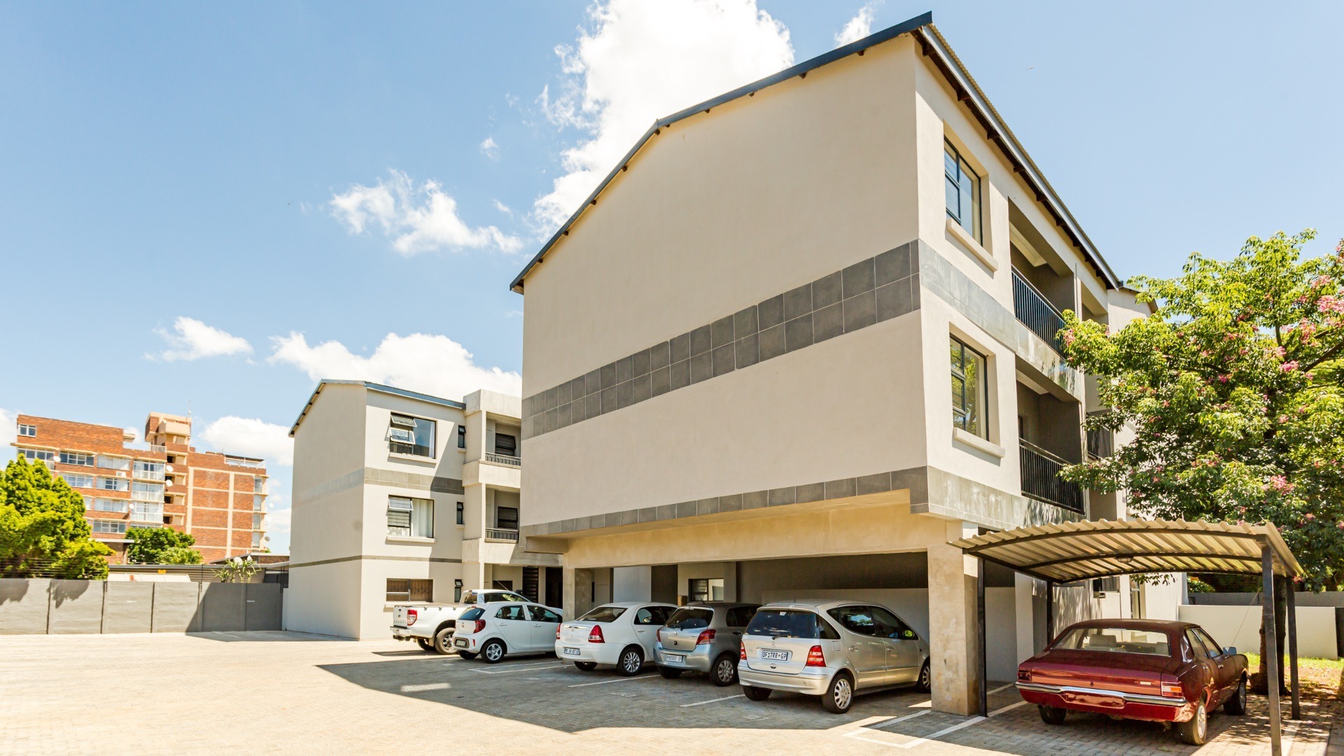 This modern 2-bedroom, 1-bathroom apartment offers a comfortable and secure living experience within a well-maintained complex. Spanning 64 square meters, the unit features an open-plan layout that seamlessly connects the living areas, creating a spacious feel. The interior boasts clean, neutral walls, crown moulding, and consistent tiled flooring throughout, providing a versatile canvas for personal styling. An entrance hall welcomes residents into this inviting space. The contemporary kitchen is a highlight, equipped with stylish two-tone cabinetry, integrated hob, oven, and extractor fan, complemented by a vibrant red tiled backsplash and a practical double sink. Adjacent to the kitchen, the lounge area benefits from abundant natural light, thanks to large sliding glass doors that open onto a private balcony. This outdoor space offers a pleasant view, perfect for relaxation. Security is a priority in this complex, featuring secure gated access and burglar bars on windows for peace of mind. Residents benefit from one dedicated undercover parking bay. This apartment is ideal for professionals or small families seeking a lock-up-and-go lifestyle in a secure environment. Situated in Pretoria North, this property offers convenient access to local amenities and transport routes, making it a practical choice for urban living. The complex provides a secure and modern setting, ensuring a comfortable residential experience in this established Pretoria suburb.